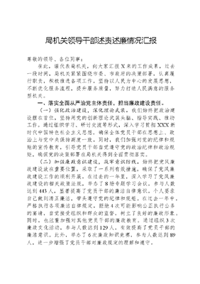 局机关领导干部述责述廉情况汇报尊敬的领导、各位同事:在此,谨代表局机关,向大家汇报X来的工作成果,过去一段时间,局机关紧紧围绕市委、市政府的决策部署,认真履行职责,积极推进各项工作。坚持以人民为中心的发展思想,不断优化服务流程,提升服务质量,努力打造人民满意的服务型机关。一、落实全面从严治党主体责任,担当廉政建设责任。(一)强化政治建设,深化理论武装。我们始终把政治建设摆在首位,坚持用党的创新理论武装头脑、指导实践、推动工作。通过组织学习、研讨交流等形式,深入学习贯彻XXX新时代中国特色社会主义思想,确保全体党员干部在思想上、政治上与党中央保持高度一致。同时,我们加强对党的纪律和规矩的宣传教育,引导党员干部自觉遵守党的政治纪律和政治规矩,确保党的决策部署在局机关得到全面贯彻落实。(二)加强廉政意识建设,筑牢意识防线。始终把党风廉政建设放在重要位置,采取了一系列有效措施,确保了党风廉政建设工作的顺利开展。在过去的一年里,深入学习了党风廉政建设的相关政策法规,举办了8场专题学习会议,参与人数达到443人,显著提高了党员干部的廉洁自律意识。个人要求自己做到清正廉洁,带头遵守党的纪律和规矩。在过去一年中,严格执行各项廉洁自律规定,拒绝4次可能影响公正执行公务的宴请,自觉接受组织和群众的监督,树立了良好的廉政形象。同时,也注重加强对其他党员干部的廉政教育。通过组织3次廉政文化活动,参与人数达到129人,有效提高了党员干部的廉洁意识。此外,举办了6次廉政知识竞赛,参与人数达到89人,进一步增强了党员干部对廉政规定的理解和遵守。(三)强化党的组织建设,推进全面从严治党。在局党组的统一领导下,积极推进党的组织建设,取得了显著成效。成功完善了党组织机构,实现了党的组织覆盖和工作覆盖,确保党的各项工作得到有效落实。同时,加强了党员干部的培训和教育,举办了3期党员干部培训班,参训人数达到91人次,显著提高了他们的政治素质和工作能力。注重加强党风廉政建设,推动全面从严治党向纵深发展。严格执行党风廉政建设责任制,加强了对党员干部的日常管理和监督,确保了党员干部廉洁从政。同时,加大了对违纪违法行为的查处力度,全年共查处违纪违法案件5起,涉及党员干部63人,有效维护了党的纪律和形象。(四)强化党风廉政建设,做好制度规范。制定并实施了3项廉政制度,涉及财务审批、干部选拔任用等多个方面。这些制度明确了各项工作的程序和标准,为党风廉政建设工作提供了有力的制度保障。同时,注重加强制度的执行和监督,确保各项制度得到有效落实。在过去一年中,共开展了5次制度执行情况检查,发现并整改了13个问题,确保了党风廉政建设工作的顺利开展。二、 严明党纪纪律为纲,维护党组织的纯洁性(一)遵守党的纪律情况。严格执行党的政治纪律,在思想上政治上行动上同党中央保持高度一致,落实上级决策部署不打折扣、不搞变通。严格执行党的组织纪律。带头落实双重组织生活制度,全年坚持以普通党员身份参加所在支部组织生活X次,自觉接受党组织和党员群众监督。严格执行民主集中制,对分管范围内三重一大事项和涉及大额资金项目、年度经费管理等重大问题,严格执行请示报告制度,上党组会议决后执行。严格执行党的廉洁纪律,不滥用职权、谋求私利的行为。严格执行党的群众纪律,以人民为中心,无侵犯群众利益的行为。严格执行党的工作纪律,严格工作程序,严守规章制度,主动担当作为。严格执行党的生活纪律,遵守社会公序文可居文库——海量学习资料,手机电脑均可下载www.wenkeju.com良俗,培养高尚道德情操,做良好社会风气的引领者。注重提升思想道德境界,自觉培养良好的生活习惯和积极向上的兴趣爱好。(二)带头转变作风情况。严格执行中央八项规定和省市有关规定,进一步加强和改进作风。厉行节约,落实光盘行动,坚决杜绝舌尖上的浪费。没有公车私用情况;办公用房由机关统一安排,无超标情况。无公款个人消费和职务消费情况。没有因公因私出国。主动深入基层、密切联系群众,摸排掌握情况。(三)廉洁自律情况。自觉遵守《中国共产党廉洁自律准则》,从未参加与工作有关的可能影响公正执行公务的旅游、娱乐、健身、宴请等活动。严格按照要求报告个人重大事项,配偶和其他亲属均没有在自己管辖的业务范围内从业或经商。不存在利用地方名贵特产谋取私利情况。严格执行出国(境)管理办法、个人重大事项报告制度、外出报备及请休假等制度,按期如实填报个人重大事项报告。(三)加强党风廉政建设责任制的落实情况。在党风廉政建设工作中,始终坚持以责任制为抓手,确保各项任务得到有效落实。制定了详细的党风廉政建设责任清单,将责任明确到岗、到人,确保每个党员干部都清楚自己的职责和任务。同时,建立了责任追究机制,对在党风廉政建设工作中失职失责的干部进行严肃处理,形成了良好的责任导向。在推进党风