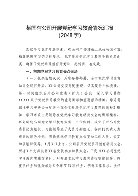 某国有公司开展党纪学习教育情况汇报(2048字)党纪学习教育开展以来,XX公司严格遵循上级的决策布置,精准把握学习的目标要求,扎实推动党纪学习教育不断走深走实,确保了党纪学习教育开好局、起好步、有成效。一、前期党纪学习教育亮点做法(一)提高思想认识,周密安排部署。全市党纪学习教育动员会议召开后,XX公司党委高度重视,认真履行主体责任,第一时间组织召开公司党委(扩大)会议,深入学习贯彻XXXXXX关于党纪学习教育的重要讲话和重要指示精神,学习贯彻《中共中央办公厅关于在全党开展党纪学习教育的通知》精神,学习市委主要领导在党纪学习教育动员大会的讲话精神,研究制定公司党纪学习教育方案、工作安排,成立了以公司党委书记为组长、其他领导班子成员为副组长、各部门负责人为成员的领导小组。明确党纪学习教育办公室和工作人员,切实加强组织领导。X月X日上午,公司召开党纪学习教育动员大会,所辖X个支部共计XX名党员参加动员大会,下发《XX公司党纪学习教育实施方案》,对开展党纪学习教育进行安排部署,将重点任务细化分解为X个环节XX项任务,明确工作要求、责任部门和时间进度,确保党纪学习教育扎实有效推进。(二)高标准推进,高质量落实。一是领导干部带头,先学一步。发挥领导干部头雁效应,先学一步,深学一层。X月X日至X日,举办第一期党纪学习教育读书班,公司中层以上党员干部共XX人参加,通过集中学习、专题辅导、观看警示教育片、交流研讨等多种形式展开。带动全体党员干部原原本本学、逐章逐条学、前后对照学,进一步加深了对《条例》的理解掌握,坚定了学纪、知纪、明纪、守纪的政治自觉、思想自觉和行动自觉。二是注重督促指导,提高学教效果。为确保党纪学习教育高质量起步、高标准推进,公司组建了党纪学习教育工作专班,负责党纪学习教育日常工作,建立对下辖各党支部学习教育一周一提醒、半月一调度、一月一总结工作机制,制定工作提示单,对各各党支部党纪学习教育前期筹备、安排部署、集中学习情况等,已完成X轮次指导,确保了全公司党纪学习教育有序开展。(三)丰富学习载体,确保取得实效。一是扎实抓好学习。坚持把党纪学习作为必修课,并与主题党日、三会一课等紧密结合,组织党员干部逐章逐条学、联系实际学,以学深悟透为重点,不走过场、不搞形式、不做样子。目前公司党委层面已开展理论学习中心组专题交流研讨X期、专题读书文可居文库——海量学习资料,手机电脑均可下载www.wenkeju.com班X期。下属各党支部组织开展党员开展集中学习X次,通过多样化学习帮助党员干部更加深入、更加透彻、更加准确掌握六大纪律的主旨要义和规定要求。二是组织集中警示教育。XX日至XX日,分X批组织XX名党员干部到市廉政教育中心开展集中警示教育活动。用反面教材、直观的教育形式,警示党员干部牢记血的教训,时刻绷紧反腐倡廉这根弦,筑牢反腐防线,时刻以党的宗旨严格要求自己,永葆廉洁本色。三是开展专题辅导。X月X日,邀请市委党校XX老师作专题辅导授课,为党员干部解读《中国共产党纪律处分条例》。对《条例》修订的背景和重大意义进行了深刻阐述,对其重点内容进行深入解析,帮助大家对《条例》的丰富内涵和实践要求有了更为全面、深刻的理解。四是以学促干,知行合一。坚持党纪学习教育着眼主责、紧扣主业,把学习和工作、教育和实践统一起来,将所学、所思、所悟转化为干事创业、争先创优的强大动力。通过党纪学习教育的开展,全体党员干部进一步强化了政治规矩、纪律观念,增强了规矩意识,党员干部通过对照剖析,边学边改,生活作风和工作作风都得到进一步加强。二、存在主要问题和不足一是部分党员干部对党纪学习教育重要性认识不够。个别党员学习积极性仍然不高,有被动应付情况,学习效果打折扣,文可居文库——海量学习资料,手机电脑均可下载www.wenkeju.com没有真正入脑入心。二是部分支部组织学习不够得力,只求完成基本任务,传达文件照本宣科,学习形式相对单一;组织党员集中学习时缺勤人数较多,学习制度落实不好。三是对离退休党员送学上门不到位,安排不及时,考虑不全面,公司党委监督指导不到位,需及时纠正。三、下一步主要打算一是继续扎实开展好党纪学习教育。加强督促指导,采取个人自学、集中研讨、专题辅导等多种方式,组织党员干部认真学习XXXXXX关于党的纪律建设重要论述,深化《条例》理解运用;抓好警示教育,剖析身边违纪典型案例,注重用身边事教育身边人,真正让党纪学习教育成为党员干部增强纪律意识,提高党性修养的有效渠道。二是切实加强党的自身建设。进一步健全完善党的建设各项制度,不断强化不能腐的制度约束。认真分析研判发生问题背后的深层次原因和风险隐患,对存在的问题和薄弱环节有针对性地进行深入整改,推进相关制度完善,促进形成管人、管事、管权的全覆盖长效机制