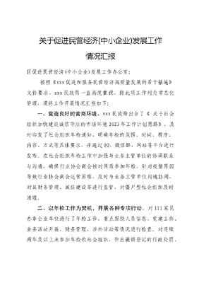 关于促进民营经济(中小企业)发展工作情况汇报区促进民营经济(中小企业)发展工作办公室: 按照《xxx促进和服务民营经济高质量发展的若干措施》文件要求,xxx民政局一直高度重视,将此项工作列为常态化管理,现将工作开展情况汇报如下:一、营造良好的营商环境。xxx民政局出台了《 关于社会组织加快建设诚信守法的市场环境2023年工作计划思路》,及时印发了社会组织年检通知,明确年检的范围、时间、程序、内容、方式等具体要求,并通过QQ、微信群、网站等平台进行发布。在社会组织年检工作中加强与业务主管单位的协调联系与沟通,确保行业协会商会按时保质参加年检,针对疫情原因导致行业协会商会运营困难,及时与业务主管单位沟通协调,对其财务管理、诚信建设等进行监管,对僵尸型社会组织及时清理。二、以年检工作为契机,开展各种专项行动。对111家民办非企业单位进行了年检工作,重点围绕人员信息、党建工作、业务活动开展、财务管理、涉外活动等情况进行检查。对连续两年及以上未参加年检的社会组织,作出撤销登记的行政处罚,目前已撤销x家民办非企业单位。开展非法社会组织全面排查工作。xxx民政局印发了2023年《关于开展非法社会组织全面排查工作的通知》,并按照通知要求,按照通知部署镇(街道)及相关业务主管单位履行监管职责,对自己主管的社会组织进行全面排查,及时甄别自己主管的、辖区内的社会组织有无与疑似非法社会组织合作。目前未发现非法社会组织情况。整治行业协会商会乱收费专项治理工作。xxx民政局印发了《xxx行业协会商会涉企违规收费专项治理行动实施方案》,对行业协会商会的会费、经营服务性收费、行政事业性收费方面进行了检查。目前未发现乱收费现象出现。三、下一步工作计划。一如既往持续常态化开展促进民营经济(中小企业)发展工作,定期开展各项专项行动,营造良好的营商环境,推进民办非企业单位健康有序发展。 xxx民政局 2023年8月22日文可居文库——海量学习资料,手机电脑均可下载www.wenkeju.com