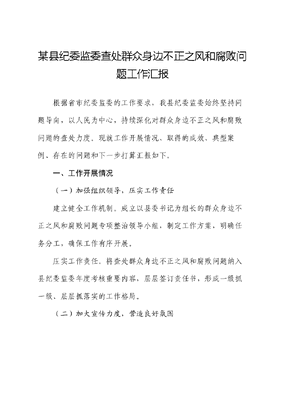 某县纪委监委查处群众身边不正之风和腐败问题工作汇报根据省市纪委监委的工作要求,我县纪委监委始终坚持问题导向,以人民为中心,持续深化对群众身边不正之风和腐败问题的查处力度。现就工作开展情况、取得的成效、典型案例、存在的问题和下一步打算汇报如下。一、工作开展情况(一)加强组织领导,压实工作责任建立健全工作机制。成立以县委书记为组长的群众身边不正之风和腐败问题专项整治领导小组,制定工作方案,明确任务分工,确保工作有序开展。压实工作责任。将查处群众身边不正之风和腐败问题纳入县纪委监委年度考核重要内容,层层签订责任书,形成一级抓一级、层层抓落实的工作格局。(二)加大宣传力度,营造良好氛围开展多形式宣传。通过电视、广播、报纸、网络等媒体,广泛宣传查处群众身边不正之风和腐败问题的政策法规、典型案例和成效经验,提高群众知晓率和参与度。深入基层宣讲。组织纪检监察干部深入乡镇、村(社区)开展宣讲活动,面对面解答群众疑问,收集问题线索,引导群众积极参与监督。(三)拓宽线索渠道,强化监督检查建立健全线索收集机制。设立举报箱、开通举报电话和网络举报平台,广泛收集群众身边的不正之风和腐败问题线索。加大监督检查力度。对重点领域、重点部门、重点岗位进行定期或不定期的监督检查,发现问题及时查处。(四)严肃执纪问责,形成高压态势严查违纪违法行为。对收集到的线索进行认真核查,对查实的违纪违法行为依纪依法严肃处理,形成有力震慑。强化责任追究。对在查处群众身边不正之风和腐败问题中失职失责的党组织和党员干部进行严肃问责,推动责任落实。(五)注重标本兼治,构建长效机制文可居文库——海量学习资料,手机电脑均可下载www.wenkeju.com深化制度建设。针对发现的问题,制定或完善相关规章制度,堵塞制度漏洞,防止问题反复发生。加强廉政教育。通过举办培训班、讲座等形式,加强对党员干部的廉政教育和警示教育,提高廉洁自律意识。二、工作成效(一)查处案件数量今年以来,我县纪委监委共查处群众身边不正之风和腐败问题案件X起,涉及金额X万元,给予党纪政务处分X人,其中科级干部X人,一般干部X人,农村党员干部X人。通过查处这些案件,有力地打击了腐败分子的嚣张气焰,维护了群众的合法权益。(二)解决了一批突出问题通过查处案件,有效解决了诸如扶贫领域优亲厚友、虚报冒领,民生领域吃拿卡要、截留挪用等突出问题,让群众切实感受到正风肃纪带来的变化。(三)形成了有力震慑文可居文库——海量学习资料,手机电脑均可下载www.wenkeju.com一系列案件的查处和曝光,在全县范围内形成了强大的震慑效应,让广大党员干部深刻认识到党纪国法不可触碰,增强了廉洁自律意识。(四)提升了群众满意度随着不正之风和腐败问题的逐步解决,群众对党风廉政建设和反腐败工作的满意度不断提升,进一步密切了党群干群关系。三、典型案例(一)某村主任利用职务之便贪污某项目资金案某村主任在负责本村某项目申报、实施过程中,利用职务之便,采取虚报冒领、截留私分等手段,贪污某项目资金XX余万元。县纪委监委在接到群众举报后,迅速展开调查,查明了该村主任的违纪违法行为。(二)某乡镇卫生院院长套取新农合资金案某乡镇卫生院院长在新农合资金管理过程中,采取虚构报销名单、虚增报销金额等手段,套取新农合资金XX余万元。县文可居文库——海量学习资料,手机电脑均可下载www.wenkeju.com纪委监委在接到群众举报后,立即成立专案组进行调查,查明了该卫生院院长的违纪违法行为。(三)某县教育局副局长违规安排子女就业案某县教育局副局长利用职务之便,违规安排自己的子女进入县教育局下属单位工作。县纪委监委在日常监督中发现这一问题,迅速展开调查,查明了该副局长的违纪行为。经审理,决定给予该副局长党内严重警告、政务记大过处分,并免去其副局长职务。以上案例反映出县纪委监委在查处群众身边不正之风和腐败问题方面,始终坚持有案必查、有腐必反、有贪必肃,严肃查处了一批侵害群众利益的突出问题,维护了群众切身利益,增强了群众的获得感、幸福感和安全感。四、存在的问题与不足(一)部分党员干部思想认识不到位,对查处群众身边不正之风和腐败问题的重要性认识不足。(二)部分领域制度不完善,存在监管漏洞和制度空白。文可居文库——海量学习资料,手机电脑均可下载www.wenkeju.com(三)部分纪检监察干部业务能力不强,对政策法规掌握不够熟练,影响了查处工作的效率和质量。五、下一步工作打算(一)加强思想教育,提高党员干部认识。通过举办培训班、开展廉政文化进机关等活动,加强对党员干部的思想教育和廉政教育,提高其对查处群众身边不正之风和腐败问题重要性的认识。(二)完善制度建设,堵塞监管漏洞。针对发现的问题和漏洞,制定或完善相关规章制度,加强制度建设和监管力