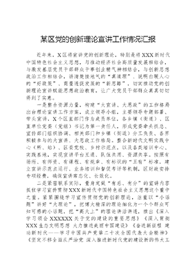 某区党的创新理论宣讲工作情况汇报近年来,X区将宣讲党的创新理论,特别是将XXX新时代中国特色社会主义思想,与推动经济社会高质量发展相结合,与激发基层党员干部群众干事创业精气神相结合,与创新思想政治工作相结合,讲清楚接地气的真道理、说明白暖人心的好政策、商量透促发展的新思路,切实推动党的创新理论宣讲赋能思想政治教育,让广大党员干部群众真真切切得到了实惠。一是整合资源力量,构建大宣讲、大思政的工作格局出台理论宣讲工作方案,成立领导小组,主要领导专题部署、带头宣讲,X个区直部门作为成员单位,各乡镇(街道)、区直单位党委(党组)书记为第一责任人,形成党委牵头抓总、宣传部门组织协调、相关部门和乡镇(街道)分工负责、各界积极参与的大宣讲、大思政工作格局。整合新时代文明实践中心(所、站)、区委党校、乡村示范点,以及各类培训中心、实践基地,实现宣讲平台互通、队伍共用、资源共享。按照有场所、有师资、有课程、有规章、有标识的五有标准,建立宣讲示范点运行、业务培训和督促考评等机制,区财政安排专项经费,确保宣讲常态化、长效化。二是紧密联系实际,量身定做有总、有分的宣讲内容抓住学习宣传贯彻XXX新时代中国特色社会主义思想这个重中之重。紧紧围绕学习宣传贯彻党的创新理论,注重以小话题讲好大理论,把博大精深的理论细化为一个个群众可知可感的小话题,把高大上的理论讲活讲透,推出《深入学习领会XXXXXX关于党的建设的重要思想》《深入贯彻XXX生态文明思想 大力推进美丽中国建设》《奋进新征程 建功新时代——学习中国共产党第二十次全国代表大会精神》《坚定不移全面从严治党 深入推进新时代党的建设新的伟大工程》等专题课程;从小切口入手、用小故事阐释,策划基层治理、乡村振兴、生态文明、特色产业、文化传承等系列课程。注重以小故事讲活大道理,把群众身边的感人事迹、先进模范、身边榜样作为诠释党的创新理论的生动素材、经典案例,让抽象的理论变得生动形象、鲜活直观。注重以小视角讲透大主题,善于从宏观理论视野中,寻找与普通百姓息息相关的切入点,把大水漫灌转化为精准滴灌,让党的创新理论既入耳入脑又入心入魂。把握关注干部党员群众需求这个关键。宣讲团成员在一次次宣讲实践中把握党员干部理论学习需求,及时推出《X民事直说1234工作法助推乡村治理的实践和启示》《基层党员干部心理健康教育》等课程;在一次次走访中摸清群众生产生活需求,形成一份份课程清单,精准设计生态环境保护、文旅融合发展、花椒油橄榄栽培、移风易俗、看病就医、养老育幼、预防网络诈骗等一批小而精的宣讲课程。三是吸纳各类人才,组建专兼结合的宣讲队伍。领导干部示范讲。区委、区政府主要领导带头落实领导干部上讲台制度,在全区科级领导干部和村(社区)党支部书记专题培训班上作专题辅导,示范带动理论宣讲工作。理论骨干课堂讲。将各级党政机关单位的理论专家、宣讲骨干、青年宣讲员纳入理论宣讲人才库,常态化开展理论宣讲活动。乡土能人实地讲。在行业部门骨干、大学生村官、选调生和乡村干部中遴选一批基层经验丰富的讲师,从优秀乡贤、返乡创业人员、致富带头人、产业大户中挑选一批能说会道的土专家,依托文化广场、纳凉亭、农家小院这些家门口阵地,采取夜谈、漫谈等形式宣传党的政策,倾听群众心声,共议民生大事,增进思想共识。教授学者线上讲。根据基层干部群众对基层治理和乡村振兴等方面的需求,邀请省委党校相关教授学者充实宣讲师资库,结合工作实际有针对性地开展线上宣讲。文可居文库——海量学习资料,手机电脑均可下载www.wenkeju.com四是创新方式方法,探索接地气、多元化的宣讲模式用好浓浓乡音。深入乡村社区,注重用乡音传递党的声音,用本地方言宣讲党的方针政策,让高大上的理论变得接地气、通俗化。探索实地体验。把理论课堂搬进革命历史纪念馆、田间地头,让干部群众通过情景互动式、沉浸体验式宣讲,学习党的创新理论,感悟武都革命历史文化底蕴。创新1+X宣讲模式。推出的音乐思政课以XXX新时代中国特色社会主义思想为指引,通过音乐艺术表演,将理论宣讲与合唱、舞蹈、诗朗诵等艺术形式结合,用视听唱悟+教育洗礼的方式将党的创新理论成果传递给党员干部群众,重温党的光荣传统和优良作风,不断增强广大党员干部听党话、感党恩、跟党走的思想自觉、政治自觉和行动自觉,既讲出了温度又演出了热度。阔步新时代新征程,X区将不断把学习贯彻XXX新时代中国特色社会主义思想引向深入,坚持人民群众在哪里,党的声音就要传播到哪里的理念,围绕乡村振兴、基层治理等人民群众关心关注的事项,不断开展形式多样、深入人心、落地见效的宣讲活动。接下来,X区将培育一批优秀宣讲骨干,规划一批基层宣讲阵地,