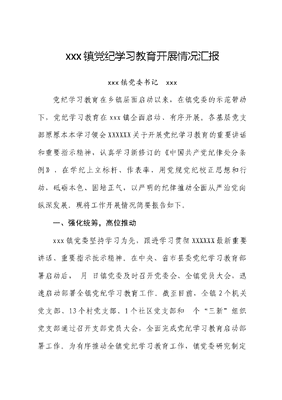 xxx镇党纪学习教育开展情况汇报xxx镇党委书记xxx党纪学习教育在乡镇层面启动以来,在镇党委的示范带动下,党纪学习教育在xxx镇全面启动、有序开展。各基层党支部原原本本学习领会XXXXXX关于开展党纪学习教育的重要讲话和重要指示精神,认真学习新修订的《中国共产党纪律处分条例》,在学纪上立标杆、作表率,用党规党纪校正思想和行动,砥砺本色、固培正气,以严明的纪律推动全面从严治党向纵深发展。现将工作开展情况简要报告如下。一、强化统筹,高位推动xxx镇党委坚持学习为先,跟进学习贯彻XXXXXX最新重要讲话、重要指示批示精神。在中央、省市县委党纪学习教育部署启动后, 月 日镇党委及时召开党委会、全镇党员大会,迅速启动部署全镇党纪学习教育工作。截至目前,全镇2个机关党支部、13个村党支部、1个社区党支部和个三新组织党支部通过召开支部党员大会,全面完成党纪学习教育启动部署工作。为有序推动全镇党纪学习教育工作,镇党委研究制定了《的实施方案》,明确总体要求、主要任务、时间安排、组织保障,重点结合实际,通过抓实理论学习、警示教育等关键环节、重点举措,对党纪学习教育任务进行再细化再明确再落实,确保各项工作有序推进、见行见效。探索建立一位领导干部、一名工作人员、一个党支部三个一对接包联机制,安排11名镇级领导干部联系指导13个村、1个社区党支部,个三新组织党支部。推行党委带头学、党支部组织学、党员自主学三级抓学习机制,团结带领全镇61名机关党员、60名村两委干部、1千余名普通党员深入党纪理论学习,在以学正风以学促干上下真功、求实效。二、学深悟透,入心入脑xxx镇党委教育引导各党支部深刻认识开展党纪学习教育的重要性和目标要求,准确把握六项纪律的主旨要义和规定要求,切实做到学纪、知纪、明纪、守纪,推动党的纪律建设最新成果入脑入心,使党纪学习教育每项措施都成为推动产业经济发展、森林草原防灭火、农村人居环境治理等近期重点工作落实的有效举措。文可居文库——海量学习资料,手机电脑均可下载www.wenkeju.com镇党委班子成员先学一步,学深一层,带动各基层党支部跟进学习XXXXXX关于党纪学习教育的重要讲话和重要指示精神,原原本本、逐章逐条学习新修订《条例》。组织各党支部制定学习计划,采取个人自学、集中学习、研讨交流、结对帮学等多种方式开展党纪学习教育。目前,镇党委通过党委会第一议题、理论学习中心组、木兰课堂等形式开展集中学习研讨次。各党支部通过三会一课、主题党日等形式开展专题学习余次,通过结对帮学、送学上门等形式,组织老弱党员学习余人次,通过党员微夜校组织流动党员学习余人次,累计发放纸质版学习资料1100余册。5月11日,xxx镇组织各基层党支部在全镇范围内开展纪法在心·清风同行主题党日活动,各党支部书记带领支部党员干部原原本本学习《中国共产党纪律处分条例》,组织集中观看《党纪这样学》《一起学<条例>》等党纪学习教育微课堂,以简明易懂的形式,生动的为党员干部梳理了《条例》修订的历史沿革,逐条细致讲解了具体内容,帮助党员干部准确掌握《条例》主旨要义和规定要求,组织参会党员结合学习文可居文库——海量学习资料,手机电脑均可下载www.wenkeju.com体会,谈感触、讲打算,进一步深化了对加强党的纪律建设重要性和忽视党纪、违反党纪问题危害性的认识,达到了统一思想认识、凝聚智慧力量、鼓舞干劲斗志的目的。三、靶向发力,分类推动xxx镇党委始终聚焦党纪学习教育难点,坚持精准施策、分层指导,确保学有质量、学出成效。一是分类制定清单。结合村、社区、三新组织党支部不同情况,分类制定印发工作提示,明确启动部署相关要求,逐项细化工作任务,明确工作内容、目标要求和时间节点,实现工作任务精准化落实。二是常态化督促指导。通过线上调度、实地指导等方式,为基层党支部教方法、提要求,督促指导各基层党支部制定完善党纪学习教育工作计划,明确包村干部负责、定期对包联党支部党纪学习教育工作开展情况进行全覆盖、全过程指导,确保党纪学习教育精准对标、走深走实。三是强化宣传引导。充分依托xx融媒、xx组工等县级媒体专栏,用好学习强国、xx干部网络学院等各类学习平台,及时组织学习各级权威媒体发布的《条例》解读文章、网络课程,并文可居文库——海量学习资料,手机电脑均可下载www.wenkeju.com对推动党纪学习教育过程中的好经验好做法和进展成效进行总结提炼宣传。同时,把开展党纪学习教育与持续整治形式主义为基层减负相结合,不对写读书笔记、心得体会等作硬性要求,不搞不必要的形式创新,不随意增加自选动作。当前,xxx镇正在以党纪学习教育为契机,全党上下坚持以铁的纪律凝聚意志、锤炼作风、锻造队伍,