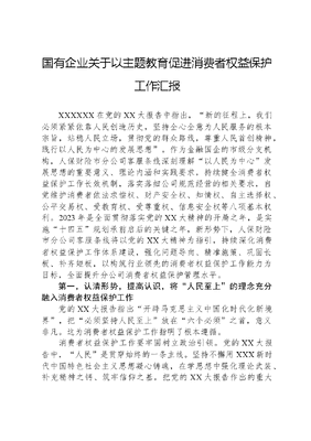 国有企业关于以主题教育促进消费者权益保护工作汇报XXXXXX在党的XX大报告中指出,新的征程上,我们必须紧紧依靠人民创造历史,坚持全心全意为人民服务的根本宗旨,站稳人民立场,贯彻党的群众路线,尊重人民首创精神,践行以人民为中心的发展思想。作为金融国企的市级分支机构,人保财险市分公司客服条线深刻理解以人民为中心发展思想的重要意义、理论内涵和实践要求,持续健全消费者权益保护工作长效机制,落实落细公司规范经营的相关要求,自觉维护消费者依法求偿权、财产安全权、知情权、自主选择权、公平交易权、受教育权、受尊重权、信息安全权等八项基本权利。2023年是全面贯彻落实党的XX大精神的开局之年,是实施十四五规划承前启后的关键之年,新形势下,人保财险市分公司客服条线将以党的XX大精神为指引,持续深化消费者权益保护工作体系建设,强化问题导向、精准施策、巩固长板、补齐短板,以构筑行业领先的消费者权益保护工作能力为目标,全面提升分公司消费者权益保护管理水平。第一,认清形势,提高认识,将人民至上的理念充分融入消费者权益保护工作党的XX大报告指出开辟马克思主义中国化时代化新境界,把必须坚持人民至上放在六个必须之首,意义非凡。这为消费者权益保护工作指明了根本遵循。消费者权益保护工作要牢固树立政治引领。党的XX大报告中,人民是贯穿始终的一条主线。坚持不懈用XXX新时代中国特色社会主义思想凝心铸魂,在学思想中强化理论武装、补充精神之钙、筑牢信仰之基,把党的XX大报告作出的重大决策部署付诸行动、见之于成效,全面推进主题教育在消费者权益保护工作中走深走实。消费者权益保护工作事关民生福祉、事关社会大局和谐稳定,既是重大政治责任,也是重要民生工程,要从政治上考量,在大局下行动,要始终坚持人民至上,全心全意为人民服务,始终站稳人民立场。要时刻以人民为中心,牢牢把握消费者权益保护工作的政治性、人民性,始终将维护好、实现好、发展好保险消费者的合法权益作为工作的出发点和落脚点。消费者权益保护工作要始终站稳人民立场。新时代新征程中国共产党的使命任务,强调在前进道路上,必须牢牢把握五个坚持重大原则,其中坚持以人民为中心的发展思想,揭示了必须坚持人民至上的思想基础。消费者权益保护工作,要顺应人民群众对美好生活的向往,坚持问题导向和系统观念,始终站稳人民立场,把握人民愿望,尊重人民创造,把保险为民的本质要求融入消费者权益保护工作,筑牢思想根基。消费者权益保护工作要切实保护人民利益。消费者权益保护工作是贯彻以人民为中心发展思想的集中体现,要积极践行中国人民保险的政治性、人民性,紧紧抓住人民最关心最直接最现实的利益问题,不断推动公司高质量发展,实现人民对美好生活的向往。通过开展消费者权益保护投诉治理,做好投诉前置化解、分级管理,畅通投诉渠道、提高处理效率,提升投诉首站化解,做好客户安抚及妥善处置,在公司消费者权益保护工作委员会架构的基础上,不断健全消费者权益保护投诉工作协调配合机制,充分发挥公司行业引领、金融国企的示范作用。以务实、落实、做实的工作态度,积极推进消费者权益保护投诉工作,规范、合规投诉处理。助推人民群众获得感、幸福感、安全感的扩容充实,切实保护人民切身利益。消费者权益保护工作要充分展现责任担当。近年来,监管机构高度重视消费者权益保护工作。国家金融监督管理总局(原中国银保监会)制定发布《银行保险机构消费者权益保护管理办法》,并于2023年3月1日起正式施行,该管理办法中明确指出银行保险机构需要切实承担起保护消费者合法权益的主体责任。2023年6月2日,国家金融监督管理总局1号文发布《关于金融消费者反映事项办理工作安排的公告》(2023年第1号),这是国家金融监督管理总局5月18日挂牌以来发布的第一份公告,凸显了国家金融监督管理总局挂牌后的首要工作之一,就是保护好消费者的合法权益。消费者权益保护工作要严格落实党的XX大精神关于推进依法行政的有关要求,深刻领悟国家金融监督管理总局关于保护消费者合法权益的工作要领,不断完善消费者权益保护监管体制机制,畅通消费者诉求反映渠道,推进完善保险纠纷多元化解机制建设,切实保护消费者的合法权益。始终将人民对美好生活的向往作为努力的方向,将矛盾纠纷化解在基层、化解在萌芽状态,切实承担起金融国企消费者权益保护工作的主体责任。第二,锐意进取,凝心铸魂,将消费者权益保护工作纳入公司治理全局党的XX大报告指出:我们要实现好、维护好、发展好最广大人民的根本利益,紧紧抓住人民最关心最直接最现实的利益问题,坚持尽力而为、量力而行,深入群众、深入基层,采取更多惠民生、暖民心举措,着力解决好人民群众急难愁盼问题。市分公司客服条线始终把学习贯彻党的XX大精神作为首要政治任务,引领干部员工在三个全面上下功夫