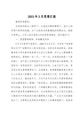 2023年3月思想汇报敬爱的党组织:在党组织的关心指导下,在身边同事的帮助下,我个人的思想不断得到提高,为了让组织及时掌握我的思想状态,我将从思想上、工作上来汇报我3月份的思想情况,现汇报如下:一、重温雷锋精神,争做模范先锋3月5日是学习雷锋日,1963年3月5日,毛泽东向雷锋同志学习的题词在人民日报发表,该纪念日由此而来。雷锋精神是中华民族传统美德与社会主义精神、共产主义精神最完美的结合,雷锋的一言一行,一举一动,所表现出的是一个革命战士、共产党人为实现共产主义伟大理想而奋斗的精神。而我作为一名预备党员,也利用空余时间,让自己沉下心来,真正的去体会雷锋精神含义。在我看来,雷锋精神就是要让我们全心全意为人民服务,要让自己时刻忠于人民、忠于国家、忠于社会主义。就在前不久,习近平总书记对深入开展学雷锋活动作出重要指示,强调:新征程上,要深刻把握雷锋精神的时代内涵,更好发挥党员、干部模范带头作用,让雷锋精神在新时代绽放更加璀璨的光芒,为全面建设社会主义现代化国家、全面推进中华民族伟大复兴凝聚强大力量。在总书记的重要指示下,在雷锋式先进集体和模范个人的事迹感染下,我深刻明白作为党员要时时刻刻以做一枚螺丝钉的态度,立足岗位,锤炼本领,不断激发爱党爱国爱社会主义巨大热情,让及更加坚定拥护两个确立、坚决做到两个维护,自觉把个人追求融入为党和人民事业奋斗中,为中国式现代化建设添砖加瓦。二、锤炼真本领,奋斗新时代新时代、新征程、新面貌。作为一名年轻的党员干部,则更应该把握好机会,同时也要面对好挑战。习近平总书记在XX大报告中强调广大青年要坚定不移听党话、跟党走,怀抱梦想又脚踏实地,敢想敢为又善作善成,立志做有理想、敢担当、能吃苦、肯奋斗的新时代好青年。对于我来说在工作中是机遇与挑战并存,不管面对什么工作,我首先做到的就是坚定理想信念,补足精神之钙。没有远大理想,不是合格的共产党员;离开现实工作而空谈远大理想,也不是合格的共产党员。因此我在工作中不断学习,通过读原著、学原文、悟原理,全面学习习近平新时代中国特色社会主义思想,做到知行合一,在思想上、行动上和党组织保持一致;其次是直面困难,勇于担当。有时在工作中会存在等一等、放一放的思想,我也深知中华民族伟大复兴,绝不是轻轻松松、敲锣打鼓就能实现的,因此更需要我们敢于挑战、敢于担当,以不怕苦、不怕累的精神去面对岗位上的各种难题,在挑战中不断创新,从而练就一身本领;最后就是要牢记初心使命。习总书记也说过忘记初心和使命,我们党就会改变性质、改变颜色,就会失去人民、失去未来。为人民服务的宗旨要铭记于心,就如雷锋精神一样,60年来雷锋的名字家喻户晓,雷锋精神代代相传,身边涌现出许许多多的活雷锋。作为一名预备党员,铭记习近平总书记扎根人民,奉献国家的嘱托,主动投身于乡村振兴一线、科技创新前沿,以实际行动投身于华民族伟大复兴的中国梦中。同时,我在平时的思想、工作中也不断加强自身廉洁建设坚持认真学习《中国共产党纪律处分条例》《中国共产党问责工作条例》等党纪党规,切实扎牢明纪律、守底线意识。始终坚持严守党的纪律规矩,牢固树立底线思维,恪守廉洁底线,把纪律和规矩挺在前面。自觉遵守中央八项规定,强化责任担当,廉洁修身。我也深知我距离一名合格党员还有一定的差距,我也希望党组织在之后的工作中继续考验我、监督我、帮助我,同时,我也一定以更高的标准严格要求自己,争取以优异成绩向党组织汇报,在下一步工作中,本人也将继续加强学习,努力做好相关工作,不断提高自己的政治思想水平,更加严格约束自己的一言一行,一举一动,做一名忠诚、干净、担当的好党员、好干部。以勤奋务实、开拓进取的工作态度,为单位的建设和发展贡献自己的微薄之力。