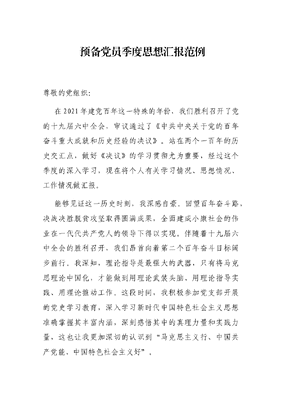 预备党员季度思想汇报范例尊敬的党组织:在2021年建党百年这一特殊的年份,我们胜利召开了党的十九届六中全会,审议通过了《中共中央关于党的百年奋斗重大成就和历史经验的决议》。站在两个一百年的历史交汇点,做好《决议》的学习贯彻尤为重要,经过这个季度的深入学习,现在将个人有关学习情况、思想情况、工作情况做汇报。能够见证这一历史时刻,我深感自豪。回望百年奋斗路,决战决胜脱贫攻坚取得圆满成果,全面建成小康社会的伟业在一代代共产党人的领导下得以实现。伴随着十九届六中全会的胜利召开,我们昂首向着第二个百年奋斗目标阔步前行。我深知,理论指导是最强大的武器,只有将马克思理论中国化,才能做到用理论武装头脑、用理论指导实践、用理论推动工作。这段时间,我积极参加党支部开展的党史学习教育,深入学习新时代中国特色社会主义思想准确掌握其丰富内涵,深刻感悟其中的真理力量和实践力量,这也让我更加深切的认识到马克思主义行、中国共产党能、中国特色社会主义好。能够参与这一历史时刻,我深感光荣。作为最基层支部的一名预备党员,唯有坚定理想信念,时刻牢记入党誓言做到不忘初心、牢记使命,在任何时刻都能做到全心全意为人民服务,唯有如此才能对得起党员这个身份。在这段时间以来,我一直以一名正式的党员严格要求自己,以身边优秀党员为目标提升自己,高质量完成党支部交办的各项任务,扎实开展政治理论学习,为身边的人办好事办实事,得到了党组织和身边党员群众的认可。我也知道,我在很多方面存在着不足。自身仍然比较浮躁,对于政治理论学习依然不够深入。本人在系统思维上仍然不够完善,不能很好的、全面的考虑问题,导致重点抓不住、拎不清,推进工作的系统性补强。以上的这些都是我将来要改进提升的。作为一名青年人,我深知青春有我、强国有我,我相信在党组织的关心关怀下,我会尽快的克服苦难、补齐短板,早日成长为一名优秀的共产党员。以上就是我的思想汇报。