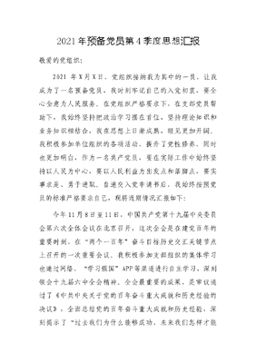 2021年党第预备员4季度思想汇报敬爱的党组织:2021 年X月X日,党组织接纳我为其中的一员,让我成为了一名预备党员,我时刻牢记自己的入党初衷,要全心全意为人民服务。在党组织严格要求下,在支部党员帮助下,我始终坚持把政治学习摆在首位,坚持理论知识和业务知识相结合,我在思想上日渐成熟,眼见更加开阔。我积极参加单位组织的各项活动,提升了党性修养,同时也更加明白,作为一名共产党员,要在实际工作中始终坚持以人民为中心,要以人民利益为出发点和落脚点,要实事求是、勇于进取。自递交入党申请书后,我始终按照党员的标准严格要求自己,现将近期情况汇报如下:今年11月8日至11日,中国共产党第十九届中央委员会第六次全体会议在北京召开,这次全会是在建党百年的重要时刻、在两个一百年奋斗目标历史交汇关键节点上召开的一次重要会议。我积极参加支部组织的集体学习也通过网络、学习强国APP等渠道进行自主学习,深刻领会十九届六中全会精神。全会最重要的成果,是审议通过了《中共中央关于党的百年奋斗重大成就和历史经验的决议》,全面总结党的百年奋斗重大成就和历史经验,深刻揭示了过去我们为什么能够成功、未来我们怎样才能继续成功,体现了我们党重视和善于运用历史规律的高度政治自觉,体现了我们党牢记初心使命、继往开来的自信和担当。通过学习,我深刻地认识到只有中国共产党才能领导中国,从我们党诞生之日起,就把实现共产主义作为党的最高理想和最终目标,义无反顾肩负起实现中华民族伟大复兴的历史使命,是我们党团结带领人民发愤图强、艰苦创业,创造了四个伟大成就,全面建成小康社会,解决绝对贫困问题,实现了从站起来、富起来到强起来的伟大飞跃……伟大成就不是天上掉下来的,更不是别人恩赐施舍的,而是一百年来中国共产党带领中国人民用鲜血、汗水、泪水写就的。党和人民百年奋斗,书写了中华民族几千年历史上最恢宏的史诗。要想实现中华民族的百年梦想和伟大复兴,就必须坚持中国共产党的领导,以习近平新时代中国特色社会主义思想武装头脑。相信,第二个百年奋斗目标在不远的将来一定会实现。践行初心使命要求我们要全心全意为人民服务。我看到穿着厚厚的防护服从早到晚为人民群众做核酸检测的防疫人员,我看到奋战在抗洪救灾第一线的军人,我看到为抢救人民生命、财产而壮烈牺牲的消防人员……他们用实际行动践行初心使命,深深的感动着我,也深深的激励着我。我深刻的明白作为一名共产党员,要以人民为中心,多站在人民群众的角度考虑问题,兢兢业业工作、爱岗敬业,切实解决群众操心事、烦心事、揪心事,为人民群众办好事、办实事、解难事。我知道,要想成为一名真正的共产党员,需要经过长期的磨练,要在学习马克思主义理论的过程中,在建设中国特色社会主义的群众实践中,在严格的党内生活中,一生自觉地经受考验。虽然目前我现在是一名预备党员,距离成为一名正式党员还有一定的差距,但我会更严格的要求自己。青春因奋斗而美丽,人生因奋斗而精彩,在今后的学习、工作、生活中,我会牢记入党誓词,用实际行动践行初心使命。此致敬礼!汇报人:XXX2021年11月X日