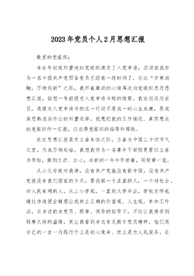 2023年党员个人2月思想汇报敬爱的党组织:在去年初我郑重地向党组织递交了入党申请,应该说我作为一名中国共产党预备党员已经有一段时间了,在这岁寒消融,万物迎新之际,我怀着激动的心情再次向党组织进行思想汇报,回想一年前提交入党申请书时的情景,我依旧历历在目,我提交入党申请书的这一行动不是我一时心血来潮,是我深思熟虑后作出的郑重选择。我想把我的工作情况、真实想法向党组织作一汇报,以求得党组织的指导和帮助。这次思想汇报是在立春来临之际,立春为中国二十四节气之首,代表万物起始。我想我作为一名青年干部则更要以立春为开始,做到立行、立心,在新的一年中开新篇,写好第一笔。从小父母就对我讲,没有共产党就没有新中国,没有共产党就没有我们国家的今天,要我做一个正直的人,一个对社会、对人民有用的人。从上小学起,一直到大学毕业,学校老师也通过传道授业解惑让我树立正确的价值观、人生观。参加工作后,在身边的老党员、同事、领导的指导下,不仅让我感受到同事之间的温暖,更让我看到身边有无数个党员榜样,他们用自己的一言一行践行什么是初心使命、什么是为人民服务。在党支部和党小组的培养教育下,在同志们的帮助下,我思想上有了新的提高,学习上有了新的进步,工作取得了新的成绩。一是通过学习,我更加深刻地认识我们党的根本宗旨。D章总纲明确把全心全意为人民服务作为党的根本宗旨。习近平指出:人民对美好生活的向往,就是我们的奋斗目标。这句话正是党的宗旨的生动体现、通俗表述。中国共产党的根基在人民、血脉在人民、力量在人民。作为年轻的基层干部,我深刻理解什么是为人民服务。我们干事创业中,心中要对人民群众抱有真挚的感情,用感情去增进与人民群众的距离,要与人民群众面对面、手拉手,要牢记党员来自群众,只是群众中的普通一员,人民群众是我们的衣食父母,始终保持赤诚之心、赤子之心,始终保持人民群众的本色,以人民忧乐为忧乐,以人民甘苦为甘苦,做到民之所忧、我之所思,民之所困、我之所虑。二是通过学习,我更加有追求进步的动力。吾日三省吾身,学习永无止境,虽然已经参加工作得一段时间了,但我发现我自身还缺乏很多业务知识和理论知识,很多工作都是和人民群众密切相关的事情,都关系着人民群众的利益。因此,通过这段时间的思考,我更加觉得作为新时代的青年干部,要永葆赤子之心,不断学习提升自我,要做实干家不做佛系中青年。不管做什么,都要有一颗追求进步的心,学习中也要走心,要思考,不断往深里走、往实里走、往心里走,常学常新。实践永无止境,学习永远在路上。三是通过学习,使我更加坚定了理想信念。理想信念大于天,习近平总书记一再强调,理想信念就是共产党人精神上的钙,没有理想信念,理想信念不坚定,精神上就会缺钙,就会得软骨病。我们最难坚持的就是坚定理想信念,所以要时刻提醒自己,要对党忠诚,坚决维护党中央权威和集中统一领导,深刻领悟两个确立的决定性意义,自觉增强四个意识、坚定四个自信、做到两个维护,始终在思想上政治上行动上同以习近平同志为核心的党中央保持高度一致,始终沿着习近平总书记指引的方向奋勇前进。始终牢固树立终身学习理念,用科学的理论武装头脑,在真学、真懂、真用上下功夫,切实用习近平新时代中国特色社会主义思想武装头脑、指导实践、推动工作,最终把学习成果体现在推动工作上来。以上就是我这段时间的思想汇报,要求入党的真实想法。做一名预备党员,我愿意进一步接受党组织和同事们对我的进一步考察和考验。在今后工作、生活中,我也一定以更高的标准严格要求自己,立足本职,扎实工作以优异成绩向党组织汇报,争取早日加入党组织。同时,我也时刻牢记作为共产党员的职责,将在工作、生活中以更高的准则严格地要求自己,努力以出色地完成组织上交给的各项任务,争取早日成为一名正式党员。