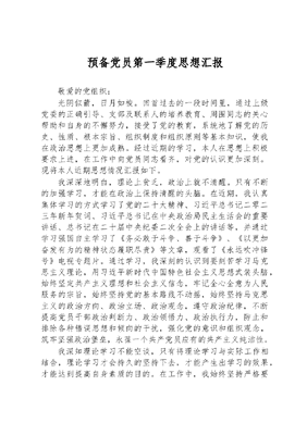预备党员第一季度思想汇报敬爱的党组织:光阴似箭,日月如梭。回首过去的一段时间里,通过上级党委的正确引导、支部及联系人的培养教育、周围同志的关心帮助和自身的不懈努力,接受了党的教育,系统地了解党的历史、性质、根本宗旨、组织制度和组织原则等基本知识,使我在政治思想上更加成熟。经过近期的学习,本人在思想上积极要求上进,在工作中向党员同志看齐,对党的认识更加深刻。现将本人近期思想情况汇报如下。我深深地明白,理论上贫乏,政治上就不清醒。只有不断的加强学习,才能在政治上保持清醒的头脑。在近期,我认真集体学习的方式学习了党的二十大精神、习近平总书记二零二三年新年贺词、习近平总书记在中央政治局民主生活会的重要讲话、总书记在二十届中央纪委二次全会上的讲话等,并通过学习强国自主学习了《务必敢于斗争、善于斗争》、《以更加奋发有为的精神状态履职尽责》等文章,观看了《永远吹冲锋号》电视专题片。通过学习,我深刻的认识到要刻苦学习马克思主义理论,用习近平新时代中国特色社会主义思想武装头脑,始终坚定共产主义理想和社会主义信念,牢记全心全意为人民服务的宗旨,始终坚持党的基本路线不动摇,始终坚持马克思主义的政治方向、政治立场、政治观念,遵守政治纪律,不断提高党员干部政治判断力、政治领悟力、政治执行力,防止和排除各种错误思想和倾向的干扰,强化党的意识和组织观念,筑牢坚强政治堡垒,永葆一个共产党员应有的共产主义纯洁性。我深知理论学习不能空谈,只有将理论学习与实际工作相结合,理论学习才会持久的坚持下去,才能产生出学习的效果,才能达到提高自身素质的目的。在工作中,我始终坚持严格要求自己,勤奋努力,时刻牢记全党全心全意为人民服务的宗旨,努力践行习近平新时代中国特色社会主义思想,努力做好本职工作。工作中一切以党和人民利益为出发点,不急功近利,不计较个人得失,对工作勤勤恳恳,求真务实,全面做好自己的工作,更进一步提高工作质量,做好本职工作。首先,树立高度的责任和敬业精神,认真了解和掌握工作中需要掌握的信息,分析工作存在的问题及时汇报,为领导解决问题,做出正确决策提供便利。其次,科学安排时间,分清任务的轻重缓急,按时、按质、按量的完成任务。然后,总结理论成果和工作经验,切实在破解难题中深化规律性认识,提高分析问题、解决问题的应变能力,不断在学习和工作中完善自身综合素质,为最终服务好群众工作增添能力要素。最后,我会自觉以工作为载体深化学习,增加知识储备,优化知识结构,提高综合素质,坚持把学习贯穿于工作全过程,做学习上的有心人。生活中,我严格要求自己,始终把政治规矩、政治纪律挺在前面,处处带头遵守遵守党纪国法,做到讲政治,讲实话,不做与自己共产党员身份不相符的事情,不讲与自己身份不符的言论,坚决不触碰纪律的高压线,干干净净做事,清清白白做人。时时检讨和警醒自己,要合情合理合法的处理好日常生活中的各个方面,管好自己的心,不该想的不要乱想,管好自己的嘴,不该吃的不要乱吃,不该说的不要乱说,管好自己的手,不该拿的不要乱拿,管好自己的脚,不该去的不要乱去。保持良好心态,知足常乐,淡泊名利,正确面对人生,时时提醒自己生活上要简朴,不要贪图奢华,做事可以高调,做人一定要低调,做到依法行事,坚持公正,恪守本色,培养健康的情趣,远离低俗生活圈子,保持高尚和纯洁的人格,让自己的一生走得正、行得稳、不失足、不后诲。时常自觉净化身边的社交圈、朋友圈、生活圈,坚守住自己的交往原则与底线,并严格要求亲友和身边的人,注重加强对家人进行思想、政治、法纪、道德等方面的教育引导,要求家人遵纪守法、公私分明,廉洁自律。我相信,在党组织的帮助和教育下,我会更好地成长看,因此,我希望党组织从严要求我,使我更快进步。我会按照党员标准严格要求自己,努力克服自己的缺点和不足,并以饱满的热情投入到以后的工作和学习中去,不断提高自身能力和素质,以实际行动争取早日加入党组织,请党组织在实践中考验我。此致敬礼!