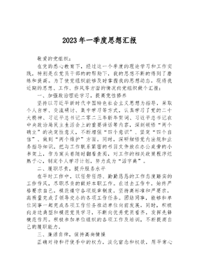 2023年一季度思想汇报敬爱的党组织:在党的悉心教育下,经过这一个季度的理论学习和工作实践,特别是在党员干部的的帮助下,我的思想不断的得到了磨练和提高。为了使党组织能够及时掌握我的思想动态,现将我近期的思想、工作、作风等方面的情况向党组织做个汇报:一、加强政治理论学习,提高党性修养坚持以习近平新时代中国特色社会主义思想为指导,采取个人自学、交流研讨、集中学习等方式,认真学习了党的二十大精神、习近平总书记二零二三年新年贺词、习近平总书记在中央政治局民主生活会上的重要讲话等内容,深刻领悟两个确立的决定性意义,不断增强四个意识、坚定四个自信、做到两个维护方面。同时,深研细悟党内法规和业务指导知识,把与工作联系紧密的书目文件放在办公桌旁的小书架上,作为案头卷随时翻看查阅,对工作的相关政策程序烂熟于心,制定个人学习计划,努力成为活字典。二、履职尽责,提升服务水平在平时工作中,以任劳任怨、勤勤恳恳的工作态度踏实的工作作风,尽职尽责的做好本职工作。在过去工作中,始终严格要求自己,模范遵守各项规章制度,坚持高标准和严要求,高质量完成了领导交办的各项工作任务。团结同事,能够和单位同事一起完成各项工作任务推动单位向前发展。同时,积极向身边典型和模范党员学习,不断向优秀党员看齐,发挥先锋模范作用。积极参加单位组织的各项工作及培训,不断提高自己的履职能力。三、廉洁自律,保持高尚情操正确对待和行使手中的权力,淡化官念和权欲,用平常心看待官位,用职责心看待和运用权力。从未谋取规定以外的特殊利益,不放纵自己的欲望,不贪吃喝、不贪钱财、不贪享乐、不贪图名利地位,堂堂正正地做人,明明白白地工作。不为声色犬马、灯红酒绿的生活方式所动,艰苦奋斗,俭以养德,保持了良好的品行和高尚的情操。坚持大事不糊涂、小事不马虎,自觉增强守一意识,不越雷池一步,在防微杜渐上下功夫,追求党性和道德修养的高境界。在廉洁自律上,做到表里如一,任何时候、任何状况下,都自觉以党性原则和道德规范衡量、约束自己,没有人前一套、人后一套。在这三个月里,我在组织的关怀与培养下,认真学习、努力工作,政治思想觉悟都有了很大的提高,个人综合素质也有了全面的发展,但我知道还存在着许多缺点和不足。抓理论学习的深度、强度不够到位。由于没有深刻认识到理论学习对提升整体素质、促进问题解决的极端重要性,政治理论学习有时仍然停留在表面,特别是在学习习近平新时代中国特色社会主义思想学原著、读原文、悟原理做得还不够,缺乏深入研究和思考,没有很好地处理好工学矛盾,集中学习的多、个人自学的少,被动学习的多、主动学习的少,专题讨论的多、系统学习的少,务虚学习的多、联系实际的少,存在急用先学、现学现用等现象,导致未能真正做到学懂弄通做实。正因为对政治理论学之不深,导致在理想信念方面还存在理论武装系统性不够、用政治理论指导工作实践不够、加强党性修养的标准不够高等问题。在今后的工作和学习中,我要更进一步严格要求自己,争取在思想、工作、学习和生活等方面取得进步。面对新的形势、新的变革、新的发展,继续加强学习,拓展视野,通过持之以恒的理论学习切实提高思想理论水平。特别要系统深入地学习党的二十大精神,准确把握中央和省市委的重要决策部署,切实增强做好本职工作的坚定性。在加强党的思想理论研读、政治品行锤炼和业务知识学习的基础上,更多地涉足经济领域、社会领域等方面知识学习,既学理论又学经验,既向书本学又向群众学,注重理论知识的转化。同时强化理论与实践的交融,切实把理论成果转化为推动工作的动力,进一步提升政治修养和人格魅力,进一步提升业务能力和服务水平。把边学习、边思考,学与用、学与干相结合,努力养成经常学习、深入学习的良好习惯。以上是我近期的思想汇报。希望党组织及时给予我批评指导,我会虚心接受意见,不断改正缺点和不足,从思想上、行动上做一个合格的共产党员。请党组织在实践中考验我!