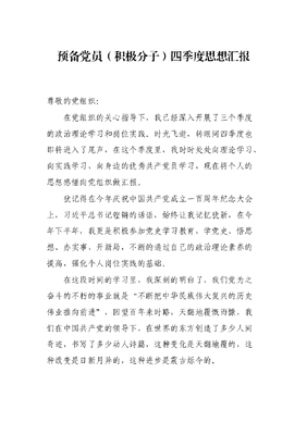 预备党员(积极分子)四季度思想汇报尊敬的党组织:在党组织的关心指导下,我已经深入开展了三个季度的政治理论学习和岗位实践。时光飞逝,转眼间四季度也即将进入了尾声,在这个季度里,我时时处处向理论学习、向实践学习、向身边的优秀共产党员学习,现在将个人的思想感悟向党组织做汇报。犹记得在今年庆祝中国共产党成立一百周年纪念大会上,习近平总书记铿锵的话语,始终让我记忆犹新,在今年下半年,我更是积极参加党史学习教育,学党史、悟思想、办实事、开新局,不断的通过自己的政治理论素养的提高,强化个人岗位实践的基础。在这段时间的学习里,我深刻的明白了,我们党为之奋斗的不朽的事业就是不断把中华民族伟大复兴的历史伟业推向前进,回望百年来时路,天翻地覆慨而慷,我们在中国共产党的领导下,在世界的东方创造了多少人间奇迹,书写了多少动人诗篇,这种变化是天翻地覆的,这种改变是日新月异的,这种进步是震古烁今的。在这段时间的学习里,我深刻的明白了,唯有坚持中国共产党的领导,才能成就中华民族伟大复兴的宏伟目标。这一目标,是我们党在诞生之日起就牢固坚定树立的,这是我们的初心和使命,是我们从未停歇、从未放弃追求的梦想。从新民主主义革命时期抛头颅、洒热血,到社会主义的白手起家,再到改革开放的锐意进取,我们党团结带领全国各族人民力同心、风雨同舟,不断的从胜利走向勠胜利。在这段时间的学习里,我深刻的明白了,只有不断的深化马克思理论与中国实际的结合,才能更好的通过理论指导实践,推动革命、建设、改革以及新时代各项工作。一直以来,我始终注重马克思主义中国化成果的学习,从毛泽东思想、到邓小平理论、到三个代表重要思想、到科学发展观,再到走入新时代,学习习近平新时代中国特色社会主义思想,这些成果是我们推进民族复兴伟大事业的强大思想武器,更是指导我们进行伟大斗争、夺取伟大胜利的重要法宝。在这段时间的学习里,我深刻的明白了,树高千尺根深在沃土,我们党的执政根基来自于人民、根植于人民。总书记曾经说过江山就是人民、人民就是江山,打江山、守江山,守的是人民的心。只有坚持人民至上,全心全意为人民服务,不断的创造出让广大人民更有获得感、幸福感、安全感的事业。以上就是我的思想汇报,请党组织批评指正。