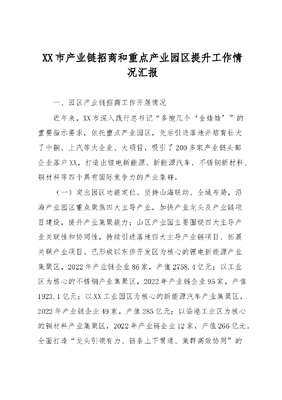 XX市产业链招商和重点产业园区提升工作情况汇报一、园区产业链招商工作开展情况近年来,XX市深入践行总书记多抱几个金娃娃的重要指示要求,依托重点产业园区,先后引进落地并培育壮大了中铜、上汽等大企业、大项目,吸引了200多家产业链头部企业落户XX,打造出锂电新能源、新能源汽车、不锈钢新材料、铜材料等四个具有国际竞争力的产业集群。(一)突出园区功能定位。坚持山海联动、全域布局,沿海产业园区重点聚焦四大主导产业,加快产业龙头及产业链项目建设,提升产业集聚能力;山区产业园主要围绕四大主导产业关联性和协同性,持续引进落地四大主导产业链项目、拓展关联产业项目。已形成以东侨开发区为核心的锂电新能源产业集聚区,2022年产业链企业86家,产值2758.4亿元;以工业区为核心的不锈钢产业集聚区,2022年产业链企业95家,产值1923.1亿元;以XX工业园区为核心的新能源汽车产业集聚区,2022年产业链企业49家,产值285亿元;以临港工业区为核心的铜材料产业集聚区,2022年产业链企业12家,产值266亿元。全面打造龙头引领有力、链条上下贯通、集群高效协同的完整产业生态圈。(二)加强产业龙头培育。针对龙头企业深挖潜能,梳理龙头企业扩能需求,延长产业链条,推动龙头企业扩能项目建设。先后推动XX新材料等龙头扩能建设投产,推进XX等产业链配套头部企业项目建设和投产。截止2022年,全市共有千亿企业2家,百亿企业12家,十亿企业29家,亿元以上企业合计287家。深入实施传统产业数字化转型三年专项行动,出台《XX市传统产业智能制造诊断服务工作方案》,完成52家企业智能诊断服务,XX等企业完成数字化技术改造备案,XX茶业建成国内首条白茶智能化精制流水线。(三)重点深化产业招商。一是绘制招商地图,以工业园区和具体地块为单元开发招商产业地图APP,详细标注招商地块面积、高程、土地类别、产业规划等内容,有针对性的开展园区招商、地块招商。二是完善专班服务,按照一个产业一个工作专班、一个发展规划、一套招商政策、一批重点跟踪项目的要求,完善产业专班服务机制,由市政府领导牵头挂帅、全力推进,着力推进产业链高端项目、龙头项目、补链强链和服务型制造项目招商。三是实施产业链招商专项行动,开展以商招商、小分队招商和主导产业产业链招商专项行动,精准对接考察优质产业链项目。2022年,全年共签约产业项目182个,总投资665亿元,其中主导产业项目75个,计划投资474.7亿元。2023年一季度,新签约产业项目47个,计划投资137.3亿元。(四)精准实施产业政策。出台助企纾困44条贯彻落实一揽子政策51条等纾困政策,修订印发不锈钢7条、锂电7条、铜材料7条、新能源汽车6条等主导产业配套政策;更新发布25类33项免申即享项目清单,2022年全年累计兑现政策奖补资金2.71亿元,惠及企业783家次;助力14家企业实现供应链金融应收账款融资8879万元,58家企业获批贴息贷款1.75亿元,805家企业获批纾困贷24.89亿元;全市为企业降本减负达93.23亿元,有效助推产业发展。二、产业园区标准化建设基本情况XX市现有10个省级以上工业(产业)园区和5个经县级政府批准设立的省级以下工业园区,其中10个省级以上工业园通过一区多园模式管理27个工业园区。近年来,XX市认真贯彻落实省委、省政府工作部署,全面实施工业(产业)园区标准化建设行动计划,逐步构建形成以经济技术开发区、XX经济开发区3个省级标准化建设试点园区为核心,其余7个省级工业园区为重点的3+7园区标准化建设工作格局。截止2022年底,上述园区合计入园企业1685家,其中规上企业517家,2022年实现产值约4500亿元,占全市规上工业产值约70%。其中,东侨经济技术开发区位列2022年度全省试点园区综合评价第二名,并成为我省唯一一家进入全国排名前30位的开发区(位列第22名),动力电池产业集群被工信部列为全省唯一的国家级先进制造业集群,成功收获国家双创示范基地、国家绿色工业园区、两业融合发展试点区域等国字号名片;XX市先后入围全国首批产业链供应链生态体系建设试点城市、全国2022年度城市工业稳增长和转型升级成效明显市(州)名单,为我市推动制造业高质量发展,加快打造增长极,建设四个区提供强有力的工业产业支撑。三、下一步工作思路(一)促进产业集聚。强化招商引资,围绕四大主导产业和县域特色产业,梳理分析产业链缺失环节和薄弱环节,会同主导产业龙头企业,瞄准行业头部企业,开展小分队招商、产业链招商,补齐产业链短板,促进产业全链条集聚发展。努力实现全年千亿招商目标。(二)加强龙头培育。深入开展主导产业产业链招商专项行动和三比三赛专项行动,破解项目推动过程中存在的困难、