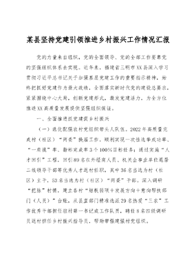 某县坚持党建引领推进乡村振兴工作情况汇报党的力量来自组织,党的全面领导、党的全部工作要靠党的坚强组织体系去实现。近年来,福建省三明市XX县深入学习贯彻习近平总书记关于加强基层党建工作的重要指示精神,始终把抓好党建作为最大政绩,全面落实新时代党的建设总要求,紧紧围绕中心大局,创新党建形式,激发党建活力,为全方位推进XX高质量发展提供坚强组织保证。一、全面推进抓党建促乡村振兴(一)选优配强农村党组织带头人队伍。2022年高质量完成村(社区)两委换届工作,顺利实现一次性选举成功率、一肩挑率、指标完成率3个100%目标任务;通过实施人才回引工程,回引89名在外经商人员、机关企事业单位退居二线领导干部等优秀人才返村任职,其中36名当选为村(社区)主干,53名当选为村(社区)两委干部。深入调研把脉村情,建立各村短板弱项+发展方向+意向帮扶部门(人员)台账,从县直部门精准选派29名热爱三农工作优秀干部担任驻村第一书记或工作队员,聘任8名四级调研员返村担任乡村振兴指导员,帮助带强建强村党组织。(二)持续发展壮大村级集体经济。按照县级统一运营、村级集体受益原则,整合省级扶持村级集体经济发展试点补助资金2批1500万元,县级配套资金300万元,以购买优质店面获取稳定租金收益和委托国有企业统一运营等形式,实现30个试点村村财年均增收3万元以上;深化跨村联建党建模式,组建12个联村党组织,覆盖51个行政村,打造了水际村党建联盟、王坑村产业联动、大田村区域联治等示范点,实施联村项目69个,带动联村每村村财年均增长20%以上。(三)深化党建引领乡村治理。全面落实村党组织书记县级党委备案管理和村两委成员资格县级联审常态化机制,常态化推进软弱涣散党组织排查整顿,严格落实四个一帮扶整顿机制,近三年,共整顿转化18个软弱涣散村党组织;实施五心工程深化抓党建促乡村治理,建立健全乡(镇)党委—村党支部—网格(村民小组)党小组—乡村治理网格员的四级管理服务链条,推行党员中心户制度,为党员户统一悬挂共产党员户标示牌,引导有公心、有热情、有能力的党员担任网格员,全县96名乡(镇)班子成员包村、540余名村干部包片、4180余名党员联户,指导包片区内党建、壮大集体经济、矛盾调解等8项重点工作,助推乡村治理提质增效,梅口乡水际村获评全国乡村治理示范村。二、深入推进党建引领社区治理(一)织密组织体系。由社区党总支联合驻区单位党组织组建6个社区大党委,将城区6个社区划分为138个网格,成立兼合式小区党支部27个,吸收1590余名在职党员、7家物业公司、58支志愿服务队协助做好网格化管理工作,构建社区大党委—小区党支部—网格(楼栋)党小组—社区治理网格员四级组织链条,引导有公心、有热情、有能力的党员担任楼栋长和网格长,推动辖区人、事、物全部沉入网格,把社区的服务功能、职能细化分解落实到小区的每栋楼、每个党员,形成定格、定人、定责三到位,构建起大事全网联动、小事一格解决的工作格局。(二)建强党建阵地。积极协调县委文明办、县住建局、民政局等相关单位,充分利用上级政策、补助资金、闲置场所等各种资源,按照一室多用、便民利民原则,打造6个近邻党建阵地——红色邻里之家,为居民说事、党员理事、支部议事提供活动场所。xx社区活动室进行整合,统筹调配资金、完善器材设施,丰富服务功能、营造友邻氛围,打造了集学习、休闲、健身、调解、议事等功能为一体的共享空间,为居民提供交流平台,打破了邻里间的隔阂壁垒,增进了邻里感情。(三)推广共治机制。结合在职党员到小区报到服务,探索推行党委呼叫、部门回应、党员响应、志愿队伍合应的一呼三应工作机制,推行群众点单、党组织下单、党员接单三单制模式,每季度至少召开1次共建联席议事会议,对群众需求进行分析研判、制定措施、分解任务,并组织各驻区单位、在职党员和志愿队伍按照责任划分和各自特点主动接单,构建起发现问题—提出清单—党委呼叫—召开会议—认领落实—反馈报告的全流程、闭合圈服务模式,精准解决居民反映的困难和问题。去年以来,各驻区单位共帮助解决社区治理、综治维稳和民生建设等方面问题800余件次;各社区成立卫生、教师、法律等志愿服务队伍,针对性地开展健康义诊、法治宣传等各类志愿服务360余场。三、着力提升机关党建融合水平(一)夯实党建基层基础。XX县抓好部分县直部门单位党组织调整设置工作,新设立11个机关党委,成立机关党建服务中心配齐配强机关党务工作力量,在各机关党组织组建1支以年轻党员为主、吸收入党积极分子参与、规模在10—20人的党员志愿服务先锋队,牵头落实1+N社区网格化管控措施,充分发挥他们在XXXX、创城攻坚等工作中的先锋模范作用。带头发起成立党员志愿劝导队、巡逻队、服