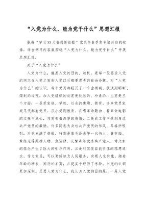 入党为什么、能为党干什么思想汇报根据学习XX大奋进新征程党员冬春季集中培训班的安排,结合学习内容我围绕入党为什么、能为党干什么开展思想汇报。关于入党为什么入党为什么,就是入党的目的、动机,是每一位要求入党的同志在入党之前和入党以后都要思考的政治命题。对入党为什么的认识,每个党员都经历了一个由模糊、肤浅到明晰、深刻的过程。加入党组织的初衷是纯洁的、朴素的,主要是三个方面:一是受家庭、学校、社会的熏陶、教育。许多党员家庭几代都有党员,从小受到教育。在唱革命歌曲、看革命电影的过程中成长,对党有着深厚的感情。二是在工作中受到身边共产党员的激励。许多同志为身边共产党员的作风、品格所吸引,对党充满了崇敬。特别是像毛泽东等一代伟人、董存瑞、黄继光等英雄人物、焦裕禄、孔繁森等优秀共产党人,对大家的信念产生了巨大的引导作用。三是对实现自我价值的理想追求。作为党员,可以更好地为人民服务,实现人生价值。随着年龄的增长、阅历的丰富,在现实中经历了考验,对党的认识更加深刻。反思入党为什么,我认为入党的目的是:一是入党取得了一种政治身份。党的性质和宗旨确定了党是一个先进的组织,凝聚了一大批优秀分子,在这样的组织中活动很光荣,是政治上要求进步的表现。二是入党实现了一种政治信仰。每个人都需要精神追求。要承担起责任,为社会进步、时代发展做贡献,加入党组织,践行党的宗旨,符合自己的政治信仰。三是入党凝聚起一种政治力量。我们党是有着9000多万党员的大党,每个党员贡献一份力量,就能发挥出巨大的正能量,就能团结全国人民实现中华民族的伟大复兴。关于能为党干什么能为党干什么,就是共产党员肩负历史使命和时代责任的政治命题,同时也是一个履行党的宗旨和奋斗目标的实践命题。为党干什么,概括起来讲,作为一名共产党员,必须全心全意为人民服务,严格执行党章规定的权利和义务,在工作、学习和社会生活中起先锋模范作用。关键的关键是,要落实在本职工作中,体现在具体行动上,结合自身工作,我能做的是:一是加强理论学习,锤炼政治品格。加强对党的理论知识、政策法规的学习,及时跟进XXXXXX最新讲话和指示批示精神,做到时间上跟进、视野上跟进、认识上跟进,不断提升持续学习的能力。进一步端正学习态度,发挥主体作用,把理论学习和深入思考紧密结合起来,深刻领会党的创新理论所揭示的时代意义、哲学意义和对现实的指导意义。改进学习方法,理论联系实际,抓住学习重点。在常学常新中加强理论修养,在真学真信中坚定理想信念。利用好三会一课、学习强国、周四悦享夜学等平台载体,不断提高个人政治修养,真正实现用XXX新时代中国特色社会主义思想武装头脑、指导实践、推动工作。二是学习政策制度,提高业务能力。一是进入单位工作后的第一个岗位是医保窗口,与办事群众的面对面接触促使我必须快速地掌握各项政策,回应和解决群众诉求,从而对单位经办业务有了系统的了解。二是岗位调整进入规划财务科工作后,我用归零思维去学习行政事业单位会计知识,加强与各科室和财政的协调沟通,严格按照会计制度规范开展工作和账务处理。财务工作培养了我严谨细致的工作习惯,在以后工作中,我会努力做到高标准、严要求,在学习中认识自身岗位的意义,在领悟中提炼工作方法,摆正心态,沉下心、静下心,真正做到有所收获、有所进步。三是增强行动自觉,注重实际效果。知者行之始,行者知之成。理论学习和知识积累只有加以应用才能转化为推动工作的强大力量,我努力在知行合一、学以致用上下功夫,自觉用党的创新理论指导解决实际问题,特别是对于我们年轻党员同志,要在知行合一中主动担当作为,面对大是大非敢于亮剑,面对矛盾敢于迎难而上,面对失误敢于承担责任。