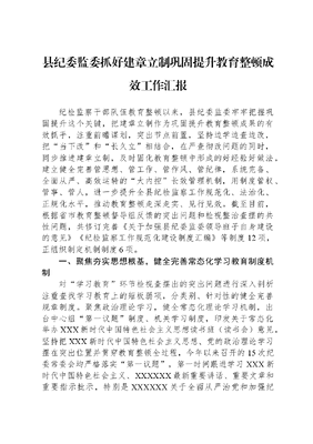 县纪委监委抓好建章立制巩固提升教育整顿成效工作汇报纪检监察干部队伍教育整顿以来,县纪委监委牢牢把握巩固提升这个关键,把建章立制作为巩固提升教育整顿成果的有效抓手,注重前瞻谋划,突出节点前置,坚持边学边查边改,把当下改和长久立相结合,在严查彻改问题的同时,同步推进建章立制,及时固化教育整顿中形成的好经验好做法,建立健全完善管思想、管工作、管作风、管纪律,系统完备、全面从严、高效运转的大内控长效管理机制,用制度管权、管事、管人,进一步提升全县纪检监察工作规范化、法治化、正规化水平,推动教育整顿走深走实、见行见效。截至目前,根据省市教育整顿督导组反馈的突出问题和检视整治查摆的共性问题,共修订完善《关于加强县纪委监委领导班子自身建设的意见》《纪检监察工作规范化建设制度汇编》等制度12项,正组织制定机制制度6项。一、聚焦夯实思想根基,健全完善常态化学习教育制度机制对学习教育环节检视查摆出的突出问题进行深入剖析注重查找学习教育上的短板弱项,分类别、针对性的健全完善规章制度。聚焦政治理论学习,健全常态化理论学习机制,出台中心组第一议题制度、机关学习制度,印发关于常态化举办XXX新时代中国特色社会主义思想读书班(读书会)意见,坚持把XXX新时代中国特色社会主义思想、党的政治理论学习摆在突出位置并贯穿教育整顿全过程,今年以来召开的15次纪委常委会均严格落实第一议题,第一时间跟进学习XXX新时代中国特色社会主义、XXXXXX最新重要讲话、重要文章和重要指示批示,特别是XXXXXX关于全面从严治党和加强纪检监察干部队伍建设的重要论述,进一步提升学习质效。聚焦政治引领,建立委领导—党支部—支部党员领学促学机制,在读原著再深化上持续发力,深入坚持不懈以XXX新时代中国特色社会主义凝心铸魂;制定《县纪委监委临时党支部管理办法(试行)》、编印《党支部标准化规范化工作手册》等制度办法,对党支部工作进一步细化量化规范完善。制定《县纪委监委机关关于大兴调查研究的实施方案》,健全完善领导干部深入基层调查研究制度,紧扣全县2023年纪检监察工作任务目标,委领导班子成员分别牵头领题调研,组织分协管部室组运用好深学习、实调研、抓落实工作方法,通过调研形成问题清单、责任清单、任务清单等三张清单,把有效经验做法固化为常态化制度机制,发挥制度治理效能。针对纪检监察干部专业化程度不高、本领恐慌问题比较突出、纪律法律双精通能力不足等问题,建立健全纪检监察干部培训制度,突出以干代训、以案代训、以巡代训、以挂带训,加强选、训、用全链式培养,深入实施纪检监察干部队伍素质提升工程;结合开展纪检监察工作规范化法治化正规化建设年活动,开展十佳审查调查案件、十佳专项监督案例等5个十佳系列评选,举办纪检监察业务讲堂和纪法专业能力提升培训班,着力提升纪法双施双守本领,真正把队伍建强、让干部过硬。二、聚焦严管严治,健全完善监督执纪执法制度机制聚焦强化政治监督,出台《县纪委监委推进政治监督具体化精准化常态化意见(试行)》,围绕政治监督的内容、责任、成效、人、事、问题和日常监督、方式方法等核心点,明确六个紧盯、十项措施,切实把政治监督落实到具体责任、具体规划、具体政策、具体项目、具体措施、具体成效上。聚焦关键少数,制发《县纪委监委做深做实对一把手和领导班子监督的工作机制》,加强对一把手和领导班子履行管党治党政治责任、贯彻执行民主集中制、依规依法履职用权、廉洁自律等情况的监督;制定《县纪委监委开展一把手廉政谈心谈话的方案》,明确谈心谈话对象、情形及步骤,健全完善一把手约谈工作流程。今年以来,全县纪检监察机关主动约谈班子成员及重点岗位人员65人次,问责各级一把手6人。制发《关于贯彻市委部署要求锲而不舍落实中央八项规定精神深化纠治四风工作指引》,列出6方面24项具体举措,持续加固中央八项规定堤坝。今年以来,全县共查处四风问题35件24人,正在办理12件。聚焦权力规范运行,紧盯纪检监察权力运行的风险隐患,把抓牢制度建设、加强权力运行的制约监督摆在检视整治的突出位置,有针对性地优化内部工作流程,补齐制度短板,完善监管措施。办公室围绕保障和规范机关运行,一手抓部门自身管理,严格办文流程,印发办文提示,完善内部交接机制,进一步提升办文质效和内控水平;一手抓机关制度建设,牵头提出委机关制度规定立、改、废、释具体方案,推动建立健全全面从严管理机制。组织部聚焦干部队伍管理监督机制等方面存在的短板问题,进一步健全干部考察机制,持续优化考察工作举措,探索延伸到办案、巡察等工作一线开展调研考察,切实考准考实干部政治素质和履职情况,持续提升组织工作规范化水平。监督检查室协同巡察、审计、财政、统计等部门,研究制定《纪检监察监督