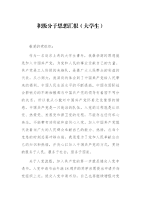 积极分子思想汇报(大学生)敬爱的党组织:作为一名追求上进的大学生青年,我最崇高的理想就是加入中国共产党,为党和人民的事业贡献自己的力量。共产党是工人阶级的先锋队,是最广大人民群众的利益的代表。从小到大,我深刻的体会到了中国共产党给人民带来的福利。中国人民生活水平的不断提高,中国在国际社会影响力的不断加强都与中国共产党的领导有着密不可分的关系。所以我从小就对中国共产党怀着无比憧憬的情感。中国共产党是一只纯洁的队伍,入党的过程就是认识党、热爱党、发展党和捍卫党的过程,不能存在任何私心杂念,不能带有功利欲和虚伪心入党。加入中国共产党就代表着向广大的人民群众奉献自己的能力、热情,在每个危急的时刻总要冲锋在前。我愿意为了党和人民奉献出自己的知识和热情,并决心以加入中国共产党的方式,更好的服务于人民,服务于社会,服务于国家。关于入党流程,加入共产党的第一步就是递交入党申请书,入党申请书由年满18周岁的同学自愿提出申请并向党组织上交。提交入党申请书后,自己也再继续增强对党的了解,了解一些党章党史等等。在提交了入党申请书后,团支部会召开一次支部大会,申请人要依次阐明自己对党组织的认知和动机等等,支部会对提交入党申请书的同学们进行投票,最终团支部推优选出积极分子。之后,经党支部批准并公示后成为入党积极分子。成为了入党积极分子,就正式成为了党支部的一员。在这期间,作为一名积极分子,要积极的为党支部贡献自己的力量,发挥自己的能力来建设党支部。还要自觉递交思想汇报,向党组织汇报自己的思想状况。在此期间,会组织一些党课的培训和教育,因为要确保入党积极分子的同学们已经有了过硬的理论知识,我校还会有积极分子党课班的学习以及测试,还会有党课结业考试。入党积极分子将会经过至少一年的考察期,会有机会成为发展对象。成为预备党员后,会确定入党介绍人、进行政治审查、培训等等。成为预备党员后会有为其一年的预备期,在这期间预备党员要积极向党组织靠拢,积极学习党的理论和动态以及指导思想,也要积极建设我们的党支部。满一年后预备党员就可以向党组织提交书面申请,申请转正。所在的党组织会召开支部会议讨论转正问题,会进行民主表决,通过表决会转为正式党员,并进行公示。入党的过程就是对人的磨练、更是对每一位同学党性的考察,只有真正积极向上,有党性有觉悟的同学才能够被党组织所吸纳。发展共产党员本着宁缺毋滥的原则,吸收最优秀的青年同学。我作为一名积极分子感到十分的自豪。在大一学年的上学期,我提交了入党申请书,也顺利的成为了一名光荣的入党积极分子、加入了XX学院XX级党支部这个大家庭。在提交入党申请书之前,我遇到问题最先考虑的往往是个人利益,从而忽略了大局和其他同学的利益。在成为了入党积极分子之后,我认识了许多十分优秀的同学,这些同学不仅有着过硬的专业知识,而且综合能力也很强。他们能够在兼顾学习的同时,很好的完成党支部的工作。党支部是带领大家共同进步的团体,同学们要将自己的热情和知识奉献给党支部的每一次活动,党支部才能够越来越好。同时,党支部的活动也很好的影响了XX学院的其他同学,比如微课等等活动。成为积极分子后,在这一年的培养中,XX学院的党支部开展了一系列独具特色的活动,通过不同的形式,让我们体会到了中国共产党的伟大,同时也丰富了我们的党建知识。每次党支部举行的活动我都努力的参与其中,通过活动对共产党人来说意义重大的地点,增强理论与实际结合,让我们深刻的体会学习了党的历史和发展历程。党支部给我带来的除了丰富的党建知识之外,还有从别处无法得到的民族自豪感和爱国情怀。如果我能够光荣的成为一名预备党员,我将会感到无比的自豪,继续努力的为党支部工作。我的长处在于编写文稿和制作推送,经过积极分子一年多的培养锻炼,我已经十分熟悉党支部制作推送和发送文字内容的要求。如果我能够被选为预备党员,我将会更好的发挥我所擅长的内容。在我不足的方面我也将积极努力的向其他同学学习,和其他的同学更好的配合,把党支部共同建设的更加美好。如果我没有成为预备党员,那就说明我的理论知识和个人表现尚有不足,我将毫不气馁并继续将自己的热情奉献给党支部,分析自己的不足和做的不尽人意的地方并加以改正,继续努力向党组织靠拢。汇报人:XX20XX年XX月XX日