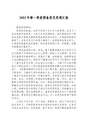2023年第一季度预备党员思想汇报敬爱的党组织:经党组织批准,我终于实现了向往已久的愿望,成为了一名光荣的预备党员。兴奋之余也倍感荣幸,我在党组织这个团结友爱的大家庭中感受到党组织的深切关怀,在党组织的培养教育下,在党员同志们的悉心帮助下,我积极参加理论学习,认真接受党的先进性教育,党性修养得到了进一步提高。现将近期情况汇报如下:一是政治思想方面。首先,除了紧跟支部步伐认真学习习近平新时代中国特色社会主义思想、党的二十大精神、总书记系列重要讲话精神等外,我通过广播、电视新闻、报纸等途径主动加强政治学习,利用学习强国APP学习了《中国共产党第二十届中央委员会第二次全体会议公报》、《极不平凡的历程来之不易的成果——写在我国取得疫情防控重大决定性胜利之际》、《把雷锋精神代代传承下去》等文章,利用业余时间学习新党章、了解我们党的光辉奋斗史。我还在图书馆阅读了老一辈无产阶级革命家的一些理论著作,及时学习党中央颁布的决策、决议,在思想上和党组织保持高度一致。另外,我十分重视与党组织的思想交流,在这一季度我积极响应党的号召,积极参加单位组织的各种活动,经常向老党员学习经验、交流心得,按期向党小组组长汇报自己的思想状况,及时解决自己的思想问题。通过近期的学习,我更加珍惜现在来之不易的幸福生活,更加坚定正确的政治方向,以一名党员的标准严格要求自己。二是在工作方面。为了充实、提高自己,我从不放松自己的业务学习,平时积极参加单位组织的各种业务培训,认真学习相关业务知识,仔细观察、善于询问,遇到不解的难题及时向领导、同事们学习工作经验和技巧,及时做好笔记并认真总结自己的不足和需要改进的地方。同时下班后按计划拓展自己的知识面,消除知识盲点,进一步巩固业务知识。回想这段时间的工作,我深刻的认识到工作需要不断加强学习以适应社会发展的需要,要以更加积极的精神面貌不断地付出努力,汇聚点滴,踏实认真,坚持不懈,这也逐渐成了我工作的目标,时刻鞭策、要求着自己。三是在生活方面。平时能够严格要求自己,注重日常生活作风的养成,坚决抵制了腐朽文化和各种错误思想观点对自己的侵蚀,做到了生活待遇上不攀比,要比就比贡献、比业绩;作风上艰苦奋斗,提倡艰苦朴素,勤俭节约,反对铺张浪费,坚持光盘行动,杜绝腐败现象的滋生蔓延;纪律上遵纪守法,自觉接收党内监督、群众监督,抵制腐朽思想侵蚀。我时刻以党员标准要求自己,从细微做起,从身边小事做起,勿以恶小而为之,勿以善小而不为。我与家人、同事、朋友都能和谐相处,团结共进。在这段时间里,在党组织和同志们的关怀和帮助下,我认真的做好每一件事,脚踏实地的走好每一步,在思想上、工作上、生活中都有了新的收获和提高,个人综合素质也有了全方面的发展,党性修养也有所提高,但我深知自己仍存在这诸多不足和缺点。在今后的工作和学习中,我要更加严格要求自己,时刻保持清醒的头脑,客观看待每一件事,不断反省自己,虚心向身边先进人物学习,继续努力改正自己的缺点和不足,争取在思想、工作、生活中有更大的进步。以上是我近段时间来的基本情况,如有不妥之处,恳请组织批评指正。