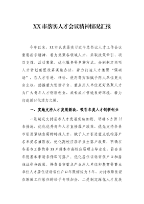 XX市落实人才会议精神情况汇报今年以来,XX市认真落实习近平总书记人才工作会议重要指示精神,着力集聚各领域人才,采取政策牵引、项目支撑、活动集聚、优化服务等多种方式,分别制定两项人才计划前置改革实施办法,着力打造人才集聚强磁场,在人才引进、评价、使用等方面赋予用人单位更大自主权,助推重大创新平台、重点用人单位更好集聚人才为广大青年人才创新创业、成长成才营造良好环境,着力打造新时代活力之城。一、实施支持人才发展新政,吸引各类人才创新创业一是制定支持县市人才发展实施细则。明确6方面35条措施,优化优秀青年人才直接落户政策,优先支持各县市引进紧缺急需的特殊人才,赋予人才引进重点机构落户名单提名推荐权。优化高校应届毕业生落户政策,明确在各县市工作的非XX户籍本市高校应届硕士毕业生,符合当年度基本申请条件即可落户。优化居住证转常住户口和居住证积分政策,将各县市重点产业用人单位和教育等事业单位人才居住证转常住户口年限缩短为5年,对持市居住证在新城工作居住的给予专项加分。二是制定深化人才发展体制机制改革实施意见,将完善青年人才培养机制列为重要改革任务。出台英才计划包干制项目实施方案。在赋权上做加法,给予人才经费管理自主权。赋予立项选择权,入选专家可根据个人或团队研究方向,使用获得的研究支持经费申报1个或多个科研专项作为包干制项目,项目技术路径、参与单位等由专家自主决定。赋予项目负责人指定权,入选专家可自主组建研究团队,根据需要明确本人或指定团队成员担任项目负责人。赋予经费组合权,入选专家可将人才项目经费、相关匹配经费等纳入包干制项目,不需编制项目经费预算,不受经费使用科目和比例限制,根据科研需要调剂使用资金。在管理上做减法,为人才创新创造减负松绑。实行项目申报仅需填写一张申报表,市委人才办会同有关单位审查后直接立项,整个流程最快1个月完成。明确包干制项目由入选专家所在单位自主管理,不收取任何项目管理费,实施中遇到需要调整技术路线、实施方案或组成人员时,在不降低项目考核指标前提下,项目负责人可不经报批自主调整。明确结题验收由项目牵头单位自行组织,验收结果报主管部门审核后出具结题确认单;评价上认可技术推广、标准制定等替代性成果,不简单以论文、专利数量多少作为评价指标。在监督上有章法,确保人才干成事不出事。明确项目牵头单位必须是入选专家所在的法人单位,负责项目跟踪管理和过程监督;参与单位与入选专家、项目牵头单位签订协议,承担相应责任和义务。将人才经费使用绩效、包干制项目实施情况作为入选专家年度工作履职报告和终期考核重要内容,每年由用人单位组织考核评估,支持周期结束后由市委人才办组织终期考核,明确项目中途终止或验收不合格的不得评为优秀等次,项目实施过程中存在学术不端、失信或涉嫌违纪违法的直接认定为不合格等次,清理出重庆英才计划。目前全市共立项包干制项目XXX个,有XXX名专家获得经费支持,有效提升全市人才竞争力。三是完善重点领域急需紧缺高层次人才定向招聘机制,组织重点企事业单位赴先进地区招聘高水平大学毕业生,累计引进博士XX多名。出台优秀青年人才培养支持办法,推出 14 条具体培养支持举措,将40 周岁以下、急需紧缺的卡脖子技术人才和管理人才、符合条件的博士纳入培养支持范围。四是制定两项人才计划前置改革实施办法,针对市域内重大创新平台高层次人才数量不足等问题,两项人才计划单列入选名额,重点支持国家实验室(基地)、国家重点实验室、国家(省)重大科技基础设施等重大创新平台以及有关科技领域的重点用人单位,加快集聚更多基础研究和关键核心技术人才,推动建设具有全国影响力的科技创新中心。前置人才配额,改变过去高层次人才先引后评方式,在每年年初直接给予用人单位一定数量的引才名额,支持用人单位带指标自主靶向引才,对特别优秀人选可一事一议引进;对高质量发展急需的顶尖人才和领军人才给予倾斜支持,鼓励引导高层次人才向重大创新平台和科技领域重点用人单位集聚。二、实施青年人才项目计划,引导各类人才尽展其能一是推动产城融合。引导各县市与有关高校加强联动,鼓励设立产教融合联盟,培养区域和产业发展所需创新型人才。支持各县市产业园区、重点企业建立高技能人才培养基地,开展各类技能竞赛。实施产业高端人才培育工程推动国家级、市级人才项目计划等青年人才培育项目向各新城重点企业倾斜。支持各县市用人单位申报设立就业见习基地,吸引高校毕业生就业见习,对符合条件的给予补贴。二是突出项目带动。在XX市十四五各类重大人才项目计划中,增设青年人才专项,定向培养青年骨干人才实施科技特派员制度,以青年科技特派员为主体,今年已选派XXXX人赴艰苦边远地区开展科技帮扶。加强青年科技人才科研经费保障,明确新引进到企事业单位的高水平大学博士毕业生,前3