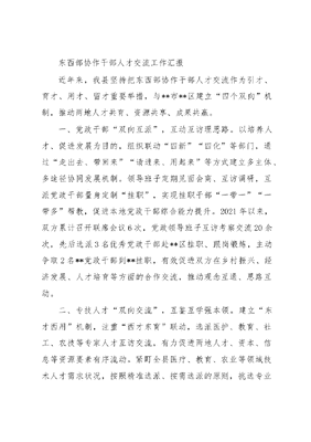 东西部协作干部人才交流工作汇报近年来,我县坚持把东西部协作干部人才交流作为引才、育才、用才、留才重要举措,与**市**区建立四个双向机制,推动两地人才共育、资源共享、成果共赢。一、党政干部双向互派,互动互访理思路。以培养人才、促进发展为目的,组织联动四新四化等部门,通过走出去、带回来请进来、用起来等方式建立多主体、多途径协同发展机制。领导班子定期见面会商、互访调研,互派党政干部量身定制挂职,实现挂职干部一带一一带多帮教,促进本地党政干部综合能力提升。2021年以来,双方累计召开联席会议6次,党政领导班子互访考察交流20余次,先后选派3名优秀党政干部赴**区挂职、跟岗锻炼,主动争取2名**党政干部到**挂职,有效促进双方在乡村振兴、经济发展、人才培育等方面的合作交流,推动观念互通、思路互动。二、专技人才双向交流,互鉴互学强本领。建立东才西用机制,注重西才东育联动,选派医护、教育、社工、农技等专家人才互访交流,有力促进两地人才、资本、信息等资源要素有序流动。紧盯全县医疗、教育、农业等领域技术人才需求状况,按照精准选派、按需选派的原则,挑选专业技术骨干到**区跟岗实训,主动争取**专家人才到**送教送培支医支农,推动技术互学、作风互鉴。2021年以来,先后选派7名医疗专技人才赴**区对口单位学习交流,帮助增长见识、提高专业技术能力;主动争取**区13名专家人才到**帮扶指导,累计开展手术示教、教学研讨、产业技术指导560余次,带动发展医疗新项目5项、推广农业新技术18项。三、培育资源双向共享,互联互通提素质。充分发挥对口地区中山大学的专业和资源优势,通过主题讲授、案例分析、互动交流、现场教学等多视角、多维度的教育培训方式,帮助干部开阔视野、提升能力、丰富经验。2021年以来,依托东西部协作资金,累计举办各类能力提升培训班60期6300余人次,有效帮助700余名县直部门、乡镇分管乡村振兴和东西部协作的领导干部和具体业务人员拓宽工作思路、增强工作本领。先后与**区5家学校、医院结成帮扶对子,**区技术骨干以线上线下方式累计开展专题培训指导、知识讲座31期3500余人次。充分挖掘对口地区企业发展优势,构建粤黔校企合作、校校合作、工学结合教学模式,与技校、企业共建技工班2个,定向培养本地职业技能人才35人。四、人才服务双向管理,互爱互通强保障。建立东西部协作人才交流双向联系服务机制,两地相互通报交流东西部协作挂职、跟岗人才队伍结构、工作思路和工作安排,有效促进东西部人才合理流动和优化配置。强化分析研判,注重把各类人才放到最能发挥其才能和需要锻炼的工作岗位上,分别担任受帮扶学校学科带头人、医院科室主任等,以领头雁方式点对点的在教育、医疗卫生、社会服务以及旅游文化等事业发展上开展帮扶工作。坚持政治上关心、生活上照顾、工作上支持、待遇上保障,分别在组织部、乡村振兴局等重点部门(单位)明确专人负责挂职干部协调、服务和管理等工作,及时协调解决遇到的实际困难和问题,并利用中秋、国庆、春节等重要节日对帮扶专家人才进行走访慰问,赠送旅游景区门票,让帮扶专家人才感受到温暖和关怀。