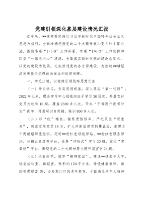 党建引领深化基层建设情况汇报近年来,**镇党委坚持以习近平新时代中国特色社会主义思想为指引,全面准确把握党的二十大精神核心要义和丰富内涵,围绕省委1+1+9工作部署、市委1+6+3工作安排和区委一园三中心建设,全面落实新时代党的建设总要求,以党的建设为统领,扎实推进党的各方面建设,为推动**镇经济发展提供坚强政治保证和组织保障。一、学无止境,以党建引领筑牢思想之基(一)带头学习,夯实思想根基。深入落实第一议题,2022年以来,理论学习中心组组织班子学习30场次。开展农村党员大轮训15期,覆盖2500多人次。开办干部提升夜莺计划夜学,开展研讨8周期,轮训800多人次。(二)以红增色,锤炼党性修养。严把队伍质量关,规范发展党员14名。扩大两新组织党的覆盖面,新建3个两新组织党组织。用好**村红色领航驿站、**村红色服务驿站、林锵云故居等平台,开展体验式学习30期。做优党群说平台,围绕党的二十大精神等主题开展宣讲24期。(三)老有所学,筑牢精神家园。建设**镇老年大学,设有培训室、舞蹈室,面积约170平方米,开设健康常识、舞蹈等课程21期,办好家门口的老年教育,不断满足老年人精神文化需求,努力打通老年教育最后一公里。二、治理有方,以党建引领激发基层动能(一)全面搭建基层治理四梁八柱。出台《关于**镇1+4+10党建引领基层治理实施方案》,构建镇-智慧网格-治理单元三级架构体系,划分29个智慧网格,建立206个治理单元,规范改造17个村级智慧网格指挥中心。同时,坚持党建引领,探索建立健全平急结合、平急转换机制,灵活应对各类突发事件。目前,累计收集网格事件信息13280余条,出动治理力量2万余人次,事件办结率100%。(二)高效推进企网联管。针对冠华厂区员工数量多、流动性强的特点,重点配强网格员队伍,由经济办、综治办、人社所等部门20多名骨干成员担任网格员,建立六个一工作机制,收集和分析各类信息,强化安全生产管理和员工服务,累计发现整改隐患189处,服务回应员工诉求230多人次,有效化解舆情7条,切实把问题解决在萌芽状态,确保企业安全生产和稳定发展。(三)精准深化警网融合。围绕空心村、渔民渔船、厂企治安等重点工作,组建17个1+1+N(1民警+1辅警+N个社会力量)模式的警务驿站,季度开展党旗领航强警务、比学赶超争先锋评选活动,激励警员、干部担当作为,打造群防群治新格局。三、从严落实,以党建引领筑牢层层防线(一)全方位健全考评机制。出台村(社区)一综合三专项绩效考核,累计在党建引领基层治理、疫情防控、农村人居环境整治三个领域奖励400多万,激励农村干部带领58名专职网格员、246名兼职网格员推动各项基层治理任务贯彻落地。(二)全覆盖抓实疫情防控。全力推行智慧网格化治理,落实联户包干工作制度,发动机关干部、村(社区)两委干部、网格员、党员志愿者深入下沉206个治理单元中,落实白名单工作,深入开展三询问一完善工作,实现全镇30466人户籍人口信息100%覆盖,其中65岁以上重点人群(常住人数)3882人,红色标记909人,黄色标记491人。同时,镇相关职能部门组织各领域开展防控应急演练18次,开展社会面大检查320多次,整改问题521起,切实提升群防群治力量。(三)全领域防范风险隐患。对建筑施工等14个行业领域实行全覆盖拉网式检查,累计检查企业373家次,落实隐患整改730多处,全年无重大以上安全生产事故发生。建立5个防走私固定巡防点,组建152人共19支队伍全天候巡防,实现全年零上水目标。四、砥砺前行,以党建引领谱写发展新篇(一)落实园区再造工程。引进投资约13亿元的万洋**智能制造产业园项目,实现我镇第一个摘地即动工项目。打开村改新局面,升级改造子营山智造产业园约77亩现有低效工业用地;投入约3646万元,推进子营三路、达盈路等园区主干道路建设;投入约1965万元,完成**山智造产业园220kv铜水线、水台线迁改。(二)全面推进乡村振兴。实施退苗还粮,新增水稻种植面积239亩,投入资金100多万元完成国家遥感点和水稻重点监测种植,撂荒耕地100%复耕。创建区粮食高产示范片,年示范面积3000亩。实施双季稻+冬种菜苗轮作试点约3820亩。打造农村四小园生态板块65个,农房微改造300间。(三)加强城乡区域建设。投入约2561万元对省道S385路面及安防工程进行升级改造。投入2440万元新建约3.8公里污水管道及旧污水管道2.8公里清淤和修复。投入300万元启动圩镇主干道和省道S532两旁绿化改造工程。
