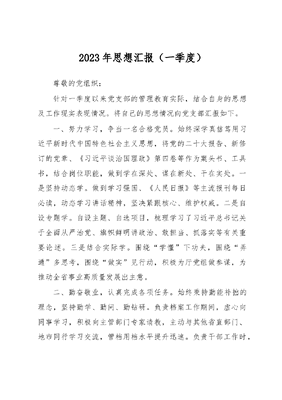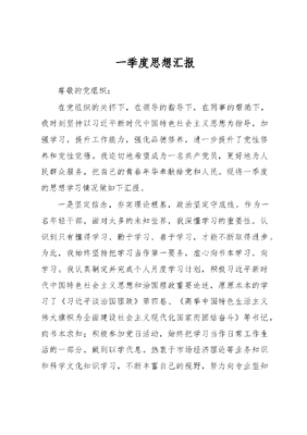 一季度思想汇报尊敬的党组织:在党组织的关怀下,在领导的指导下,在同事的帮助下,我时刻坚持以习近平新时代中国特色社会主义思想为指导,加强学习,提升工作能力,强化品德修养,进一步提升了党性修养和党性觉悟。我迫切地希望成为一名共产党员,更好地为人民群众服务,把自己的青春年华奉献给党和人民。现将一季度的思想学习情况做如下汇报。一是坚定信念,夯实理论根基,政治坚定守底线。作为一名年轻干部,面对太多的未知世界,我深懂学习的重要性,认识到只有懂得学习、勤于学习、善于学习,才能不断取得进步。为此,我始终坚持把学习当作第一要务,虚心向书本学习,向学习。我认真制定并完成个人月度学习计划,积极习近平新时代中国特色社会主义思想和治国理政重要论述,原原本本的学习了《习近平谈治国理政》第四卷、《高举中国特色生活主义伟大旗帜为全面建设社会主义现代化国家而团结奋斗》等书记,向书本求知;积极参加党日活动,始终把学习当作日常工作生活的一部分,做到以学代息。热衷于市场经济理论等业务知识和科学文化知识学习,不断丰富自己的视野,努力向专业型知识结构发展。并注重用理论指导实践,重视思想政治素质的培养和锻炼,提高分析解决问题的能力。二是岗位学习,加强业务能力,边干边学强素质。在实践中,做到认真定位、工作到位、思考换位、切忌越位,认真履职,作分管工作的主攻手,当好正职的参谋、助手和左膀右臂,全力配合领导开展工作,遇到问题及时请示汇报,用心维护群众意志和决策,在思想上、政治上、行动上与班子持续高度一致,正确处理好个人与组织、与领导,与同事、与基层干部之间的关系,经常反思自己的言行,善于理解批评,认真对待并虚心理解不一样意见推荐,自觉做到不说糊涂话、不做出格的事,以自我的一言一行维护单位的形象。三是踏实肯干,端正工作心态,脚踏实地干工作。在平时工作、学习、生活中,我时时刻刻注意个人的品德修养,严格遵守廉洁自律各项规定,严格遵守各项党纪政纪,严格遵守各项法律法规,严格遵守党风廉政建设职责制各项规定。实际工作中做到不以职务之便,坚持勤俭办事,不讲排场,不比阔气,不搞特殊化,能正确认识自身的工作和价值,正确处理苦与乐、得与失、个人利益与群众利益、工作与家庭的关系,坚持甘于奉献、诚实敬业。回顾这一段时间的思想和工作情况,我的进步与成长离不开领导的支持和同事们的帮助。我也很清楚自己还存在很多的不足与缺点:在工作学习中,能按照要求积极参与其中,但由于受业务工作冲击、惰性思维干扰,理论学习中存在以浏览网络简讯和杂志报刊代替学习原著,以工作感悟代替读书体会的现象。对新理论、新概念、新观点和新战略,学深悟透、融会贯通、内化于心不够,缺乏着眼实践、指导工作的理性思考,没有很好做到全面性归纳梳理和系统性融会贯通。同时,受过去一些工作套路影响,在推动工作中还存在惯性思维,有效运用近平新时代中国特色社会主义理论武装头脑、指导实践、推动工作不够,在弘扬传统、开拓创新和自我革命方面勇气不足、狠劲不够,缺少对办里整体工作的统筹兼顾和通盘考虑,没有很好地将所学所思转化成推动工作的重要武器,没有完全做到两个结合。在今后的工作实践中,我会继续加强政治理论和党的创新理论的学习,坚持做到每日必学,每日必进,武装自身,提高自己修养。贯彻落实好党的群众路线,坚持从群众中来到群众中去,不断改善自身工作方法和提升工作能力。面对千头万绪的工作,把高效率高质量的落实作为切入点,不仅要做安排、提要求、勤督查,更重要的是要亲力亲为、率先垂范,不做甩手掌柜。围绕自身的不足,本着再小的工作也是大事的原则,抓大不放小、抓重不误轻。安排的同时,自己也要学习研究有关政策,共同探讨最佳对策;工作过程中积极介入完善思路、贡献思想、发表观点;完成之后严格把关,对照要求,详察细审,自己觉得满意了再提交主要领导审定,把参与、监督、落实作为工作的前提,把快速、高效、优质当做工作的目的,通过这样事无巨细、全程参与、跟踪落实改变作风,保质保量的完成各项工作。以上就是我这段时间以来思想、工作情况的总结,不全面和不准确的地方,请党组织和党员同志批评、指正。此致敬礼!汇报人:XX2023年X月X日