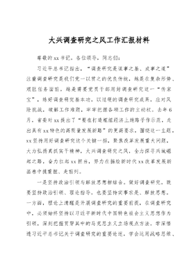 大兴调查研究之风工作汇报材料尊敬的xx书记,各位领导,同志们:习近平总书记指出,调查研究是谋事之基、成事之道注重调查研究是我们党一以贯之的优良传统,越是在复杂形势、艰巨任务面前,越是需要党员干部用好调查研究这一传家宝,练好调查研究基本功,以过硬的调查研究成果,应对风险挑战,破解工作难题,牢牢把握各项工作的主动权。去年6月,省委对xx提出了要在打造枢纽经济上趟路子作示范,走出具有xx特色的高质量发展新路的更高要求,围绕这一主题,xx坚持用好调查研究这个关键一招,聚焦改革发展重大问题,大力弘扬真抓实干精神,大兴调查研究之风,全力探寻兴城崛起之路,奋力扛起xx担当,努力在描绘新时代xx改革发展新画卷中挑重担、走前列。一是坚持政治引领与解放思想相结合。做好调查研究,既要坚持政治引领、理论指导,也要坚持实事求是、解放思想。一方面,理论上清醒是开展调查研究的重要前提,在调查研究中,必须始终坚持以习近平新时代中国特色社会主义思想作为引领,深刻把握贯穿其中的马克思主义立场观点方法,学深悟透习近平总书记关于调查研究的重要论述,学会运用战略思维、历史思维、辩证思维,提高运用科学理论解决实际问题的能力;另一方面,思想的解放是做好调查研究工作的必然要求,在调查研究中,不能按部就班,更不能犯经验主义本本主义错误,必须不断解放思想,透过现象看本质,找准症结,拿出有效对策。xx坚持把习近平新时代中国特色社会主义思想作为做好一切工作的行动指南,把解放思想作为谋划推动工作的关键环节,在全市深入开展彰显xx担当,我们怎么干解放思想大讨论活动,坚持跳出xx看xx,向好的学、跟强的比、与快的赛,赴杭州、深圳、长沙、合肥等先进地区学习考察调研,广泛发动干部群众参与讨论,征求各类意见建议,系统推出城市建管十大提升行动、产业高质量发展十大提升行动、十大文化重点工程和人才10条政策等系列务实举措,有力增强全市发展的科学性、前瞻性和成效性。二是坚持高处谋局和细处落子相结合。从高处审视全局和从细处落地落实,是正确认识和处理事物的两条路径、两种方法,也是领导干部开展调查研究的基本要求。在调查研究中,既要善于观大势、谋大事,站在战略和全局的高度观察和处理问题,在制定政策时冷静观察、谨慎从事、谋定而后动;又要善于抓要害、见真招,从大处着眼、小处着手,将战略方向变成具体举措,推动各项工作落地见效。当前,面对百年未有之大变局,国内外经济形势发生重大调整,特别是新一轮技术革命与产业变革带来的全新挑战,xx站在战略全局高度,从宏观着眼,准确把握发展大势,科学研判经济形势,主动融入构建双循环新发展格局,精准把握全球航空产业大调整、电子信息产业迎来新的爆发点等新趋势新机遇,加快战略新兴产业在xx布局。在此基础上,坚持从微观着手,分析各地各行业特别是企业经营调整情况,抢抓北京非首都功能疏解、发达地区产业外溢、央企二次布局、大企业二次创业战略机遇,积极对接产业转移,将产业发展落到项目上,全力开展招大引强,与华为、阿里、工业富联、软通动力、科大讯飞等龙头企业达成战略合作,推动xx等x个百亿项目落户xx,促成协议投资额达xx亿元。三是坚持吃透上情与摸清下情相结合。贴紧上级决策部署围绕现实难题,解决群众所难,是领导干部开展调查研究工作的根本出发点。一方面,要准确领会党中央和省委决策部署要求,学深悟透上级会议和文件精神,把准调查研究方向;另一方面,要深入基层捕捉信息,发现苗头性、倾向性问题,找到群众遇到的现实难题,做到有的放矢。2022年以来,xx坚决按照党中央和省委决策部署要求,切实践行人民至上、生命至上理念,统筹推进疫情防控和经济社会发展,深入研究政策,全面梳理疫情以来中央和省级各项政策,特别是民生领域帮扶政策,严格推进政策落实,并结合xx实际,制定出台了《有效应对疫情稳定经济增长25条政策措施》《关于做好六稳工作落实六保任务的实施办法》等系列文件。同时,针对群众反映强烈的突出问题,研究具体办法,采取有力措施予以解决,重点围绕农贸市场及周边脏乱差、公共停车难、老旧小区居住环境差、社区服务弱等问题,在征求群众意见、深入调研论证的基础上果断决策,迅速开展农贸市场整治百日攻坚行动,对涉及xx余万人的xx个老旧小区实施提升改造,建成1+5+X社区邻里中心xx个,有效改善了居民生活,人民群众幸福指数持续攀升。四是坚持解决问题与建立机制相结合。开展调查研究的目的在于通过找问题、摸实情、出对策、破难题,最后形成制度机制,推动工作长效常态化发展。这就需要在调查研究中,坚持标本兼治,既要紧盯难题,重点突破,快速解决,又要找到共性,务实举措,形成成果,让每项调研不仅是解决问题的过程,更是建立制度机制的过程。2022年以来,xx坚持在调研中破难题、建机制,通过对县区、开