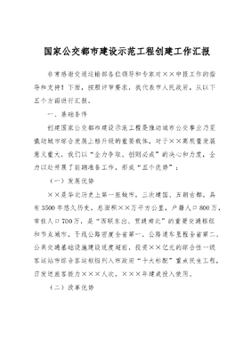 国家公交都市建设示范工程创建工作汇报非常感谢交通运输部各位领导和专家对××申报工作的指导和支持!下面,按照评审要求,我代表市人民政府,从以下五个方面进行汇报。一、基础条件创建国家公交都市建设示范工程是推动城市公交事业乃至撬动城市综合发展上档升级的重要载体,对于××高质量发展意义重大,我们以全力争取、创则必成的决心和力度,全力以赴开展了前期准备工作,形成五个优势:(一)发展优势××是华北历史上第一座城市,三次建国、五朝古都,具有3500年悠久历史,总面积××万平方公里,户籍人口800万,常住人口700万,是西联东出、贯通南北的重要交通枢纽和节点城市,干线公路密度全省第一,公路通车里程全省第二。公共交通基础设施建设适度超前,投资××亿元的综合性一级客运站市综合客运枢纽列入市政府十大标配重点民生工程,日发送旅客能力×××人次,×××年建成投入使用。(二)改革优势改革创新是××的城市名片,曾连续5年入选全国改革典型案例,推出了全国第一个行政审批局、公立医院改革等改革举措。市委、市政府把国家公交都市建设示范工程创建作为重大的改革事项推动,列入十四五交通运输业发展重点任务。××是省首批优先发展公共交通示范市,全市公交线网总里程×××公里,市区公交站点500米覆盖率100%,市区公交车1000辆,其中纯电动500辆,天然气450辆,万人保有量××标台。2022年市政府利用政府债启动了总投资×××亿元的新能源公交车替代工程,第一批纯电动公交车450辆完成招标,明年一季度投入使用,2023年新能源纯电动车辆占比将达到100%。(三)政策优势××已形成较为健全的公交发展政策体系,出台了《关于城市优先发展公共交通的实施意见》《关于推进全市城乡公交一体化发展的实施意见》等20余个政策文件,以及《市公共交通专项规划》等10余个规划,形成规划引领、政策保障的蹄疾步稳发展局面。(四)技术优势探索形成了公交发展数字化解决方案,在全省率先建成公交智能调度平台,之后在历年升级基础上2020年建成公交调度云平台,企业管理实现格子化管控,职工薪酬、车辆充电、机务维修、耗材以及客运量等实现精细化管理,并对车辆全过程监控和驾驶行为进行预警分析干预,安全间隔里程保持在×××万公里。推出公交APP软件,各类功能集成为群众出行提供了极大便利。(五)平台优势我市通过公车公营、集团化改造等措施,构建了1+N公交运营格局,即市区公交以市交建集团为主导,县级公交由××家运营公司有机衔接和补充,形成城市公交、城际公交、城乡公交一体化运营网络。市交建集团注册资本20亿元,总资产300亿元,员工7000余人,为我市公交发展提供了强有力支撑。同时,我市4县入选全省首批县级城乡客运一体化试点,数量最多,新增公交车100部,夯实了公交发展基础。二、思路目标我们总的考虑是,全面贯彻落实党的XX大精神,以建设交通强市为目标,以创建国家公交都市活动为载体,深入践行以人民为中心的中国式现代化发展理念,坚持问题导向和成果导向,坚持改革创新突破,举全市之力开展创建活动,着力打造一批具有鲜明××辨识度的创新举措,让便捷高效、绿色低碳的公交出行成为新的城市名片,为城市发展增添新的动能和活力。我们的创建目标是:到2025年,国家公交都市示范工程创建活动确定的各项任务全部完成;与市民慢行出行意愿相匹配、与客流方向相吻合、与低碳降耗相适应的公交出行主体地位基本确立;保障更有力、服务更优质、设施更完善、运营更安全、管理更规范的公共交通体系基本建立,并推出一套可复制、可推广的公交发展模式,为其他城市公交发展趟出一条路径。三、任务安排为确保创建目标实现,我们将以项目化方式挂图作战、倒排工期、强力推进,将创建任务细化为六大工程、24项任务。一是基础设施保障工程。综合客运枢纽项目尽快投入使用;新建5处公交枢纽场站,改扩建3处首末站,城市公交港湾式停靠站设置率达到10%。加强城乡公交客运站、候车亭牌建设管理,提高公交便民度。二是公交提速保通工程。出台《公交专用道管理办法》等系列文件,建设15公里公交专用道,城市公交专用道设置率达到20%,完善道路抓拍设施和系统,落实公交优先通行措施。三是服务品质提升工程。实施公交线网全面优化,新增和调整线路13条,新建3个枢纽线路换乘站,城市公交车保有量达到19标台/万人,开通微巴士,定制公交、学生班车等特色线路,推进公交与旅游、快递融合。四是低碳交通推进工程。新能源纯电动公交车辆占比达到100%,在4处场站建设新能源公交配套充电设施。新建和改扩建城市主次干道,同步设置步行道和自行车休闲道,建设骑行服务系统。五是智慧公交升级工程。大力推进智慧交通建设,高标准建成市交通运输局综合运行协调与应急指挥中心(TOCC),建设AIOT公交智慧大脑、数字应用集成平