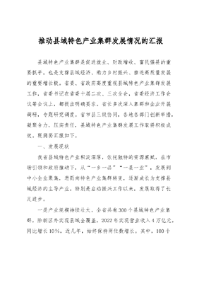 推动县域特色产业集群发展情况的汇报县域特色产业集群是促进就业、财政增收、富民强县的重要抓手,也是支撑县域经济、助力乡村振兴、推进高质量发展的重要增长极。省委、省政府高度重视县域特色产业集群发展工作,省委书记在省委十届二次、三次全会,省委经济工作会议等会议上,都提出明确要求。省长多次深入集群和企业开展调研,专题研究调度。省市县三级协同,各地各部门创新举措,凝聚合力,压实责任,县域特色产业集群发展工作取得积极成效。现简要汇报如下。一、发展现状我省县域特色产业积淀深厚,依托独特的资源禀赋,在市场引领和政府推动下,从一乡一品一县一业,发展到中小企业聚集,进而向特色产业集群转变,逐渐成长为支撑县域经济的主导产业。特别是启动振兴工作以来,发展取得了长足进步。一是产业规模持续壮大。全省共有300个县域特色产业集群,除新区外实现县域全覆盖,2022年实现营业收入4万亿元,同比增长10%,近几年,始终保持两位数增长。其中,100个省级重点县域特色产业集群覆盖80个县(市、区),实现营业收入3万亿元,同比增长10%。二是产业发展特色鲜明。经过多年深耕细作,特色产业凭借技术一招鲜,形成许多行业隐形冠军,丝网开发的0.036毫米不锈钢丝工艺,突破国内微丝最细记录;生物首创辣椒红色素连续提取分离技术,辣椒红色素、辣椒精、叶黄素3个产品产销量位居世界第一,辣椒红色素产销量占有率超过了世界份额的80%。三是品牌影响稳步攀升。5个集群被列为国家中小企业特色产业集群。省级重点县域特色产业集群培育中国驰名商标、国家地理标志产品等400项;创建特色产业名县名镇110个,发布16个特色产业指数,羊绒产业集群产品商标注册量居全国县级之首;20个集群产品国内市场占有率超50%,其中再制造产业集群是全球最大的汽车起动机、发电机再制造基地,宠物食品产业集群宠物食品年产销量全国第一,丝网国内市场占有率超80%。四是绿智转型不断加快。150家集群企业获评省级绿色工厂;省级重点特色产业集群两化融合发展水平55.3,高于全省平均水平。数字化研发设计工具普及率74.3%、经营管理数字化率74.3%、应用电子商务企业比例67.3%,均高于全国和全省平均水平。五是创新能力明显提升。全省县域特色产业集群主持和参与制修订国际标准、国家标准、行业标准、地方标准1300项,集群高新技术企业2500家,科技型中小企业2万家,省级专精特新中小企业100家,小巨人140家,培育省级单项冠军120家,建立工业企业研发机构1900家。二、推进措施一是坚持目标导向,强化顶层设计。省级制发《省特色产业发展十四五规划》《省县域特色产业提质升级工作方案(2021-2025年)》《省县域特色产业集群领跑者企业培育行动方案》等文件,实施企业上市、科技赋能、产业升级、强链补链、金融助力、冀有特色六大行动,培育认定了首批140家创新能力强、发展潜力大、质量效益优的领跑者企业,引领带动集群高质量发展。指导市县结合产业禀赋和发展实际,逐个集群制定发展规划和振兴计划。以省政府名义召开全省县域特色产业高质量发展会议,省委书记作出批示,省长出席讲话。二是坚持问题导向,抓好包联服务。建立一个产业集群,一名包联领导,一个工作专班,一抓到底的市县包联县域特色产业集群工作机制,全省各级领导累计赴集群头部企业调研8300次,召开企业家座谈会1000次,帮助企业解决各类问题3200个。通过一企一策解决问题,帮助集群企业拥抱资本市场,加快发展步伐,领跑者企业、集群企业分别在北交所、深交所主板实现上市,2家集群企业通过上市审核待发行。三是坚持需求导向,推动精准赋能。主要开展了:金融赋能,联合省农行对全省集群头部企业开展金融大走访活动,对1300家集群头部企业进行逐企走访,提供用信余额210亿元,增幅45%。组织产融对接和银企对接活动,银行业金融机构向集群和头部企业授信1300亿元。数字赋能,培育数字化车间220个,推动2900家企业上云,在集群开展互联网+产业集群和智慧集群试点建设。设计赋能,组织开展工业设计进企业进园区进集群活动300场,服务企业4800余家,覆盖集群170个。羊绒小镇入选全国纺织服装创意设计示范园区,面业包装植入工业设计成效明显。四是坚持结果导向,实施督导考核。出台《省县域特色产业振兴工作考核办法》,严格落实月调度、季通报、年考核工作机制,将县域特色产业振兴工作作为每月全省工业经济运行调度的重要内容,每季度进行通报排名,每年组织考核,对优秀市县予以表扬,对考核结果较差的予以预警提示和现场督导,压实属地责任,凝聚工作合力。三、下一步工作安排下一步,将坚持以习近平新时代中国特色社会主义思想为指导,认真落实省委十届二次、三次全会决策部署,突出工作重点,持续用力加力,加快推动县域特色
