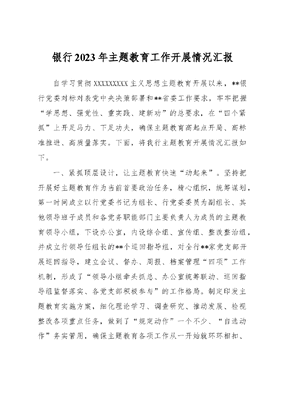银行2023年主题教育工作开展情况汇报自学习贯彻XXXXXXXXX主义思想主题教育开展以来,**银行党委对标对表党中央决策部署和**省委工作要求,牢牢把握学思想、强党性、重实践、建新功的总要求,在四个紧抓上开足马力、下足功夫,确保主题教育高起点开局、高标准推进、高质量落实。下面,将我行主题教育开展情况汇报如下。一、紧抓顶层设计,让主题教育快速动起来。坚持把开展好主题教育作为当前首要政治任务,精心组织,统筹谋划,第一时间成立以行党委书记为组长、行党委委员为副组长、其他领导班子成员和各党务职能部门主要负责人为成员的主题教育领导小组,下设办公室,内设综合组、宣传组、整改整治组,并成立行领导任组长的**个巡回指导组,对全行**家党支部开展巡回指导,建立会议、督办、周报、档案管理四项工作机制,形成了领导小组牵头抓总、办公室统筹联动、巡回指导组监督落实、各党支部积极参与的工作格局。制定印发主题教育实施方案,细化理论学习、调查研究、推动发展、检视整改各项重点任务,做到了规定动作一个不少、自选动作务实管用,确保主题教育各项工作从一开始就环环相扣、无缝衔接、一体推进。二、紧抓理论学习,让主题教育快速热起来。深化坚持第一议题制度,第一时间召开党委(扩大)会议,传达学习党中央、省委主题教育工作会议精神,安排部署贯彻落实措施。**月**日,在省属国有企业中及早召开主题教育工作会议,再次传达学习党中央、省委主题教育工作会议精神,全面安排部署全行主题教育工作。严格对照省委要求,在省委第**巡回指导组的精心指导下,及时研究制定主题教育读书班方案,安排了领导领学、专题研讨、视频学习、实地参观等学习环节,学习形式丰富多彩、鲜活生动;在必读书目、选读书目的基础上,突出金融企业特色,增加了XXXXXX对国有企业、经济金融工作的重要讲话、重要指示批示精神等内容,学习内容更接地气、更富成效。三、紧抓调查研究,让主题教育快速活起来。坚持把调查研究作为第一课题,制定实施在全行大兴调查研究的实施方案,围绕党建与经营融合、全行战略规划、经营转型发展、金融风险防控、员工急难愁盼、金融消费者需求等方面存在的问题、短板和不足,拟定了调查研究方向清单,包括**个调研方向。行党委委员、领导班子成员紧密结合分管领域、分管条线、联点支部、分管分支机构工作实际,每人确定一个调研课题开展调研;全体中层管理人员以总行部室、分支机构为单位,选定一个调研课题开展调研。调研突出以小切口做好大文章,聚焦到具体的一个点上,主要采取四不两直方式,深入一线、深入基层、深入企业,把脉问诊、解剖麻雀、发现并解决问题。在调研过程中,按计划组织召开调研工作推进会、成果交流会,督导调研进度,交流经验做法,相互借鉴学习,确保把调研成果转化为推动**银行高质量发展的实际行动和积极成效。四、紧抓查改贯通,让主题教育快速实起来。坚持把检视问题整改贯穿主题教育始终,从主题教育一开始,行党委领导班子就以刀刃向内的自我革命精神,坚持边学习、边对照、边检视、边整改,紧密结合省委巡视回头看与2022年度党风廉政建设考核反馈的问题,以及审计监督、监管检查发现的问题,重点围绕理论学习、政治素质、能力本领、担当作为、工作作风、廉洁自律等6个方面,查找梳理初步形成了领导班子问题清单,明确了整改措施、整改目标、整改时限、责任人和责任单位,并对问题清单实行动态管理,按期对账销号。下一步,我行将严格按照上级工作部署要求坚持把理论学习、调查研究、推动发展、检视整改贯通起来,有机融合、一体推进,有力有序做好各项工作,创新方式方法,切实把学习成效转化为推动可持续高质量发展的强大力量和生动实践,为金融服务中国式现代化作出新的更大贡献。