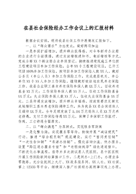 在县社会保险经办工作会议上的汇报材料根据会议安排,现将我县社保工作开展情况汇报如下。一、以群众需求为出发点,做好两项加法一是参保扩面增加,提升群众获得感。对今年新开办注册的企业进行全面摸排,通过发放稽核通知书、电话稽核等方式,完成全部XX个新注册企业参保登记。持续推进建筑施工单位按工程建设项目参加工伤保险,全年XX个工程建设项目,已开工项目100%参加工伤保险,按项目参加工伤保险人数XX人。做好公务员(参公人员)参加工伤保险工作,完成我县机关、参公单位XX个XX人参加工伤保险。继续做好被征地农民养老保险工作。我县企业职工基本养老保险参保人数XX万人,征收养老基金XX万元;工伤保险参保人数XX万人,征收工伤保险基金XX万元;失业保险参保人数XX万人,征收失业保险基金XX万元。二是待遇发放增加,提升群众幸福感。按政策要求足额完成城镇职工基本养老保险调待工作,共为我县XX名企保退休人员调待XX万元。全年足额发放了5.04万元退休人员XX万元养老待遇,支付工伤保险待遇XX万元,保障了参保职工伤医疗、伤残、工亡待遇全面落实。二、以群众满意为落脚点,实现服务零距离一是化繁为简,实现服务零等待。持续开展减证便民行动,推进综合柜员制规范建设,实行首问责任制一次性告知制承诺办结制,强化咨询分流、快办服务,设置跨区通办服务专窗和老弱病残孕绿色通道窗口,不断优化办事流程。指导并多次测试县人民医院、县中医医院开展工伤保险联网结算接口工作。二是网办+上门办,办理业务零跑路。充分依托网上大厅、XX政务服务网、XX人社、XX社保、掌上12333等平台,继续深入推广社保经办高频事项线上办理,实现网上认证XX人,网上转移XX人次。开展上门办帮办代办,对老年人特别是高龄、空巢、失能、留守等重点群体及残疾人等特殊群体,建立台账并实施动态管理,共上门认证XX人。三是优化服务,实现服务零差评。坚持统一业务操作标准化、统一大厅分区标准化、统一着装语言标准化。全面落实惠企政策,为我县XX家企业减免工伤保险费、失业保险费XX万元,为XX户企业办理缓缴社保费XX万元。用心用情为群众解决实际困难,推进行风建设和业务经办深度融合,开展警示教育学习XX次,加强好差评评价结果运用,全年零差评,并收到群众送来的热情服务、诚心为民锦旗一面。三、以群众放心为着力点,确保基金颗粒归仓一是从防范风险到优化业务,强化内控制度建设。结合社会保险经办风险防控评估检查完善《长期暂停领取待遇人员常态化清理机制》等制度,前移管控关口,分析业务经办中存在的问题、分析风险发生的可能性,结合业务工作实际及人员变化动态调整廉政风险点,设置一级风险点XX个,二级风险点XX个,三级风险点XX个。严格落实要情上报制度,加强要情分析研判。加强业务讨论交流,形成统一办理口径,进一步优化业务流程、完善业务标准,促进风险防控和业务优化良性循环,整体提升业务经办管理水平。二是从人防到技防,运用数据共享比对核查。每月定期到公检法司等部门共享数据,主动在裁判文书网核实退休人员服刑情况,及时接收核实部、省、市下发的服刑预警信息,做到服刑期间不领待、缓刑期间不调待。全年共获取数据XX条,已全部核查完毕,其中核查到的疑点数据XX条,已停待遇XX人,系统标注不参与调待XX人,终止缴费XX人。三是从刚性追缴到柔情分期,维护社保基金安全。经核查确认违规领取社保待遇的,我局将立即停止待遇支付,千方百计联系违规领待人员,讲清政策依据、领待金额及法律后果,对多次追讨仍拒不退回多领待遇的案件,做到程序到位,材料充分,向劳动监察部门、司法部门等地移交。因人施策,对却有生活困难的人员,充分为其考虑,可通过分期付款、退休待遇逐月抵扣等方式追回基金。截止目前,共追回社保基金XX万元,还有两人正在追缴。下一步,我局将认真贯彻落实本次会议精神,坚持深入实施全民参保计划,持续做好灵活就业人员、农民工等重点群体精准扩面。加强社保基金监督管理,常态化开展警示教育。抓好全局业务水平,继续开展练兵比武,加强局内部业务交流学习,努力打造一支政策通、业务精、作风硬、本领强的社保干部队伍。