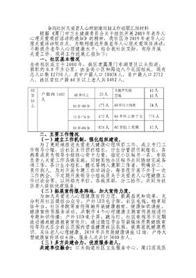 金尚社区关爱老人心理健康项目工作进展汇报材料根据《厦门市卫生健康委员会关于组织开展2019年老年人心理关爱项目活动的通知》的精神,我社区为2019年老年人心理关爱活动项目点。为顺利推进开展老年人心理关爱项目活动,不断提升老年人心理健康水平,结合我社区实际,有序开展关爱工作,现将工作进展汇报如下:一、社区基本情况金尚社区成立于2000年,社区隶属厦门市湖里区江头街道,面积约0.8平方公里,由金尚小区和周边八个花园组成。现有总人口数12750人,其中户籍人口10038人,非户籍人口2712人。社区常住户籍60岁以上老人共1492人。60岁以上户籍内1492人90岁以上23人人失能半失能空巢10人16人80岁-89岁175人人60岁以上残疾54人70岁-79岁470人人65岁以上独子父母776人人60岁-69岁824人人60岁以上失独12人人二、主要工作情况(一)建立工作机制,强化组织建设。为了更好地推进关爱老人健康心理项目工作,成立专门工作领导小组,由社区主任担任组长,计生分管担任副组长,各两委成员为领导小组核心骨干力量,指定小区秘书一名,专职负老人关爱工作具体实施,同时其他小区秘书共同协助完成各项工作,各计生小组长、楼长等纳入兼职工作者,明确分工,责任到人。及时开展专题工作培训会,每季度开展不少于一次工作例会,不定期开展领导小组成员关于关爱老人心理健康工作讨论会等。以网格为单位,各施其职,分工协作,共同为社区老人提供优质服务。(二)拓展宣传服务阵地,加大宣传力度。为加大关爱老人心理健康宣传力度,提高居民知晓率,充分利用社区微信公众号、户外LED电子屏、社区电视、畅享短信平台、社区书院等宣传阵地开展健康教育、健康知识讲座、健康宣传等服务活动。共制作4个心理健康主题宣传展板进行专题知识传播;户外LED电子屏、跑马灯、社区电视等不定期流动播放健康教育宣传片;通过微信平台等新媒体开展健康宣传等形式在全社区范围内营造健康社区氛围,提高居民健康意识,关注老人心理健康。2019年共开展健康讲座12场,户外大型健康宣传活动4场,服务人次共计3000余人。(三)多方共建合力,优质服务老人。共建单位融合:江头街道社区卫生服务中心、厦门莲花医院厦门弘爱医院等共建单位,发挥各自优势资源,开展多元活动服务老人。如开展健康心理大讲堂、春节养生、糖尿病防治、高血压预防、甲状腺防治等专题知识讲座及健康义诊、健康心理调查等活动,为广大老人提供优质健康服务项目。截至目前,社区已对社区65周岁以上困难老人、特扶对象老人、空巢老人等开展心理健康问卷调查,通过调查了解社区老人心理状况,利于后续心理干预辅导等。社会组织聚力:社区的各类社会组织——社区计生协会、妇联、老人协会、志愿服务队、各文化队伍等助力开展健身操小组活动、八段锦、太极拳公益培训等文体服务活动。社工机构助力:以政府购买服务为契机,发动金雁社工机构、培善社工机构、12349养老服务机构等专业社工机构开展慢病互助小组、健康知识讲座等活动。多方合力,共同打造健康幸福社区。(四)不断开拓创新,优质服务幸福共享。健康小屋亲情服务:2017年10月携手湖里区疾控中心建立自助健康小屋,为居民搭建健康自助体检平台,为辖区广大居民提供优质服务。社区携手江头街道社区卫生服务中心、住总物业金尚服务处、齐安金尚门诊部、莲花医院等单位共同为辖区居民提供一站式免费体检服务,每周一至周三下午3:00-5:00对居民免费开放,同时结合节假日增加向居民免费开放使用时间。在自助健康小屋体检模式下,广大居民尤其是老人可以根据实际需要自行选择体检项目和顺序,体检结果为临床诊疗提供依据。现场专业医生、健康管理师等为老人提供健康指导、健康教育等优质服务,不断提升全社区居民的健康水平。通过社区全体工作人员的共同努力、共建单位的合力助力关爱老人项目工作取得了一定的成效,得到了老人们的认可与点赞,今后,我们将继续做好关爱老人心理健康各项工作,对照工作标准,加大宣传力度,开展更多更优质服务项目。三、工作中存在的问题。1、社会越来越关注心理健康,也开始关注老人心理健康,但目前对心理干预还较陌生,有些老人会比较考虑面子问题,在问卷调查时会有所隐瞒。不愿去面对生活中的焦虑,老人们对心理健康方面的认知还存在一定的局限性。2、社区现有工作人员不具备专业心理健康知识,尤其对老人心理健康知识更加缺乏,无法有效帮助老人心理咨询。目前社区方面仅能做的是针对大部分老人开展普遍性的如健康心理讲卒、健康义诊等活动,对于个案辅导等专业心理干预还无法进行,需要借助专业心理咨询师等专业进行个案辅导,此项工作需要各级部门有一定的经费支持与项目支持。四、接下来的工作打算。1、继续做好老年人心理健康问卷调查,做到尽可能扩大调查对象覆盖面,包括困难老人、特扶对象老人、高龄老人等,为开展专业心理健