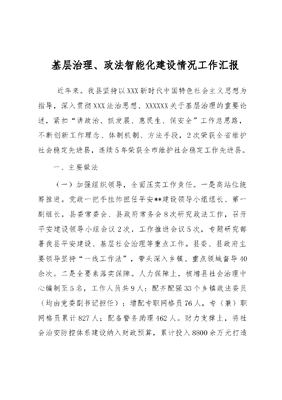 基层治理、政法智能化建设情况工作汇报 近年来。我县坚持以XXX新时代中国特色社会主义思想为指导,深入贯彻XXX法治思想、XXXXXX关于基层治理的重要论述,紧扣讲政治、抓发展、惠民生、保安全工作总思路,不断创新工作理念、体制机制、方法手段,2次荣获全省维护社会稳定先进县,连续5年荣获全市维护社会稳定工作先进县。一、主要做法(一)加强组织领导,全面压实工作责任。一是高站位统筹推进。党政一把手挂帅担任平安**建设领导小组组长、第一副组长,县委常委会、县政府常务会8次研究政法工作,召开平安建设领导小组会议2次,工作推进会议5次,专题研究部署我县平安建设、基层社会治理等重点工作。县委、县政府主要领导坚持一线工作法,带头深入乡镇、重点领域督导40余次。二是全要素落实保障。人力保障上,核增县社会治理中心编制至5名,工作人员共9人;配齐配强33个乡镇政法委员(均由党委副书记担任);增配专职网格员76人,专(兼)职网格员累计827人;配备警务助理462人。财力支撑上,将社会治安防控体系建设纳入财政预算,累计投入8800余万元打造三级综治中心情报指挥中心联调中心智慧检务,建成雪亮工程视频监控点位2940个、慧眼工程视频监控点位10万余个。三是全方位压实责任。研究出台《平安**建设工作考评办法(试行)》《平安**建设工作考评指标体系(试行)》等文件,将基层治理工作、网格化服务管理等工作纳入乡镇、部门年度目标绩效考核重要内容。强化督导考评机制,先后开展专项督导8次、调度乡镇55次,通报批评或约谈行动迟缓、措施不力的乡镇25个、行业单位6个。印发《**县乡镇政法委员职责清单》《**县乡镇政法委员权力清单》《**县乡镇政法委员管理考核办法(试行)》及有关制度,建立健全四张清单,通过权力清单赋权、职责清单赋责、日常清单赋效、负面清单赋警,开展乡镇政法委员加强政治能力建设政治轮训2次,业务培训6次,切实提高他们的履职能力。(二)夯实基层基础,全面提升治理水平。一是坚持四化融合推进综治中心建设。印发《推进综治中心实体化实战化运行实施方案》《**县综治中心实体实战能力提升行动工作方案》,按照实体化、实战化、规范化、智慧化标准,建成县、乡、村三级综治中心496个,其中示范类102个、创建类360个、带动类33个,视频调度、心理疏导、矛盾纠纷调解、公共法律服务等功能齐全,专兼职工作人员配齐配强县级达到9人、乡镇平均达4-5人、村级1+n人。二是坚持系统集成织密监控网络。推动将天网工程580个点位、应急广播132个点位、智慧交通38个点位、数字城管219个点位、雪亮工程2940个点位达,慧眼工程4.5万个点位全部接入县综治中心,构建立体式、全方位公共安全视频监控网,并实现县、乡镇、村(社区)三级调度,综治中心建成后通过视频信息资源累计排查治安隐患1723个、开展公共服务85000次、协助侦办治安刑事案件285件,已成为应对重大风险的指挥部、汇集情报信息的数据部、平安形势分析研判的参谋部、解决治理难题的服务部。三是坚持一网运行推进网格化服务管理。注重党建引领,建立红色网格。着力从红色堡垒、红色头雁、红色队伍、红色联动、红色支撑5方面发力,在城区设立网格党支部119个,小区微网格836个,形成辖区党委政府+网格员+志愿者+小区党组织+物业企业工作机制,成功化解我县东川铭郡物业纠纷,成功推动城区老旧小区整治,相关做法被市委政法委采用推广;推动力量整合,构建全科网格。推行多网合一、一网运行全科网格化服务管理模式,医保、生态环境保护、退役军人事务、消防等工作纳入网格化服务管理;深化多元共治,做优联动网格。发挥网格员纽带作用,整合网格内力量和其他社会力量参与网格化服务管理,形成1+4+N网格治理大格局,网格员累计发现、上报、办理各类事项9.98万余件,99.98%的事项在网格中办结,多项重点指标位列全市第一方阵。(三)突出协调联动,全面推行多元解纷。一是织密调解网络。在全市率先建成诉源治理中心,全面推进庭站点员建设,设置基层人民法庭7个、诉讼服务站36个、巡回审判点462个;设行业性、专业性调解组织11个,医患纠纷人民调解中心成为全市行业性人民调解的典范;设基层人民调解组织462个,配备专(兼)职调解员6000余人。二是创新工作机制。探索建立三天三一排查、三三调处、不满意信访事项第三方评价机制等工作机制,抓实前端预防,推动人民调解、行政调解、司法调解、行业调解、专业调解有效衔接,防止小事拖大;推行梯度解纷,一般矛盾纠纷由村(社区)指定专人第一时间介入,调解3次以上,普通矛盾纠纷由乡镇组建调解团队,村社干部、法律顾问等参与调解3次以上,