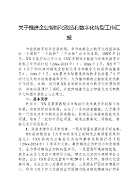 关于推进企业智能化改造和数字化转型工作汇报为抢抓数字经济发展机遇,努力破解企业数字化转型面临的不愿转不敢转不会转的共性难题,20XX年12月,XX省政府办公厅出台《XX省制造业智能化改造和数字化转型三年行动计划(20xx-2024年)》;20xx年2月,XX市下发《关于加快推进制造业智能化改造和数字化转型的实施意见》;20xx年5月,XX县发布智能化改造数字化转型三年行动计划及相关政策措施等文件,大力推动制造业智能化改造数字化转型。近期,我们就XX县智能化改造和数字化转型的现状、存在问题进行了调研,并就如何推进企业智能化改造和数字化转型方面提出几点建议。一、基本现状近年来,XX县紧紧围绕省市智能化改造数字化转型工作部署,积极抢抓政策机遇,出台了一系列政策措施,大力推动新一代信息技术与制造业深度融合,鼓励企业实施智能化改造项目,培育了一批标杆示范项目,制造业数字化、网络化、智能化水平明显提升。1、政策支撑体系逐渐完善。一是高质量发展政策不断完善。XX县相继出台《关于加快推进全县制造业高质量发展的意见》《XX县制造业智能化改造和数字化转型行动计划(20xx-2024年)》等系列文件,激发制造业创新活力和发展潜力,全力推动制造业加快转型步伐。二是营商环境持续优化。成立全县优化营商环境领导小组,建立优化营商环境联席会议制度,出台《XX县优化营商环境20条》等文件,持续优化营商环境,为企业安心发展保驾护航。三是助企纾困政策增强信心。印发《关于加大力度助企纾困推动经济稳定健康运行的若干政策措施》,帮助企业共渡难关,提振企业发展信心。四是人才新政助力招才引智。修订《关于深化宝地英才集聚计划加快推进人才兴县战略的20条政策意见》,加大人才引进培育力度,帮助企业引才育才留才。2、基础网络环境持续优化。加快宽带网络升级改造步伐,提升网络服务能力。XX县出台了加快推进第五代移动通信网络建设文件,编制《XX县信息通信基础设施空间布局规划(20xx-2035年)》,合理布局、科学规划以5G基站为代表的新一代信息基础设施。5G网络建设稳步推进,网络覆盖能力持续提升,全县已累计建设5G基站XXXX余个,千兆接入能力用户数约XX万户,宝胜科技创新股份、宝珠电器等企业已开展5G应用项目建设。推进工业互联网标识解析应用,XXX家企业注册接入工业互联网标识解析二级节点。开展网络综合治理能力建设,网络安全防护能力不断提升。加强工业信息安全防护,开展工业信息安全检查评估、人才培训、整改提升等活动,获评省工业信息安全防护星级企业6家。3、智能制造水平大幅提升。引导企业加大智能化数字化投入,加快实施机器换人、智能化改造等项目,提升智能制造水平。电子信息、汽车零部件、电线电缆等行业正加速智能制造新模式应用,宝胜电气、骏升、明智车业、科达车业等企业纷纷实施智能化数字化改造项目,一大批企业完成生产装备从机械化到智能化的更新换代,智能化数字化水平显著提升,实现了生产过程实时调度、物料自动配送、产品信息可追溯,降本提质增效成效明显。鼓励森萨塔、凯翔、尼尔等企业围绕智能制造各环节,加快推进智能车间、智能工厂建设,目前已累计创成省智能制造示范工厂X个、省示范智能车间XX个、市智能车间XX个。4、示范带动作用显著增强。一方面,开展数字画像诊断服务。征集优秀诊断服务商,为企业开展数字画像免费诊断服务,帮助企业解决不愿转不会转问题。20xx年,为XXX家规上工业企业开展免费诊断服务,帮助解决做什么怎么做的问题。另一方面,打造一批标杆示范企业。涌现一批典型示范企业,标杆示范带动作用不断凸显,有效解决企业不敢转的问题。目前,已累计创成国家制造业与互联网融合发展示范项目X个、国家两化融合贯标项目XX个、省两化融合示范项目X个、省工业互联网标杆工厂X个、省星级上云企业XXX个、市智改数转优秀场景案例X个。二、存在问题智能化改造数字化转型工作取得了一定成绩,但与苏南经济发达地区相比,工业底子薄、产业结构差、转型经验少等因素一定程度上制约着数字化转型步伐。1、企业不愿转。受各类因素影响,企业主观不愿转成为智能化改造数字化转型工作推进的第一道坎。转型成本高,企业数字化、智能化程度低,特别是中小企业还处于自动化、信息化补课阶段,普遍存在缺乏信息化部门和机制不健全、年轻员工偏少、数字化转型观念不强等问题,且转型投入成本高、收益不明确、部分员工存在抵触情绪,使得企业不愿转。2、企业不能转。一方面,关键人才缺乏。智能化改造数字化转型强调互联网、大数据、先进制造等多方面的融合,仅掌握信息技术或制造技术的人才已不能满足企业发展的需要,企业培养或引进跨领域复合型人才难度大、成本高。另一方面,生产设备限制。不同厂家的设备通信接口和参数各不相同,标准难统一。进口设备封