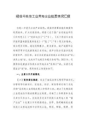 信局低效工用地企置情经业业处况汇报为进一步优化工业产业结构,提高资源要素优化配置和利用效率,扩大有效投资,根据《关于推广亩均效益评价工作的意见》(*经信运行〔*〕*号)、《关于推动工业经济高质量转型发展的意见》(*发〔*〕*号)等文件精神,结合我区实际,通过收购整合、兼并重组、破产清算和出租租赁等方式处置低效工业用地,逐步分批分类盘活低效闲置资产。2022年,全区共处置盘活低效工业用地企业*家,涉及土地*亩,完成市下达我区年度任务的*%;2022年,已摸排拟处置盘活低效工业用地企业*家共计*亩,目前已处置盘活*家*亩。现将相关工作报告如下。一、主要工作开展情况(一)坚持高位推进。成立了由区政府主要领导任组长,分管领导任副组长,区发改、经信、财政等相关部门为成员的*区低效工业用地处置工作领导小组,建立了处置低效工业用地协作联动联席会议制度,明确了工作职责和各成员单位任务分工。区政府多次召开低效工业用地(原僵尸企业)处置工作专题推进会,指导、协调解决在处置低效工业用地过程中涉及的土地、规划、环保、税费、债务、司法纠纷等重点难点问题,全力保障了低效工业用地处置工作的有序开展。(二)开展摸排核查。区经信局、开发区等部门相关人员多次深入停产企业和停工项目进行专题调研和摸底调查对企业基本情况和诉求进行了详细了解,对低效工业厂房的占地、建筑面积、建造结构类型、资产负债等进行认真统计,整理建档,建立低效工业用地处置工作台账,并与企业业主进行了充分沟通,对处置方式和条件达成了初步共识,确保做到底数清、情况明,为下一步处置工作打好基础。(三)实施分类处置。制定出台*区低效用地企业处置政策,按照一企一策、区别对待、分类处置的原则,制定切实可行的处置方案,确定推进措施和时间节点,精准施策,协调推进。一是收购整合。通过引导其他市场主体、国有公司协商收购、法拍竞购等方式收购低效工业用地企业。目前,原安徽永骏生物科技有限公司由市建投保安公司收购,计划投资*亿建设*市金融外包服务及安防设施设备生产基地,项目已于*月备案;原*市德林食品有限公司已由阿婆食品收购,计划三季度前开工建设;原安徽口尊酒业有限公司、原安徽中坤元新型建材有限公司已由实业公司收购。二是兼并重组。积极引导上市公司、行业龙头企业对丧失市场前景且自身缺乏改造提升能力的企业或因经营管理不善而陷入困境的企业实施兼并重组,促进整合利用。目前,吉源生物已收购原娜艺斯制衣土地、厂房、设备等闲置资产,相关程序正在进行中。三是破产清算。积极筹集收购资金,以合理的价格通过法院拍卖收购产权相对清晰,负债不高的低效用地企业。积极协调司法机关,推动资不抵债低效用地企业破产清算,推动资源要素重新流动。目前,已推动鑫诚担保对原*市中*食品有限公司的起诉和评估工作,*月*日一拍流拍,预计*月二拍,实业公司拟收购盘活。原亲爷俩食品闲置资产已由实业公司通过法院拍卖收购;原安徽浩大淀粉加工有限公司、原*周氏食品有限公司已挂网拍卖。四是出租租赁。通过出租低效用地企业闲置厂房方式引进优质项目进驻,盘活低效闲置资产。(四)强化协调帮扶。在四送一服活动开展过程中,积极深入停产半停产企业了解情况,对复工复产有望的企业通过采取金融扶持、开拓市场、合作经营等有效帮扶措施,促进其尽快恢复生产,原*汉享食品有限公司已自主盘活;对长期停产形成的低效用地企业,在处置过程中涉及的土地增值税等税费、滞纳金较高及用地手续办理问题,我局积极向上级单位提出在处置低效工业用地政策中增加将处置过程中涉及的税费、滞纳金地方留成部分返还买受企业的建议,积极为低效用地企业处置工作争取政策。二、存在的问题一是部分低效用地企业涉法涉诉、债务纠纷、欠税欠费、证照不全等问题交织,存在底数不清、底情不明现象,处置工作启动难、实施难、资产变现难。目前拟处置和盘活的*家低效工业用地企业中,涉及欠税企业*家,涉及税金*亿元;涉及债务企业*家,涉及资金约*亿元。其中,安徽康宏园食品有限公司涉及债务包括欠建设银行*万元,徽行*万元,同创融资担保*万元再加上民间借贷及纠纷总金额*亿元左右;*周氏食品有限公司涉及债务包括欠凤凰山实业公司*万债权,*万元股转债、徽行*万元、湖商行*万元、同创*万元、民间借贷*万元。二是在低效用地企业处置过程中,存在相关证照办理时间较长,土地增值税、企业所得税等相关税费较高现象,增加了处置成本和难度。我局积极向上级单位建议出台政策,对被处置企业由于历史原因导致权证资料不全的土地房产和在建工程,在符合总体规划、权属明晰的情况下,在收购后,由各职能部门按现状进行确定后,开通绿色通道,简化证件办理手续,加快办理进度。同时建议市政府设立低效用地企业处置工作专项基金,用于县区政府资金周转。三、下一步工作措施及建议一是精准摸排。深入低效用地企业进行专题调研和摸