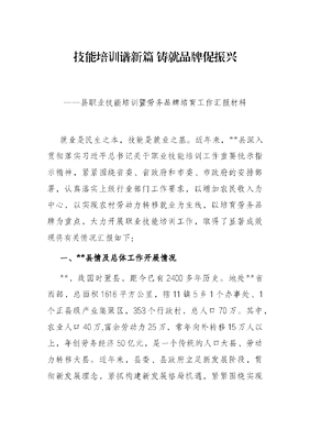 技能培训谱新篇 铸就品牌促振兴——县职业技能培训暨劳务品牌培育工作汇报材料就业是民生之本,技能是就业之基。近年来,**县深入贯彻落实习近平总书记关于职业技能培训工作重要批示指示精神,紧紧围绕省委、省政府和市委、市政府的安排部署,认真落实上级行业部门工作要求,以增加农民收入为中心,以实现农村劳动力转移就业为主线,以培育劳务品牌为重点,大力开展职业技能培训工作,取得了显著成效现将有关情况汇报如下:一、**县情及总体工作开展情况**,战国时置县,距今已有2400多年历史。地处**省西部,总面积1616平方公里,辖11镇5乡1个办事处、1个正县级产业集聚区,353个行政村,总人口70万。其中,农业人口40万,富余劳动力25万,常年向外转移15万人以上,年创劳务经济50亿元,是一个传统的人口大县、劳动力转移大县。近年来,县委、县政府立足新发展阶段,贯彻新发展理念,紧抓构建新发展格局机遇,紧紧围绕实现更高质量更充分就业的目标,坚持就业优先战略,以全民技能振兴工程为统领,以打造劳务品牌为重点,以促进群众就业并实现稳步增收为目的,突出政府牵头、部门联动、群众收益十二字工作法,为县域经济高质量发展发挥了积极作用,为打赢脱贫攻坚战实现全面建成小康社会开启**县全面建设社会主义现代化新征程打下了坚实的基础。我县先后荣获国家级返乡创业试点县、省级返乡创业示范县、脱贫攻坚工作先进单位等荣誉。二、主要做法在具体工作中,我们制定了一强两推三创工作思路,不断助推全县技能培训暨劳务品牌工作高效开展。一强两推三创即:强化政府统一领导,压实工作责任,增强就业工作的使命感、责任感、紧迫感;坚持需求导向,高质量推进全民技能振兴工程和职业技能提升行动两项工作不断提升劳动者技能水平;培育**红家政、**足疗和**艾灸师三大劳务品牌,强化典型引领,突出示范带动,形成了以技能促就业、以就业促增收的良性循环。(一)强化机制聚合力,协调联动惠民生一是建机制。成立由县委常委、常务副县长任组长,人社、科工、农业、商务、住建等部门负责同志为成员的县全民技能振兴工程领导小组,将全民技能振兴工程纳入全县经济社会发展的总体规划之中,全面推进就业重点群体先进制造业、高素质农民、现代服务业、建设行业等技能提升计划。二是细谋划。每年年初,县政府统筹制定工作方案,量化目标任务,细化工作措施,明确时间进度,形成政府统一领导、部门密切配合、社会广泛参与的大培训格局。三是重落实。县政府将全民技能提升工程列入重要议事日程,将对应工作的目标任务列入部门年度重点考核指标,定期组织督导检查,实时跟踪培训工作进展情况,切实做好劳动力转移就业等相关工作,确保高质量、规范化开展各类职业技能培训。四是促长效。在工作推进中,注重以点带面、点面结合,通过集中举办外出务工人员欢送仪式,定期举行全县农民工就业创业工作座谈会,县委、县政府主要负责同志出席会议,成员单位负责人参加会议,邀请以培训实现就业先进典型分享经验、交流心得,突出典型带动和示范引领作用,营造全社会关心劳动者、弘扬劳动精神的浓厚氛围。通过持续不断努力,全县年组织开展职业技能提升培训11000人次,其中补贴性职业技能培训8000人次以上。(二)技能培训提素质,持证上岗显成效一是强载体。为使技能培训工作取得更好的效果,我县根据产业转型、脱贫攻坚、高素质农民培育等工作的需要确立了县人力资源和就业培训中心、县高级技工学校、县农广校、县职教中心4家单位作为技能培训基地,不断提高技能培训的组织化、规模化程度。依托县人力资源和就业培训中心,大力开展就业重点群体技能培训,提高劳动者就业水平和能力;依托县高级技工学校,高标准建成公共实训基地,总投资3498万元,建筑面积10000多平方米,开设机械类、电工电子类、加工类、服务类、维修类、计算机类等专业,大力开展企业职工技能提升培训及岗前培训;依托县农广校,加快培养一批爱农业、懂技术、善经营、会管理的高素质农民;依托县职教中心,以城乡未继续升学的初高中毕业生等青年为重点,做实职业培训,做强学历教育,切实提高县域青少年职业技能水平。二是重宣传。我县大力弘扬和培育工匠精神,把职业技能培训作为重要民生工程,开展了形式多样、内容丰富的宣传活动营造了技能成才的良好环境。以大型活动和招聘会为载体通过电视、网站、微信群等形式广泛宣传、动员劳动者参加各类技能培训,扩大社会影响力;发动、组织社会企业积极参与到全民技能振兴工程中,鼓励利用自身优势积极吸纳农民工和下岗失业人员做好技能培训。大力宣传培训致富典型,发挥示范带动作用,引导群众更新观念,树立自强精神和创业思想;三是分类别。我们在充分开展市场调研的基础上,制定了四结合四围绕抓培训工作举措结合乡村振兴和脱贫攻坚等要求,围绕乡镇扶贫车间、特色种植养殖等行业发展抓特色培训,