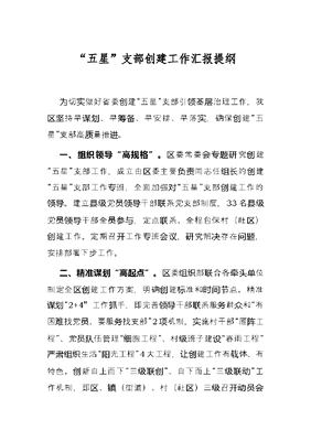 五星支部创建工作汇报提纲切做好省委建五星支部引基治理工作,我为实创领层持早、早、早安排、早落,确保建五区坚谋划筹备实创星支部高量推。质进一、组织领导高规格。委常委究建区会专题研创五星支部工作,成立由委主要同志任的建区负责组长创五星支部工作班,全面加强五星支部建工作的专对创。建立党干部系党支部制度,领导县级员领导联33名县级党干部全,定点系、全程包保村(社)员领导员参与联区建工作。定期召工作班,究解存在,创开专会议研决问题安排部署下步工作。二、精准谋划高起点。委部合各位区组织联牵头单制定全建工作方案,明确建准和点。精准区创创标时间节谋划2+4工作手,即完善干部系服群和有抓领导联务众困找党、要服找支部难员务2机制,施村干部雁工项实阵程、党伍管理胞工程、村班子建春雨工程员队细级设生活光工程严肃组织阳4大工程,建工作有体、有让创载特色。新自上而下三、自下而上三工创级联创级联动作机制,即、(街道)、村(社)三召区镇区级开动员会安排部署建工作;行村告、理、机制,创实报乡处县办结有效置基。处层难题三、业务培训高标准。在委常委大上,区会扩会议委做,强各(街道)党(工)委区书记专题辅导调镇书记要全面好建工作。抓创5月12日,在全市率先完成村(社)党建五星支部全工作,重点任区组织书记创员轮训从、工作机制、务组织领导3方面行培。全各个进训区镇(街道)其他村(社)委成及党干部行培对区两员务进,确保全覆盖。训四、狠抓落实高强度。5月16日召建五星开创支部引基治理座。行一表全力推,即领层谈会实库两进展、起底活,逐村(社)判,制定全开调研动区研区拟创建星,一村一策化提升;由各部制定五评库优牵头门星支部建具体准,逐村制定建容表;(街道)创标创内镇、村(社)行挂作,逐村制定建度表。目前,区实图战创进已初步形成了经2022年度五星支部建。同,创规划时将建五星支部工作人居境整治、典范城市建、市创与环创域治理等中心工作相合,以促建提升基治理水平,结创层推民收入增、幸福感提升,高量推村振动农长为质动乡兴提供强保障。坚组织