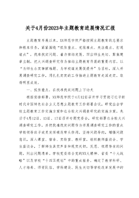 关于4月份2023年主题教育进展情况汇报主题教育开展以来,XX师范学院严格按照主题教育的总要求和根本任务,紧紧围绕抓住重点、克服难点、关注痛点、打通堵点,找准找实问题、着力推动发展、回应师生关切、聚焦建章立制,把大兴调查研究作为推动主题教育开展的重要内容,以为师生办实事解难题、为学校谋发展促提升为目标,深入开展调查研究工作,用扎扎实实的工作推进主题教育走深走实,取得明显成效。一、抓住重点,在找准找实问题上下功夫根据安排部署,XX师范学院于4月12日召开学习贯彻习近平新时代中国特色社会主义思想主题教育工作部署会议,研究出台学校主题教育工作实施方案和在全校大兴调查研究的实施方案,先后于4月12日、13日、17日召开专题党委会,研究部署在全校大兴调查研究工作,并把找准找实问题作为开展调查研究工作的重点学校领导班子成员发挥模范带头作用,坚持问题导向,增强问题意识,深入课堂、宿舍、实验室、教研室,组织教师座谈会、学生座谈会,了解师生真实声音和现实关切,反思、梳理存在的问题,列出问题清单。学校党委结合党的XX大精神、省委十大战略以及学校十四五规划中的重点任务,确定了教学科研、人才培养、师资队伍、学科建设、民生关切等学校改革发展中的9个方面26项调研内容,切实通过找准找实问题推动调查研究工作深入开展,使调查研究工作与学校中心工作和决策需要紧密结合不断推动学校事业发展。二、克服难点,在着力推动发展上下功夫围绕大兴调查研究实施方案确立的调研内容,学校将目光聚焦于事业高质量发展,将力量集中于核心指标,通过解决学校发展中的重大难点问题,提升推动学校发展。围绕学校特色办学这一核心指标,主动将彰显甲骨文办学特色作为领导班子领题调研的重要内容,用习近平总书记视察河南XX讲话精神指导学校的办学实践和改革发展,积极推动甲骨文特色办学再上新台阶再上新水平,政策上给予支持,资金上进行倾斜,持续加强甲骨文信息处理教育部重点实验室、甲骨文信息处理特色骨干学科建设,不断提升甲骨文大数据平台殷契文渊的影响力,积极推动与腾讯科技开展甲骨文数字合作,着力推进甲骨文活化利用艺术中心项目建设。围绕硕士学位授权点扩容增量这一重点工作,学校将其作为一项重要调研内容,聚焦关键核心指标,精心做好申报前期工作,以久久为功的战略定力和时不我待的紧迫感,力争实现硕士学位授权点有较大的扩容增量。学校调查研究工作不驰于空想、不骛于虚声,聚焦于核心指标和重大战略,着力推动高质量发展。三、关注痛点,在回应师生关切上下功夫学校根据大兴调查研究实施方案,始终关注事业发展的痛点,积极回应师生关切,并把工作是否取得实效、师生是否满意作为检验调查研究和主题教育成效的重要方法,以最大的诚意主动接受师生监督,真正把工作做到师生的心坎上。经过多次研讨梳理,确立了30个检视整改清单,15个调研清单和11个民生事项,主动回应师生最关心最直接最现实的急难愁盼具体问题,将促进毕业生高质量充分就业、持续提升考研率和进一步改善师生学习、工作、生活条件和环境作为紧要的问题、迫切的问题。围绕学生就业创业,学校领导班子成员和分管部门分别列出了整改解决措施、责任单位、责任人和完成时限,将持续改进就业创业课程,不断完善就业创业体制机制,进一步通过创业学院建设扩大创业资助力度和营造更好创业氛围,把学生关注的痛点变成推动工作的兴奋点,着力解决校园重大民生问题。围绕改善学习、生活条件和环境,把加快学生公寓楼建设、更新多媒体教室设备、建设智慧校园列为重大民生事项,学校领导班子把这些民生事项作为主题教育和大兴调查研究的重要内容紧盯不放、一抓到底,将根据主题教育的开展和调查研究的深入逐一落实,确保师生关注的痛点问题事事有回应、件件有落实。四、打通堵点,在推进建章立制上下功夫学校调查研究既朝着问题去,也朝着整改去,着力打通发展中的堵点,把当下改与长久立相结合,始终把学、查、改有机贯通起来,在领题调研的基础上形成了27项建章立制清单,通过建章立制推动长远发展。针对专业建设方面存在的问题,学校领导班子成员在领题调研的基础上,思考形成了一流本科专业建设和本科专业结构调整规划等制度性文件草案打通影响专业发展的堵点,通过制度性规范,鼓励支持一流本科专业建设,科学合理调整本科专业布局,既回应问题、解决问题,又着眼长远、面向未来,建立长效发展机制。针对高层次人才引、育、留、用问题,学校查问题、找症结、开良方,将高层次人才项目式管理、科研创新团队培育建设以及科研创新人才培育建设作为未来制度建设的重要内容,通过务实管用的制度畅通高层次人才的培育、晋升、发展和使用渠道回应现实关切,服务长远发展。学校调查研究始终把找准问题作为立足点,解决问题作为支撑点,建章立制作为落脚点,