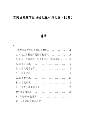 党内主题教育阶段性汇报材料汇编(12篇)目录1.党内主题教育阶段性汇报材料.22.党内主题教育阶段性汇报材料53.党内主题教育阶段性汇报材料(统战部)..94.xx省公安厅135.xx省交通运输厅..156.xx省教育厅187.xx省教育厅218.xx市人社局259.xx省卫生健康委系统.2710.xx省司法厅..2911.财政部xx监管局.3312.xx省农村水利中心35党内主题教育阶段性汇报材料聚焦真字抓学习,聚焦深字抓调研,聚焦敢字抓实干,主题教育开展以来,全省省级政法单位闻令而动,以高度政治思想行动自觉在以学铸魂、以学增智、以学正风、以学促干方面下真功、求实效,努力将主题教育中焕发出的学习、工作热情转化为干事创业的强大动力,转化为推进新时代新征程政法工作现代化的实际成效,为谱写强富美高新xx现代化建设新篇章提供坚强政法保障。开展主题教育是一件事关全局的大事,必须加强组织领导周密部署安排。省委政法委成立由主要领导担任组长的主题教育领导小组,突出政法特色,制定委机关主题教育工作方案,细化工作措施和序时进度,召开委机关主题教育动员会议,迅速在党员干部中掀起了学习贯彻XXX新时代中国特色社会主义思想的热潮。省政法各单位分别召开会议,对开展主题教育作动员、提要求,对照党中央和省委部署要求,立足单位实际,精心编制工作推进表,建立健全统筹调度、检查通报、对接协调等制度机制,真正做到项目化实施、清单化推进、闭环式管理,确保了主题教育有力有序高质量开展。思想是行动的先导,理论是实践的指南。各单位坚持以学思想破题开局,不断加强党的创新理论武装,教育引导党员干部带着嘱托学、带着感情学、带着责任学,认真研读党的XX大报告、党章和《XXX著作选读》等学习材料,在读原著学原文悟原理中进一步筑牢信仰之基、补足精神之钙、把稳思想之舵。省委政法委编制《XXX法治思想应知应会xx题》,创设学思践悟学堂专题研学,组织党员干部围绕XXX法治思想十一个坚持,分专题分享学习成果、交流实践体会,着力以主题教育打开理论与实践的转化通道。省法院建立原原本本学、领导带头学、联系实际学、创新载体学四学机制,举办中国法学名家讲堂讲座,开展xx号青年学堂系列活动,每周组织支部集中学习,确保理论学习全员覆盖、取得实效。省检察院制定详细学习计划,明确深入学习贯彻XXX法治思想,加强新时代检察机关法律监督工作等x个党组中心组学习专题,组织开展牢记嘱托、感恩奋进、走在前列大讨论,着力营造浓厚学习氛围。省公安厅结合公安工作实际,创立厅机关青年学堂,细化专题学习和交流讨论内容,着力引导机关青年民警常学常新、常思常悟。省司法厅细化xx个理论学习项目,分主题编印《学习资料汇编》,筹划组织理论读书班、网上答题、演讲比赛、实境教育等活动,真正推动理论学习入心入脑、笃信笃行。各单位坚持以真学促深化、真信促内化、真用促转化,围绕四个走在前列的重大要求,深入基层摸实情、立足职能出实招,努力以打造高品质法治、塑造高水平平安、推动高效能治理、守护高品质生活、锻造高素质队伍的新成效检验主题教育成果。省委政法委聚焦学与做、查与改、研与用相统一,统筹省级政法单位系统推进xx项面上工作和xx项具体工作,创新举办三联三化四提升活动,组织委机关党支部挂市联县到乡村,围绕长期制约政法事业发展的突出问题、政法领域群众反映强烈的热点难点问题,开展xx项专题调研,在破解难题中提升防风险、保安全、护稳定、促发展的能力水平。省法院由院领导领题带队,深入开展持续深化高质量司法实践,奋力推进审判工作现代化专题调研,院机关各部门按照职能分工,组织实施x至x个围绕中心、服务大局的特色项目。省检察院聚焦高质效履行法律监督职责,围绕服务科技自立自强、构建新发展格局、推进农业现代化、强化基层治理和民生保障等方面,抓好护航高质量发展x项调研、为民办实事xx项清单等自选动作。省公安厅在深入开展重点课题调研的同时,认真做好察民情解民忧暖民心各项工作,部署开展电动自行车交通安全集中整治百日行动,全力维护保障人民群众生命财产安全。省