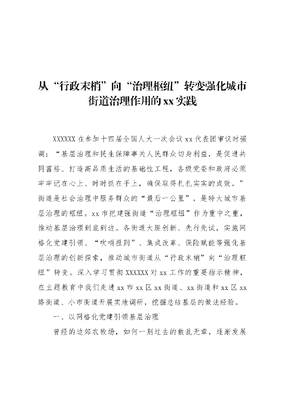从行政末梢向治理枢纽转变强化城市街道治理作用的xx实践XXXXXX在参加十四届全国人大一次会议xx代表团审议时强调:基层治理和民生保障事关人民群众切身利益,是促进共同富裕、打造高品质生活的基础性工程,各级党委和政府必须牢牢记在心上、时时抓在手上,确保取得扎扎实实的成效。街道是社会治理中服务群众的最后一公里,是特大城市基层治理的枢纽。xx市把建强街道治理枢纽作为重中之重,推动基层治理到底到边。各街道大胆创新、先行先试,实施网格化党建引领、吹哨报到、集成改革、保险赋能等强化基层治理的创新探索,推动城市街道从行政末梢向治理枢纽转变。深入学习贯彻XXXXXX对xx工作的重要指示精神,在主题教育中我们走进xx市xx区xx街道、xx街道和xx区xx路街道、小市街道开展实地调研,挖掘总结基层的做法经验。一、以网格化党建引领基层治理曾经的边郊农牧场,如何一别过去的散乱无章,逐渐发展成为祥和文明的宜居新城?xx年来,xx市xx区xx街道用人到格中去、事在网中办的网格化办法,书写了基层治理的xx答卷。其网格化党建做法被中组部作为新时代枫桥经验城市版在全国推广,并入选中宣部等部委主办的奋进新时代主题成就展。创新网格化机制。街道在辖区内构建一张社会管理网,把xx个社区划分为xx个综合网格、xxx个专属网格,将街道内xxxx个单位都纳入其中。坚持人到格中去、事在网中办、难在网中解、情在网中结,一个个单位走访服务,一个个单位征求意见,亲戚越走越近,朋友越交越深,把驻街单位、全体居民与街道社区紧紧聚拢在一起。在实行网格化治理后,街道城市管理工作逐步由原来全市第xx名跃升至第x名。织密建强组织体系。提升基层治理水平,最根本的是加强党的领导,健全严密组织体系,确保基层治理一贯到底、有力有序。探索建立x+x+N组织架构:x是街道党工委;x是在街道党工委下设x个基层党组织,分别为七部一局一中心党支部、社区党委(总支)、综合党委(统筹负责街道辖区内两新组织、微小单位、流动党员等党建工作);N就是七部一局一中心党支部下设若干个业务工作的党小组。在街道党工委的领导下,党的组织触角延伸到辖区内各个角落,稳稳托住基层治理基本面。凝聚共驻共建合力。发动街道辖区内单位成立xx一家亲协会,每年评选表彰xx最美的人。出资单位冠名,做公益开心;党员群众获奖,受表彰也开心。整编组建万家欢等xx支志愿服务队,有xxxx多名居民志愿者活跃在社会治理的方方面面,成为流动的治理站服务站。开展星级物业评比,实行交叉兼职。近年来,xx街道所有小区物业、业委会、业主、开发商之间的关系越来越融洽,小区服务好了,矛盾少了,居民满意了。二、以吹哨报到破解治理难题街道处在基层治理第一线,有不少群众的诉求单凭街道自身力量是办不了的。通过街道吹哨、部门报到,推动治理重心下移、资源下沉,保证基层事情基层办、基层权力给基层、基层事情有人办,是解决群众诉求、化解矛盾纠纷的有效做法。xx区小市街道地处xx、xx、xx三区交界地带,毗邻火车站、汽车站,是传统老工业区、城郊接合部,基层治理面临诸多复杂矛盾、跨区事项。对此,小市街道以吹哨为切口,充分运用吹哨报到机制和优势,把群众急难愁盼的诉求当哨声,以哨为令,相关部门闻哨而动、现场办公,合力破解一批基层治理的老大难问题。一是分类精准吹哨。立足街道治理重难点,梳理涵盖城市建设、综合执法、民生保障等领域群众反映集中、难以解决的事项清单,按照一般工作哨攻坚克难哨分类推进解决。累计发起吹哨xx次,较好解决了xxKTV噪声扰民等问题。二是跨界联合吹哨。针对街道三区交界、两站之北的地域特点,加强与相邻街道、部门沟通联动,协力推进解决跨区、跨部门的问题。针对xx火车站及周边责任田,多次吹响与xx环湖办、地铁公安、车站公安的联合哨,共同维护一方平安。定期与xx等问题,确保街道道路交通安全畅通。三是向下延伸吹哨。坚持基层事情基层办,将吹哨主体由街道向企业、社区延伸,街道作为报到部门,高效解决飞线充电、管道堵塞、私搭乱建等涉及民生的实事,提高居民幸福感满意度。xx第二实验小学旁边的xx因长期人车混行、车辆占道停放,导致高峰期拥堵严重,群众反映强烈。通过社区吹哨,街道启动了集中整治,经历拆违、移车、拓路、整治、美化等x个阶段,校园周边环境旧貌换新颜,群众出行得到明显改善。深入企业走访,及时响应企业在搬迁入驻、项目发展、政策应用方面的吹哨诉求,有力保障了重大项目建设进度。三、以集成改革提升治理效能群众有所呼,改革有所应。xx区xx街道是xx市典型的经适房集中区,辖区内常住人口的xx%为征地拆迁安置居民,社区结构复杂、