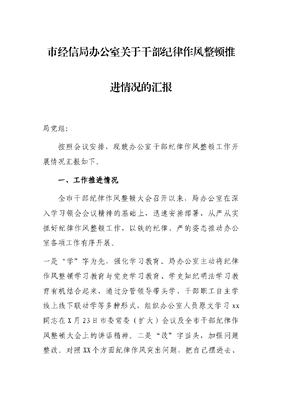 市经信局办公室关于干部纪律作风整顿推进情况的汇报局党组:按照会议安排,现就办公室干部纪律作风整顿工作开展情况汇报如下。一、工作推进情况全市干部纪律作风整顿大会召开以来,局办公室在深入学习领会会议精神的基础上,迅速安排部署,从严从实抓好纪律作风整顿工作,以铁的纪律、严的姿态推动办公室各项工作有序开展。一是学字为先,强化学习教育。局办公室主动将纪律作风整顿学习教育与党史学习教育、学史知纪明法学习教育有机结合起来,通过分管领导带头学、干部职工自主学线上线下联动学等多种形式,组织办公室人员原文学习xx同志在X月23日市委常委(扩大)会议及全市干部纪律作风整顿大会上的讲话精神。二是改字当头,加强问题整改。对照XX个方面纪律作风突出问题,把自己摆进去、把职责摆进去、把工作摆进去,逐一对照、逐项检视、逐个剖析,建立纪律作风整顿个人台账XX个,查摆纪律作风方面突出问题XX个。召开办公室纪律作风整顿讨论会,对查摆出来的问题,建立问题清单XX张,制定整改措施30项,进一步明确了整改时限,确保每个问题改彻底、改到位。三是实字为重,注重工作落实。将纪律作风整顿要求贯穿办公室工作全过程,认真贯彻《进一步提高办文办会质效十一条措施》,扎实开展政府系统办公室三提三创活动,严格执行精文减会各项要求,对发文实行计划限额管理,全面推动OA协同办公和涉密电子政务内网应用,提升公文运转效率。高标准、严要求做好机关安全、机要保密、目标管理、机关财务、档案管理、后勤保障等各项工作。二、存在问题一是对贯彻落实上级重大决策部署督促检查力度不够,抓得不深、抓得不透,没能真正做到事中跟踪、事后检查特别是对一些有工作时限要求的,没能及时督促相关科室在规定时间内按质按量完成。二是办公室中枢作用发挥不好,当遇到科室之间责任边界不清、岗位职责不明,科室之间各吹各的号、各唱各的调,互相推诿扯皮的情况,办公室未能搞好各科室之间的衔接,没有真正做到既努力体现领导要求,又兼顾各方需要。三是办公室没能最大程度的调动每位人员的工作积极性,没有做到人尽其用、岗尽其能,导致少数人员对自己的岗位职责缺乏正确定位和客观认识,离勇于担当、主动作为、积极干事的工作要求还有一定差距。三、下一步工作打算下一步,办公室将继续贯彻落实全市干部纪律作风整顿大会精神,严格对标对表市委关于纪律作风整顿工作要求,认真执行办公室各项规章制度,把纪律规矩内化于心外化于行,在遵规守纪上发挥模范带头作用,在办文、办会、办事中严谨细致,在政务、服务、事务中一丝不苟,发扬勇于担当、攻坚克难、开拓创新、马上办的优良作风,努力提升工作水平,当好局党组的坚强前哨,为高效推进办公室各项工作凝聚强大新动力。