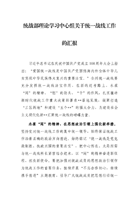 统战部理论学习中心组关于统一战线工作的汇报习近平总书记在庆祝中国共产党成立100周年大会上指出:爱国统一战线是中国共产党团结海内外全体中华儿女实现中华民族伟大复兴的重要法宝。全州统一战线要充分发挥统一战线法宝作用,在新的赶考路上,永葆闯的精神、创的劲头、干的作风,扎实推动新时代统战工作重大决策部署在**落地见效,凝聚打造三区两地和建设五个**的强大合力,为建设社会主义现代化新**汇聚统一战线的磅礴力量。永葆闯的精神,在思想政治引领上强化新举措。坚持党对统一战线工作的集中统一领导,始终保证统战工作沿着正确的政治方向前进。始终铭记统一战线是党克敌制胜、执政兴国的重要法宝,把中心所在、大局所需与统一战线所长紧密结合起来,以闯的精神奋进新征程、担负新使命。要把加强对统战成员的思想政治引领作为统战工作的首要任务,接续开展不忘合作初心,继续携手前进主题教育,引导广大统战成员把思想行动统一到习近平总书记七一重要讲话精神上来,始终紧紧团结在党的周围,坚定不移地走中国特色社会主义道路,切实增强四个意识、坚定四个自信、做到两个维护,确保在思想上政治上行动上始终与党同心同德、同心同向、同心同行。面对统一战线内部结构复杂性前所未有、改革发展任务之重前所未有、矛盾风险挑战之多前所未有、多元思想文化交流交融交锋前所未有,以及所有制形式更加多样、社会阶层更加多样、社会思想观念更加多样的新形势新挑战,要以闯的精神组织全州统一战线深入开展凝心聚力新时代行动。民主党派和无党派人士工作要更加注重合作;党外知识分子和新的社会阶层人士统战工作要更加注重引导;非公有制经济领域统战工作要更加注重健康;港澳台侨和海外统战工作要更加注重凝聚;民族工作要更加注重共同体;宗教工作要更加注重中国化。要高举大团结大联合的旗帜,正确处理一致性与多样性的关系,坚持实现共同目标的方向,夯实共同奋斗的思想基础,拉紧凝聚共识的精神纽带,努力寻求最大公约数,画好最大同心圆在新的赶考路上为同心共筑中国梦和打造三区两地、建设五个**汇聚磅礴伟力。永葆创的劲头,在服务中心大局上彰显新作为。统战工作是为党的中心任务服务的。我们要准确把握大局大势,把围绕中心服务大局作为新时代统一战线的价值追求,坚决做到党指向哪里,统一战线就跟进到哪里;党的中心工作推进到哪里,统一战线的力量和优势作用就发挥到哪里;党的工作触觉延伸到哪里,统一战线的工作手臂就覆盖到哪里。要以创新创业的劲头迎难而上,主动聚焦省、州第十二次党代会确定的发展定位和主攻方向,充分发挥统一战线法宝优势作用,创新开展共建五个**,统战作为有我系列主题活动。用红色**,忠诚有我主题活动推进圆心工程,引导广大统战成员赓续优良传统,知党恩、感党恩、听党话、跟党走;以生态**,发展有我主题活动推进三百工程,引领统一战线助力产业结构调整、绿色低碳发展、投身乡村振兴;用文化**,创新有我主题活动推进灵魂工程,引导统一战线传承民族文化、促进文旅融合、创建精神家园;用开放**,融通有我主题活动推进招引工程,引导统一战线助力深度融入大市场,完善开放大平台,培育外贸大主体,精准招引大项目;用幸福**,团结有我主题活动推进团结工程,引导统一战线助力铸牢中华民族共同体意识,深化民族团结进步创建,助力民族地区经济社会高质量发展。永葆干的作风,在建强统战队伍上展现新形象。全面落实三高四新战略定位和使命任务是习近平总书记对**的殷切嘱托,统一战线责无旁贷。全州统一战线要以干的作风积极助推三高四新战略定位和使命任务在**落地见效。要按照信念过硬、政治过硬、责任过硬、能力过硬、作风过硬的要求,深入推进广大统战干部和统战成员的思想政治、业务能力、纪律作风建设,努力造就一支政治坚定、业务精通、敬业担当、清正廉洁的新时代统战干部队伍和党外代表人士队伍。要全面加强统一战线政治建设。统战机关是政治机关,统战工作是政治工作,统战部门的第一要务是抓好政治建设。要深入学习贯彻习近平总书记关于加强和改进统一战线工作的重要思想,坚持不懈加强理论武装、政策学习和实践锻炼,不断增强政治判断力、政治领悟力、政治执行力,着力提升统战干部的政治引领能力、政策把握能力、调查研究能力、联谊交友能力、推动落实能力,为加强统一战线思想政治引领、凝聚思想政治共识领航把向。要着力提升党外干部的能力水平。建设一支高素质的党外代表人士队伍,是发展多党合作和政治协商事业的关键所在。广大党外人士要不断加强自身建设,不断提高政治把握能力、参政议政能力、组织领导能力、合作共事能力、解决自身问题能力,顺应新时代,把准新要求,坚持学以增智、学以立德、学以广才不断开拓思路、拓