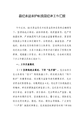委委航律工作县纪监护换届纪汇报今年以来,XX纪委监委在市纪委监委和县委的正确领导下,坚持高起点谋划,高标准推进,高质量落实,把严明换届纪律、严肃换届风气作为政治监督重要内容,紧紧围绕换届工作重点和关键环节,全程跟进、靠前监督、严肃执纪,推动压实各级各部门主体责任,坚决纠治各类违规违纪违法问题,为县乡换届工作有序进行提供了坚强纪律保障。现根据工作要求,将工作开展情况、存在的问题及下步工作重点具体汇报如下:一、工作开展情况(一)坚持高起点谋划,下好先手棋。充分站在全县大局看待县乡两级换届工作,将其视为践行两个维护的重要检验,视为履行监督专责的重要抓手,先后召开县纪委常委会、专题调度会4次,传达学习各级换届文件精神、研究部署换届纪律监督工作,县纪委书记XX同志亲自谋划、亲自指导、亲自推动,充分释放从严监督、做好表率的强烈信号。坚持教育在先、警示在先、预防在先综合运用电视台、报纸、网站、微信公等媒体,广泛宣传十严禁换届纪律要求,发放换届纪律宣传材料7种XXX余份、印制《换届纪律知晓卡》X余份,积极推动换届纪律家喻户晓。抓住换届前、预选前等关键时间节点,选取近几年查处的诬告陷害、恶意举报和其他违反换届纪律的典型案例在全县范围内集中通报曝光,并组织有关党员干部集中观看严肃换届纪律警示教育片《XXX》,提前形成震慑作用。(二)坚持高标准推进,严把重要关口。印发《关于严肃换届纪律加强换届风气监督的通知》,建立信息共享、联合检查、线索移送等协同监督机制,对加强换届监督检查工作作出总体安排和具体指导。强化工作合力,联合组织、民政、公安等部门建立协作监督机制,成立XX个换届风气督查组,聚焦换届选举重点环节、主要步骤和问题多发时段,综合运用现场督导、随机询查、明察暗访等方式对各乡镇(街道)换届纪律和制度规定执行情况开展督导检查,切实把监督贯穿换届工作全过程、各环节,截至目前,共监督检查换届工作责任单位(部门)XX人次、乡镇(街道)XX人次,约谈提醒、批评教育干部XX人次,下发纪检监察建议书XX份,督促整改换届工作不规范、程序不严谨、纪律不严肃等问题XX个。把好党风廉政意见回复关,多方联查、综合把关,切实做到对拟调整干部精准画像,截至目前,稳妥审慎回复党风廉政意见XXXX人次,对处分在影响期XX人提出不得任高于原职务的反馈意见;对开除党籍、处分在留察期间、恢复党员权利不满两年以及正在立案调查的XX人,提出不符合参选条件的反馈意见,严防带病参选带病使用等问题,助力选优配强村级组织带头人。(三)坚持高要求破题,切实履行好纪检监察主责主业。充分畅通信访举报渠道,在全县公开县、乡两级纪委监委换届工作专项信访举报电话及接访地址,搭建了来电、来信、来访、网络和微信公举报五位一体信访举报平台对违反十严禁尤其是拉帮结派、拉票贿选、跑官要官说情打招呼、干扰破坏选举等违反换届纪律的问题,及时受理、优先办理,确保换届问题重要线索不流失、受理时限不拖延、换届工作不耽误,截至目前,全县纪检监察机关共收到涉及换届纪律的信访举报XX件,均已按规定程序进行处置。强化初访化解力度,对换届期间信访举报问题严格执行信访案件处理程序和办结时限的规定,做好核查上报、矛盾化解等工作,确保群众反映的问题调查到位、处理到位、反馈答复到位,真正把问题消灭在萌芽状态,为换届工作的顺利进行创造和谐、稳定的环境。从严从快监督执纪问责,对收到的涉及换届纪律以及可能影响干部参选的问题线索,按照优先办理、深挖细查、快查快结原则,接到一件、核实一件,查处一件,做到及时回应群众关切,维护好良好换届风气,截至目前,共查处违反换届纪律案件XX件,党纪政务处分XX人,组织处理XX人,在全县范围内形成强力震慑。(四)坚持高标准落实,做好后半篇文章。积极落实澄清保护和诬告陷害快速处置机制,对受到诬告陷害、不实举报的,及时予以澄清不影响提名使用,对恶意举报和诬告陷害行为,联合相关部门予以快速打击、严肃处理。坚持正面引导和反面警示教育相结合,以新任村两委干部培训工作为契机,将县纪委监委拍摄的专题警示教育片《XX》和近年来查处通报的群众身边腐败和不正之风典型问题纳入培训重要内容同时,结合党史学习教育,以课堂+实践理论+观摩相结合的方式,组织新任村两委干部到县警示教育馆现场接受警示教育,通过上好干部履新第一课,使其真正明红线、知高线、守底线。把新班子及其成员纳入重点监督范围,纪委书记带头与新任职领导干部进行任前集体廉政谈话,切实打好党规党纪预防针,拧紧拒腐防变安全阀。二、工作中存在的主要问题一是个别党员干部对换届工作重视程度不够,认识上存在误区,有的认为自己是老同志,经历过多次村级换届,思想上麻痹大意,导致工作上不够积极,跟踪不够到位,工作效率不高;二是对换届纪律