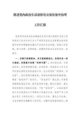推进党内政治生活庸俗化交易化集中治理工作汇报我市将党内政治生活庸俗化交易化集中治理作为深入贯彻落实习近平总书记关于严肃党内政治生活重要论述的具体行动和持续推进全面从严治党的有力举措,聚焦工作思路、学习成果、治理效能,助推党内政治生活规范化、标准化。一、多部门协调联动,多方案统筹指引,各项任务一体化推进,实现集中治理有章可循。市纪委监委、市委组织部、宣传部加强沟通,各司其职,形成强大工作合力市纪委监委机关做好查处工作,充分利用好两清单、两台账,及时发现问题线索;市委组织部做好统筹谋划,确保规定动作抓到位,自选动作抓扎实;市委宣传部强化舆论引导,提升党员参与度、群众知晓率,着力营造积极向上的舆论氛围。下发任务书,认真细致研究自治区党委办公厅明确的六项重点任务,制定**市《实施方案》《宣传方案》,实化工作目标、量化工作标准,为全市集中治理提供了指导性、可操作性较强的指引;确定施工图,第一时间制定《计划安排表》,明确工作内容、责任主体、期限要求,压实各级党组织工作责任,强化任务落实;制作验收单,建立健全统筹调度机制实行两周一调度、每月一报告,适时了解掌握工作进展、谋划下一步工作重点;成立5个检查指导组,每月至少深入所联系地区部门单位指导1次,充分发挥监督责任,通过四看标准对各地区各部门各单位工作方案进行审阅把关,实地指导做到各级党组织个性要求、客观评价,为集中治理把好关、尽好责。截至目前,各级检查指导组共开展现场指导261次,提出工作建议571条。二、创新学习形式,实现党员干部思想认识、行动自觉双提升。坚持正面引导与警示教育相结合。利用学习研讨、主题党日、专题党课等形式,灵活为各级党组织、全体党员干部明确六个一学习目标;深入挖掘宣传各级党组织和党员干部的典型做法和经验在各类主流媒体、公众号进行刊发;对专题教育提档升级,开展专题政治谈话,坚定党员干部理想信念。截至目前,共组织开展党委(党组)理论学习中心组专题研讨308次,党支部专题学习702场次;在内蒙古电视台、内蒙古日报、**日报等媒体刊物报道、刊发相关内容8期,引发热烈反响。结合地区实际,深入学习自治区党委关于以案促改相关要求,用身边事教育身边人;充分利用党员政治生活馆、全面从严治党警示教育基地等阵地开展警示教育。截至目前,各级党组织开展各类警示教育584场次,受教育党员达1万余人次。三、发扬斗争精神,用好自查自纠利器,刀刃向内查摆问题,边查边改、真查真改,不断增强党性、端正党风。突出党委(党组)对照问题清单11种现象深入查,系统梳理党的十九大以来在纪检监察、巡视巡察、群众反映、信访举报中发现的党内政治生活庸俗化交易化问题,对整改情况进行回头看;全体党员干部围绕11种现象全面查,逐人列出问题清单,建立《整改台账》,制定务实高效整改措施。截至目前,全市各级党委(党组)共查摆问题1264个,制定整改措施1382项,已整改完成267项;党员干部查摆问题17949个,制定整改措施18542项,已整改完成3718项。深入开展承诺践诺守诺,全体党员干部通过签字背书的形式,进一步巩固专题教育和自查自纠成效,做到从现在改起,从社交圈、朋友圈、生活圈严起,截至5月5日,承诺书签订率达100%。及时总结提炼集中治理中的亮点经验做法,不断固化专题教育、查纠整改成果,推动建章立制,把当下改和长久立结合起来,让党员干部始终心有所畏、言有所戒、行有所止。