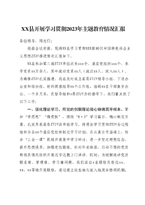 XX县开展学习贯彻2023年主题教育情况汇报各位领导,同志们:根据会议安排,现将XX县学习贯彻XXX新时代中国特色社会主义思想ZTJY推进情况汇报如下。XX县参加第二批ZTJY单位共有xxx个、基层党组织xxx个,参学党员xx万余人,其中流动党员xx人(流出xx人、流入xx人)。为确保ZTJY扎实推进,我县及时成立县委ZTJY领导小组,下设办公室和综合组、材料简报组等xx个工作组,抽调xx名干部集中办公。一个多月来,在督导组和s委ZTJY办的指导下,我们重点抓了以下工作:一、强化理论学习,用党的创新理论凝心铸魂筑牢根本。紧扣学思想强党性,围绕8+1学习篇目,精心制定方案,扎实开展县委ZTJY读书班学习。将理论学习贯彻ZTJY全过程组织全县xx个基层党组织制定学习计划,在认真自学基础上,结合三会一课积极开展集中学习研讨,进一步坚定理想信念、提升思想境界、加强党性锻炼。针对年老体弱、行动不便的党员都视其情况组织开展送学送教上门活动。同时,为破解流动党员联系难、管理难、学习难问题,我们派出x名联络员前往xx、xx、xx等地开展联络,通过建立流出地与流入地双向协调机制,确保其学习教育不缺课不掉队。目前,xx名流出党员均已收到学习礼包,并到流入地党支部报道;xx名流入党员已就近党组织报到参学。二、深入调查研究,扎实深入基层掌握实情体察民意。按照党中央关于在全党大兴调查研究工作要求结合ZTJY,组织广大党员干部特别是县级领导干部扑下身子、下沉一线,深入农村、社区、企业、医院、学校等基层单位开展调查研究,帮助群众解决急难愁盼问题。按照xx书记、xx省长在XX县调研指示要求和xx、xx《调研报告》精神,县四大班子和示范区工委结合实际认真制定调研方案,xx名县级领导班子成员制定调研计划,共选定xx个选题(制约高质量发展方面xx个、群众关心关注问题xx个、全面从严治党方面xx个、其他方面xx个)。截至目前,县级领导干部已开展调研xx人次。三、狠抓检视剖析,在推动整改整治中纠四风树新风。xxx委督导组反馈第一批问题清单xx个问题已形成整改清单,目前已完成问题整改xx个。各县级领导班子成员紧扣理论学习、政治素质、能力本领、担当作为、工作作风、廉洁自律6个方面,聚焦全省ZTJY工作会议列举的20种突出问题表现,深入查摆自身问题,并形成问题清单上报州级。截至目前,县级层面检视问题xx条,制定整改措施xx条;县级领导班子检视问题xx条,制定整改措施xx条;县级领导干部个人检视问题xx条,制定整改措施xx条这xxx条问题正在有序推进整改。四、全力推动发展,以工作实际成效践行为民宗旨。紧紧围绕高质量发展这个首要任务,以强化理论学习指导发展实践,推动高质量发展、提高人民生活品质。自开展ZTJY以来,在粮食安全方面,牢牢守住全县粮食作物播种面积34.43万亩红线,预计完成秋冬季种植面积xxx万亩,全年粮食产量预计较上年增加xxx%。在乡村振兴方面,深入实施六大机制,紧盯群众增收1+2+3关键指标,全面落实三增长两双百一提升要求,守住了不发生规模性返贫底线。在基础设施建设方面,开工建设十大工程重点攻坚项目xxx个,完成投资xxxx亿元。在特色产业发展方面,持续推动xxxxx产业规模化,今年累计完成中药材种植xxxxx万亩、百香果标准化种植xxx万亩、香禾糯种植xxxx万亩,猪存栏突破xxx万头。在民生保障方面,年初确定的十件实事稳步推进,新职校已投入启用,县中医医院新院区已完成装修,宰便医疗次中心建设正有序推进。同时,我们积极与省委督导组、s委ZTJY办的沟通对接,按时保质完成规定工作;做好分类指导,累计下发ZTJY工作提示xxx期,对xxxx个基层党组织的联络服务工作已实现全部覆盖;加强宣传引导,严格把好宣传基调和导向,共刊发新闻宣传报道xxx条次,编辑ZTJY专报、简报xxx期;加强舆情监测,坚决杜绝低级红高级黑现象。ZTJY开展以来,我县虽能按时完成各项规定动作,并取得一定成效,但我们也还存在超前谋划、深入推进不够等问题,在运用新理论指导实践、推动工作,帮助群众解决实际困难问题方面还做得不够,距高标准还有差距。下步,我们将认真按照本次会议要求,特别是xxx书记的讲话精神,紧扣学思想、强党性、重实践、建新功总要求,努力在以学铸魂、以学增智、以学正风以学促干方面取得实实在在的成效。一是紧盯规定动作,适度超前谋划。按照s委、s委相关工作提示,积极开展好专题党课、四下基层、提升整顿等工作。二是持续深入学习,提升服务本领。持续深入开展理论学习研讨,推动党员领导干部树牢正确的权力观、政绩观、事业观,增强推动高质量发展、服务群众、防范化解风险等本领。三是深入调查研究,促进担当作为。运用党的创新理论研究新情况