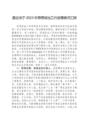 国企关于2023年思想政治工作进展情况汇报思想政治工作是党的优良传统、鲜明特色和突出政治优势是一切工作的生命线,是加强党的建设、推进全面从严治党的重要抓手。进入新时代,思想政治工作的价值进一步被挖掘。XXXXXX在党的XX大报告中提出,用党的创新理论武装全党是党的思想建设的根本任务。全面加强党的思想建设,坚持用新时代中国特色社会主义思想统一思想、统一意志、统一行动,组织实施党的创新理论学习教育计划,建设马克思主义学习型政党。公司党委始终以XXX新时代中国特色社会主义思想为指导,深入学习贯彻XXXXXX关于思想政治工作的重要论述,坚持理论与实践相结合,用新时代思想政治工作激发创先争优动能。通过智育启慧、思育润心、劳育强体三育并举,不断启迪智慧、厚植德行、成风化人,切实将思想政治工作优势转化为企业发展优势,积累了一些工作经验。一、智育启慧,举旗定向引领人。坚持理论武装常态化,全方位增进全员对党的创新理论的政治认同、思想认同、理论认同、情感认同,不断巩固高质量发展的共同思想基础。今年,公司党委结合开展学习贯彻XXX新时代中国特色社会主义思想主题教育,统筹衔接、上下联动,筑牢信仰之基、补足精神之钙、把稳思想之舵。抓好制度执行,强化推进集中学。完善党委理论学习中心组、党支部三会一课等各层级学习制度,深化党委书记(党委委员)讲党课、党支部书记讲党课,坚持读原著、学原文、悟原理,加强思想淬炼、政治历练、实践锻炼、专业训练,把学习成效持续转化为推动改革发展的生动实践。坚持自主自发,积极推进个人学。以学以致用、解决实际问题,不断增强各级党员领导干部适应新时代党和国家事业发展要求的能力为目的,结合各自工作实际,以线上线下的方式自主深入学习,不断提高理论武装的针对性实效性。突出学习重点,定期推进开班学。举办专题读书班,通过更聚焦的学习,进一步锤炼党性修养,引导党员干部争做XXX新时代中国特色社会主义思想的坚定信仰者和忠实实践者。同时,在挖掘红色资源,全面推进走出去学上,深挖理论和实践富矿,用好特色教材,结合学习贯彻XXXXXX治理木兰溪的重要理念和关于保护好湄洲岛的重要嘱托,用心回味、温故知新。在聚焦当地专家,深化推进请进来学上,适时邀请当地党建教授进行党的创新理论专题宣讲。在紧扣实地调研、基层宣讲,精准推进沉下去学上,坚持把理论学习与实地调研、基层宣讲结合起来,一方面领导班子、中层干部以落实一线帮扶工作,全面深化理论和实际问题研究,为公司开展思想政治课题研究直接获取第一手资料;另一方面牢牢把握在学懂弄通做实上下功夫的要求,广泛深入、严谨生动开展宣讲活动,把党的创新理论讲清楚、讲明白,让群众听得懂、能领会、可落实。二、思育润心,春风化雨服务人。充分发挥党工团的作用,以解决职工关心关注的热点问题为切入点,由市公司部门带头深入各县区公司党支部,在准确把握职工诉求的基础上,解决了一批职工思想问题和实际问题,达到了化解矛盾、凝心聚力的效果。畅通诉求表达渠道,把思想政治工作做细。借助党委成员服务基层联系点制度、总经理(工会主席)接待日活动、职工群众座谈会、三必访、四必问、五必谈、支部周复盘等形式,多渠道畅通信息交流,坚持开大门、真开门,准确把握职工思想脉搏。注重解决实际问题,把思想政治工作做实。通过强化问题分析,提出意见建议、抓好整改督办,促进工作落实,对职工反映的实际问题与合理诉求,一盯到底,抓好落实,切实为职工排忧解难。积极跟进思想引导,把思想政治工作做深。一方面坚持敏感问题不回避、不掩饰,多渠道讲清政策、讲明道理。针对职工反映的热点难点问题,协调专业部门深入基层开展政策解释工作,努力化解矛盾,疏解情绪。另一方面结合年度重点工作任务,围绕破解营销难题,特别是年终岁末营销任务转换、职工岗位调整、营销指标分配的关键期等,进一步摸清职工思想底数,拉直职工心中问号。三、劳育强体,知行合一凝聚人。坚持从实践中回归劳动课,围绕强国兴企,大力挖掘企业发展中的思政资源,重在实践中强调价值观的同频共振,进一步促进思政教育资源挖掘与企业发展需求相融合,引导职工以实际行动诠释劳动最光荣。与央企责任践行相结合,常态化从践行央企责任的思政视域,激发全员国之大者担当。聚焦民生服务,引导全员对内代表客户,发力倾听客户心声专项活动,做强服务监督,强化服务问题治本解决;对外代表公司,升级20客户日,塑造更暖的服务口碑,提升客户满意度。同时,将爱心与温度在残障人士、老年人、军人军属等重点群体中传递,推出智慧助老、数字助残、拥军优属等活动,让科技进步的成果惠及每一个群体。通过身体力行,汇聚砥砺奋进、自强不息的强大精神力量。与主责主业履行相结合,充分发挥思想政治工作引导人、塑造人、鼓舞人的柔性管理作用,科学谋划、系