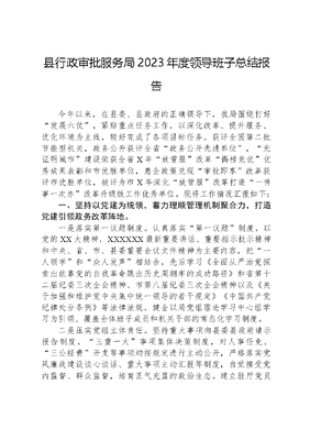 县行政审批服务局2023年度领导班子总结报告今年以来,在县委、县政府的正确领导下,我局围绕打好发展六仗,紧贴重点任务工作,以深化改革、提升服务、优化环境为主线,较好完成了各项目标任务。获评全国第二批节能型机关,政务公开获评全省政务公开先进单位,无证明城市建设荣获全省X年放管服改革揭榜竞优优秀成果表彰和市优胜单位,惠企政策兑现审批即享改革获评市优胜单位,被评为市X年深化放管服改革打造一件事一次办改革升级版工作优秀单位。现将工作情况汇报如下:一、坚持以党建为统领,着力理顺管理机制聚合力,打造党建引领政务改革阵地。一是落实第一议题制度。认真落实第一议题制度,以党的XX大精神,XXXXXX最新重要讲话、重要指示批示精神和中央、省、市、县委重要会议文件精神为主要内容,把一人领学和众人发声相结合,先后学习《全面从严治党探索出依靠党的自我革命跳出历史周期率的成功路径》和省第十二届纪委三次全会精神、市第八届纪委三次全会精神以及《关于加强和维护党中央集中统一领导的若干规定》《中国共产党纪律处分条例》等法律法规,健全以局党组理论学习中心组学习为引领、覆盖全体班子成员和机关干部的常态化学习制度。二是压实党组主体责任。坚持重大事项向县委县政府请示报告制度,三重一大事项集体决策制度,对人事任免、三公经费开支等事项均按规定进行主动公开,严格落实党风廉政建设谈心谈话、重大事项主动汇报等制度,自觉接受党内监督、群众监督,培育正气充盈的政治生态。建立驻厅党员联络机制,设立党员责任区9个,联络驻厅党员104名,设立党员示范岗窗口22个,以一月一课一片一实践为抓手,把局党组理论学习中心组与专题研讨会相结合,邀请宣讲团讲师到我局授课6次,党组书记、党支部书记带头讲党课5节,组织全体党员干部观看党史、警示、廉政等主题影片12部,开展实践活动20余次,汇总学习体会100余份,全面加强干部理论武装能力,筑牢思想防线。三是抓实意识形态建设。把意识形态工作纳入党建工作责任制、领导干部目标管理和民主生活会、个人述职报告的重要内容,与各项重点工作同安排、同部署、同落实,建立意识形态工作研判机制和意识形态报告制,健全《县行政审批服务局意识形态责任分工》和《县行政审批服务局网络意识形态责任制分工》,及时上报意识形态领域重大情况,累计召开4次党组会议研究意识形态工作,并按照一岗双责要求,坚持党组书记带头抓、分管领导具体抓,形成工作合力。二、坚持以调研为抓手,着力促进服务质效大提升,锻造实干为民政务服务团队。一是大兴调查研究。组织驻厅单位深入开展走基层、找问题、想办法、促发展活动,开展建言献策大讨论,党员进社区入户走访,汇集了急难愁盼问题清单。今年来,发放政务服务调查问卷100余份,调查研究涉及公安、人社、乡村振兴、政务公开、政务服务5类领域,问题38项,收集中肯意见建议37条。二是提升队伍素养。出台《县政务服务中心领导带班巡查制度》《县政务服务中心窗口行业规范(试行)》,建立领导带班巡查大厅四个一、窗口行业规范等长效机制,常态化开展帮代办、延时办、上门办政务服务,进一步提振政务队伍素质形象。与驻厅单位党组织开展四亮结对共建活动11次,集中学习4次,开展大讨论3次,到株洲、衡阳等地学习先进经验,撰写高质量调研报告2篇呈送县政府,组织全县政务阵线400余名干部召开党的XX大专题党课,上思想大党课,聚政务大合力,政务队伍思想认识、素质形象全面提升。三是加强宣传推介。对创文打好发展六仗主题教育政务督查组工信息大兴调查研究等重点信息报送任务实行专人专办。对湘易办揭榜竞优等重点工作信息宣传,进行重点攻坚。今年以来,共发布通讯75篇,其中湘易办跨省通办上门办等重点工作稿件19篇,在X发布改革工作动态2篇,被县委办信息快报采用3篇,省市级媒体上稿33篇。三、坚持以人民为中心,着力破解服务难题解民忧,营造清廉高效政务营商环境。一是持续深化政务信息公开。改版升级基层政务公开专栏和专区(专窗),政府网站发布信息5.1万多条。获评五年一度(20XX—2022)全省政务公开先进单位。在全省政务公开评估中,被列为得分靠前的县市区予以通报表彰。县政府门户网站获评全市首届十佳政策解读网站。守护好一江碧水政务公开主题月活动经验做法在湖南日报、省政府网推介。政务公开工作两次在全市作典型发言。8月份,在全省项目办(世行结果导向贷款湘赣边区乡村振兴地方政府治理能力提升项目联席会议办公室)联席会议上作为唯一典型交流发言,财政预算公开监测统计数据分析以工作简报形式向全省推介。二是深化一网通办,打造一件事一次办升级版。已落实省市部署的出生、婚姻、退休、身后等19个一件事