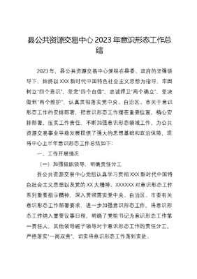 县公共资源交易中心2023年意识形态工作总结2023年,县公共资源交易中心党组在县委、政府的坚强领导下,始终以XXX新时代中国特色社会主义思想为指导,牢固树立四个意识,坚定四个自信,忠诚捍卫两个确立,坚决做到两个维护,认真贯彻落实党中央、自治区、市关于意识形态工作的安排部署,把意识形态工作摆在重要位置,精心安排部署,压实工作责任,不断加强意识形态领域工作,为公共资源交易事业平稳发展提供了强大的思想基础和政治保障,现将中心上半年意识形态工作总结如下:一、工作开展情况(一)加强组织领导,明确责任分工县公共资源交易中心党组认真学习贯彻XXX新时代中国特色社会主义思想以及党的XX大精神、XXXXXX对意识形态工作系列重要指示精神,深入贯彻落实党中央、自治区、市委有关意识形态工作部署要求,进一步加强意识形态工作,将意识形态工作纳入重要议事日程,明确了党组书记为意识形态工作第一责任人,其他领导班子领导对于意识形态工作的责任分工,严格落实一岗双责,切实将意识形态工作落到实处。(二)坚持理论学习教育,科学武装头脑一是认真落实第一议题制度。及时跟进学习贯彻XXXXXX重要讲话和指示精神,以党组和理论中心组扩大学习为主要载体,强化执行力度,上半年,组织党组中心组学习10次,学习XXX重要讲话精神材料、中央及自治区重要会议精神及主要领导讲话精神、文件材料每周一次。二是严把意识形态领域关。把意识形态工作与党的建设紧密结合,切实把党的政治纪律和政治规矩摆在首要位置。三是抓好党员干部学习。持续抓好三会一课学习制度,组织党员干部积极主动开展学习,深入推进思想政治建设和作风建设,不断提升队伍的思想政治素养和业务工作能力,确保意识形态工作走深走实。(三)增强舆论引导,营造良好氛围一是增强舆论引导。注重把握不同时期宣传重点,提高舆论引导水平,对一些苗头性问题努力做到早预见、早发现。对重大事件舆情及时注重提前介入,防患未然,加大网络舆情跟踪监督,对单位先进典型、先进事迹及时报道,确保正面宣传、正向引导。二是强化阵地建设。充分利用三务公开平台、宣传展板等形式,全方位开展意识形态工作宣传,切实加强社会舆情和网络舆情的分析、研判、处置。针对网络舆情,实时监控,实时跟进,及时做好舆情监测与上报工作,紧扣党员干部所思所想,不断创新载体和形式,提高党员干部群众的思想认识。(四)强化廉洁教育,筑牢思想防线一是严格贯彻落实中央八项规定精神,年初组织召开了党风廉政建设专题工作会议,深入学习了《中国共产党组织工作条例》等文件精神,教育引导全体干部职工增强党性教育、强化规矩意识。二是广泛开展警示教育,教育全体党员干部引以为戒。三是积极组织职工学习保密工作相关知识,切实加强保密工作与业务工作同步部署,防止出现涉密风险隐患。二、存在的问题县公共资源交易中心党组在强化意识形态方面做了大量的工作,也取得了一定的成绩,但还存在一些不足,主要体现在:一是党员干部宣传思想政治工作的方法、形式、途径还需要进一步探索和发现;二是对全体干部职工的宣传思想政治工作的影响力、渗透力、战斗力还需要进一步提高;三是对干部职工在意识形态方面的思想倾向,对意识形态工作的真实态度等调查研究不够深入,缺乏深度掌控。三、下一步工作计划(一)提高政治站位,强化主体责任落实。进一步树立党组书记作为第一责任人的责任意识,牢固树立抓好意识形态工作也是最大政绩的正确政绩观,自觉把意识形态工作摆在重要位置。抓好落实意识形态相关制度,组织干部职工全方位、深层次学习XXX新时代中国特色社会主义思想等意识形态理论内容,做到真学真懂、入心入脑,切实把思想和行动统一到党的XX大的精神上来。(二)强化责任担当,扎实做好意识形态工作。进一步加强意识形态工作与党建工作的紧密结合,切实把意识形态工作作为党的建设和干部队伍建设的重要内容,纳入重要议事日程,纳入党建工作责任制,与党建工作同部署,同落实,同检查,同考核。(三)加强舆论引导,持续巩固主流阵地。加强意识形态工作舆论宣传力度,通过集中学习、发布简报、思想交流等形式,不断加大宣传力度,增强积极信息、正向能量的传播力和影响力。充分发挥微信公众号、微信工作群,全方位、深层次、多角度地开展正面积极的思想舆论宣传工作,进一步凝聚思想共识,为我县信访事业高质量发展提供强大的精神动力。