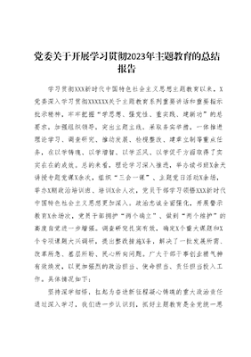 党委关于开展学习贯彻2023年主题教育的总结报告学习贯彻XXX新时代中国特色社会主义思想主题教育以来,X党委深入学习贯彻XXXXXX关于主题教育系列重要讲话和重要指示批示精神,牢牢把握学思想、强党性、重实践、建新功的总要求,加强组织领导,突出主题主线,采取务实举措,一体推进理论学习、调查研究、推动发展、检视整改、建章立制等重点任务,在以学铸魂、以学增智、以学正风、以学促干方面取得了实实在在的成效。总的来看,理论学习深入推进,举办读书班X余天讲授专题党课X余次,组织三会一课、主题党日活动X余场,举办X期政治培训班、培训X余人次,党员干部学习领悟XXX新时代中国特色社会主义思想更加深入。政治忠诚全面强化,开展警示教育X余场次,党员干部拥护两个确立、做到两个维护的高度自觉进一步增强。调查研究扎实有效,确定X个重大课题和X个专项课题大兴调研,提出整改措施X条,解决了一批发展所需、改革所急、基层所盼、民心所向问题。广大干部干事创业精气神有效焕发,以更加强烈的政治担当、使命担当、责任担当投入工作。具体情况如下:坚持深学细悟,扛起为奋进新征程凝心铸魂的重大政治责任通过深入学习,我们进一步认识到,抓好主题教育是全党统一思想意志的有力举措,意义重大。X肩负着重要使命任务,唯有用XXX新时代中国特色社会主义思想凝心铸魂,才能不惧惊涛骇浪、坚定勇毅前行,才能始终以理论上的清醒和坚定确保政治上的清醒和坚定。按照党中央及X党委部署,X党委扛起政治责任和主体责任,高站位谋划部署,高质量组织实施,成立领导小组和工作专班,制定细化各类方案,多次召开党委会和专题会议,定期听取情况汇报,压茬推进各项工作。在直属机关领导班子成员主题教育示范读书班上,X名领导干部集中学习,确保了理论学习的质量效果。X党委充分发挥头雁效应,把强化理论武装、铸牢政治忠诚作为主题教育首要任务,推动理论学习往深里走、往心里走、往实里走。一是突出抓好原原本本学。X党委发挥领学作用,带头举办读书班,开展自学读书X次、专题研讨X次,示范引领党员干部静心读原著、学原文、悟原理。各单位通过交流研讨、宣讲阐释、案例教学、专题培训等方式,在真学真信真用、学懂弄通做实、深化内化转化上下功夫。二是突出抓好联系实际学。X党委紧扣坚定不移推进全面从严治党、推进社会治理体系和能力现代化等X个专题集中深入研讨,深入学习XXXX思想特别是XXXXXX关于新时代X工作的重要论述。各单位有针对性开展研讨活动,交流运用党的创新理论解决实际问题的具体案例,更好把握规律特点,推动X工作高质量发展。三是突出抓好带着问题学。党委委员紧密结合工作实际,讲授专题党课,带领党员干部感悟思想伟力,提升解决实际问题的能力本领。各单位系统梳理、重点研讨XXXXXX关于本业务领域的一系列重要论述,将学习成果转化为谋划发展的思路、履职尽责的举措、改进工作的方法。针对部分单位存在学习与业务工作贴合不够紧等问题,主题教育办及时发出提示函、督办函,要求整改不足,完善清单,避免空对空两张皮。主题教育中,X党委抓好领导干部这个关键少数,牢牢把握X机关是政治机关的定位,组织党员干部全面学习领会XXX新时代中国特色社会主义思想的科学体系、精髓要义、实践要求,不断夯实拥护两个确立、做到两个维护的思想根基。此外,我们始终坚持严督实导、跟踪问效,将各直属单位纳入督导范围,开展延伸督导,成立多个督导组,开展3轮次以上全覆盖督导,既敢于唱黑脸,又善于服务帮促,累计督导单位342家次,谈心谈话1215人次,提出意见建议1439条,有力推动工作深入开展,确保主题教育上下贯通、层层见效。一、强化问题导向,增强谋划推动X工作的科学性系统性。坚持和加强党对X工作的绝对领导、捍卫X、服务保障高质量发展,聚焦制约X工作现代化和高质量发展的根本性基础性问题、涉及X工作长远发展的深层次关键性问题,X党委研究确定X个事关全局全警的重点调研课题。主动到X情况复杂、工作压力相对较大的地方,X党委成员带队赴X等地,听真话、察实情、出实招,努力使调查研究成为开展工作的先导、解决问题的法宝。主动将X工作置于国之大计、党之大计中思考。X组建学习贯彻党的XX大精神领导小组专题研究组,确定X个重点课题和X个子课题,形成X多篇调研报告。各单位实行领导领题、调研开路,下沉基层、深入一线工作法,深入X个地市调研,形成报告X份,发现问题X个,确保了调查研究靶向精准。在X党委主题教育调查研究成果交流会上,X党委同志针对调研中反映和发现的问题,深入开展交流讨论,针对性提出对策措施,深化了形势认识,凝聚了工作共识,明确了整改思路,进一步增强了谋划推动X工作的科学性、系统性、前瞻性、创造性。对XXX新时代中国特色社会主义思想的认识更加深入,对两个确立决定性意义的领悟