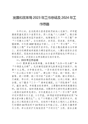 发展和改革局2023年工作总结及2024年工作思路今年以来,县发改局在县委县政府的关心支持下,牢牢把握高质量发展这个首要任务,深入实施八八战略,强力推进创新深化改革攻坚开放提升,统筹推进三个一号工程和十项重大工程,全力拼经济、抓项目、促改革、优环境、强保障。半年度GDP增速全市第三,三个一号工程、十项重大工程中6项获得五星评价,五星工程总数排名全市第二。成功创建县城承载能力建设省级试点,入围全省服务业创新发展区。低效林改造相关做法在全省共同富裕先行研讨会上作经验分享,并获徐文光常务副省长批示肯定。一、2023年工作总结(一)聚焦重大决策部署,全力推进三个一号工程和十项重大工程。扎实推进创新深化改革攻坚开放提升,统筹十大工程,力争排名进位。一是专班运作闭环推进。组建一办三组三专班十小组,建立统一例会、统一简报、统一督导、统一晾晒、统一考评的五统一机制,健全周碰头、月调度、季分析、年总结的例会推进机制。以向上对接、横向会商、向下服务三个一清单抓调度,以四张清单为抓手,截至10月,年度重点任务清单、主要指标清单进度整体达标,22项任务、指标进度超前,问题清单已按时完成整改销号。二是锚定指标争先进位。半年度我县在三个一号工程星级评定中获得3个五星、1个四星,19项省对县晾晒指标实现4绿5蓝9黄1橙无红;在十项重大工程星级评定中,我县三项工程获得五星评价,连续两个季度无工程列入三星等次,已晾晒的44项指标中24项排名全市前三位。三是有力推进牵头工程。牵头抓好扩大有效投资千项万亿工程、服务业高质量发展百千万工程、能源绿色低碳发展和保供稳价工程、公共服务七优享工程,其中公共服务七优享工程连续两个季度获全省五星评价,能源保供稳价工程实现全市后位到五星的突破。(二)聚焦经济稳进提质,全力攻坚年度任务目标。一是重抓经济形势调度研判。每月定期召开经济运行研商会议,指导责任部门做好GDP相关指标报数工作,并形成每月经济运行分析供领导参阅。今年上半年,我县GDP增长7.8%,排名全市第3,全省第28。1-8月,我县经济运行总体呈现稳中有进、进中承压态势,15个GDP相关指标中9项指标高于全市平均增速,其中5项指标排名全市第1。同时,为更好的把握经济发展动态,每季度认真开展企业经济运行监测和中小企业融资调查工作,确保问卷调查率保持高位。二是重抓惠企政策保障。全面对标省8+4、市1+9政策体系,迭代更新我县1+9政策和配套实施细则。1-9月1+9产业扶持政策累计兑现XX亿元,完成全年预计兑现资金的86.7%。同步承接促进民营经济发展国家31条、省32条、市33条,结合新昌产业特色,拟定《新昌县大力促进民营经济做优做强若干措施》征求意见稿,落实民间投资项目中介集成服务改革,实施服务重大产业项目大提速行动。三是重抓服务质效提升。加强省营商环境无感监测指标体系培训解读,强化指标任务分解落实,建立健全每月调度会商、每季分析晾晒工作机制,督促做好各项指标锻长补短、巩固提升,无感监测营商指数第一季度列全省第16,第二季度列全省第11。(三)聚焦扩投资优结构,全力筑牢项目发展大盘。一是聚力推进重大项目。实施扩大有效投资双抢双争攻坚行动,1-9月全县有效投资增速19.4%,全市第2位,各结构性指标均衡发展。推进218个政府(国有企业)投资项目建设,抓好41个第一批、29个第二批、58个第三批新建项目推进实施,截止二季度,共评定红旗奖项目9个、蜗牛奖项目9个。4个省集中开工项目按计划动工入库,14个省千项万亿工程项目全部开工建设并全速推进,其中妇幼保健院、浙工院新昌学院、数字物流园3个新建项目通过全力抢工期、排工序,提前一个季度动工入库,圆满完成市委市政府交办的任务;4个市县长项目康佳电子、朗迪药业、科贸实业、德力石化全部落地。二是聚力谋划项目储备。全力配合上级部门抓好镜岭水库、甬金衢上绍兴新昌段及新昌联络线等投资体量大、前期审批长、要素保障难的交通、水利、能源前期项目提前推进,确保重大项目接续有力;积极申报国家用地保障项目,国家重大项目;积极谋划新昌新型算力中心,全力争取纳入国家级规划。三是聚力争取要素资源。全力争指标、争支持,争取专项债、制造业中长期贷款、中央预算内投资等资金支持。已完成XX亿元专项债券资金储备,下达债券额度XX亿元,已发行专项债券项目10个共XX亿元,全力做好东门如城公共空间地下停车场、共同富裕基本单元建设项目等项目发行使用工作;列入2023年省重点建设项目7个,数量全市排名第3位,其中527 国道至新昌大道公路建设工程在列入难度极大的情况下,通过跑省进厅积极对接争取,成功列入省重点建设项目,可争取用地指标225亩;列入202