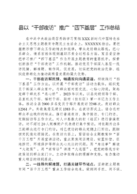 县以干部夜访推广四下基层工作总结在中共中央政治局召开的学习贯彻XXX新时代中国特色社会主义思想主题教育专题民主生活会上,XXXXXX指出,要把握新形势下群众工作的特点和规律,带头走好群众路线,把心系群众、情系百姓体现到履职尽责全过程各方面。X县委坚持把学习推广四下基层作为开展主题教育的重要抓手,探索创新推行干部夜访工作机制,推动党员干部深入基层一线访民情、解难题、转作风、促发展,切实把党的政治优势、组织优势转化为推动高质量发展的强大优势。一、干部夜访解民情,畅通双向沟通渠道。积极践行四下基层工作方法,以开展干部夜访活动为载体,组织党员干部深入群众家中,与群众面对面交流、心贴心沟通,架起党群干群关系连心桥。2023年以来,以县处级领导干部、县直机关干部、镇村干部、驻村(挂社区)第一书记为工作主体,推动全县2000多名党员干部开展夜访2248次,夜访群众12361户,共收集意见建议1383条。在夜访形式上,结合农村群众早出晚归的特点,推行普遍夜访、集中接访、专门约访、定期回访等工作方式,对人口基数大的村(社区)进行普遍夜访,对不超过20人规模的户代表进行集中接访,对长期外出务工的群众进行专门约访,对已夜访的群众定期上门回访,跟踪核实民情处理情况。在夜访内容上,紧密结合主题教育和百千万工程开展宣讲活动,重点聚焦项目建设、安置补偿、征地拆迁、环境保护等群众关心关注的问题,用身边事解读大政策,用家常话讲清大道理,把党的路线方针政策送到群众家门口,主动争取群众的理解和支持,有力推动重大项目的顺利落成。二、一线导向解难题,打通关键环节堵点。坚持把主题教育同百千万工程重点工作结合起来,做到两手抓、两不误、两促进,努力将问题清单转化为成效清单。县处级领导干部以上率下,弘扬四下基层优良作风,围绕调研课题、正反面典型案例和制约高质量发展的问题,靶向发力开展解剖式调研,引领带动全县党员干部深入项目现场、企业车间、田间地头等一线开展调研273次,发现并整改涉重大项目建设、基层治理等方面问题123项。以夜访活动为牵引,县处级领导干部带头直达基层一线了解重大项目推进情况,对存在的问题进行现场办公210次。各级领导干部落实分片包村包户工作制度,深入项目一线集中研究解决群众反映强烈的问题,现场调度督办破解项目建设难点堵点。健全领导干部公开接访、带案下访、入户走访和上门回访制度,组建初心团队+好人队伍两支队伍,推动各级领导干部以及党员、志愿者、乡贤等力量常态化夜访接访,主动听取群众诉求,现场研究解决问题。截至今年1月,累计受理群众信访诉求163起,化解征租地矛盾纠纷120件,化解成功率、群众满意率均达100%。三、精准服务解民忧,完善作用发挥机制。紧扣群众满意不满意评判标准,持续巩固深化主题教育成果,形成一批为民办实事的工作机制,助推重大项目建设。紧盯民生需求、项目推动、落实成效等重点内容,列出问题、任务、效果3张清单,清单化加快推进项目进度。截至今年1月,共梳理出问题清单246项,落实民生实事196项,惠及群众16738人。对夜访中征集到的问题、意见建议建立台账,实行群众点单、夜访党员干部记单、县委党建办派单、责任部门接单的工作模式,限时办结、跟踪问效,形成社情民意收集—处理—反馈工作闭环,让群众呼声快回应、有着落。加快推进200个村(社区)党群服务中心提档升级,完善阵地整体服务功能,推行信心、放心、交心、知心、初心的五心服务机制,组织夜访党员干部为群众提供便民利民、就业创业、法律咨询等点餐式组团快办服务事项1657项,让群众深切感受到服务就在家门,党员干部就在身边,推动民文可居文库——海量学习资料,手机电脑均可下载www.wenkeju.com生清单变为群众幸福账单。文可居文库——海量学习资料,手机电脑均可下载www.wenkeju.com