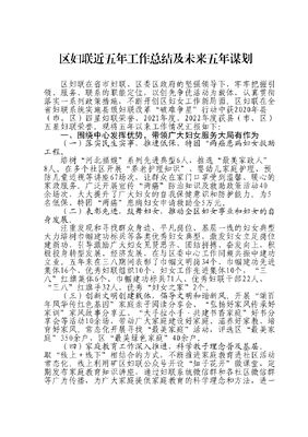 区妇联近五年工作总结及未来五年谋划区妇联在省市妇联、区委区政府的坚强领导下,牢牢把握引领、服务、联系的职能定位,以创先争优活动为载体,认真贯彻落实一系列政策措施,不断开创区妇女工作新局面。区妇联在全省妇联系统实施县级妇联改革破难争星行动中获2020年县(市、区)四星妇联荣誉、2021年度、2022年度获县(市、区)五星妇联荣誉。现将五年以来工作情况汇报如下:一、围绕中心发挥优势,带领广大妇女服务大局有作为(一)落实民生实事,推进低保、特困两癌患病妇女救助工程。培树河北福嫂系列先进典型6人,推选最美家政人8人。在多个社区开展养老护理知识、婴幼儿家庭护理、预防儿童近视等讲座67场次,让群众在家门口享受到温馨、暖心的家政服务。广泛开展宣传两癌防治知识及救助政策活动40余场次,大大提升了广大妇女的自我保健意识和防护能力。为5名低保、特困两癌患病妇女申请救助金5万元。(二)表彰先进,鼓舞妇女,推动全区妇女事业和妇女的自身发展。注重发现和寻找群众身边、平凡岗位、基层一线的妇女典型大力培树巾帼建功标兵等各类优秀妇女典型,激发妇女立足岗位建新功,引导激励广大妇女见贤思齐、团结拼搏、奋发向上,积极投身转型发展、经济发展,在与区委中心工作同频共振中建功立业。五年来在三八期间表彰了巾帼文明岗34个、巾帼建功先进集体16个、优秀妇联组织10个、妇女工作先进集体10个,三八红旗集体6个、巾帼建功标兵71人、优秀妇联干部22人、三八红旗手32人、优秀妇女之家2个。(三)创新文明创建载体,倡导文明和谐新风。开展颂百年风华传红色基因家庭亲子阅读分享会、弘扬好家风传承好家训家风故事分享汇、大手拉小手·共建书香家庭好书分享会等活动10余场,带动广大家庭建设好家庭、涵养好家教、培育好家风。常态化开展寻找最美家庭活动,评选区最美家庭350余户,区最美绿色家庭40余户。(四)家庭教育工作深入推进,科学教子理念普及基层。取线上+线下相结合的方式,不断推进家庭教育进社区活动常态化。线上利用矿区妇联公众号开设知子花开微课堂,定期发布家庭教育知识讲座,通过妇联系统微信群和各社区微信群等广为传播,为广大家庭提供家庭教育的科学理念和方法,进一步强化父母或其他监护人教育能力和责任意识。线下依托各社区家庭教育指导服务站及家长学校开展家庭教育进社区系列讲座、XX大精神宣讲、亲子交流、家庭教育宣传实践活动等700余场次帮助家长解决在教育孩子过程中遇到的各种问题,指导家长科学育儿。(五)为儿童健康成长营造良好氛围。各社区结合实际,利用社区儿童友好家园,开展了巧手剪窗花,笑语迎新年、童心向党快乐成长、童心筑梦共成长,萌娃喜迎XX大、科学小实验、户外运动等200余场次主题特色鲜明益智身心健康的的未成年人教育实践活动,让孩子们在活动中长知识、增智慧强本领。(六)深化美丽庭院创建,助力乡村振兴。累计创建美丽庭院5663户,精品庭院1493户。并命名美丽庭院示范户203户进行典型示范引领,开展以乡镇为单位的村村比观摩评比活动,推动美丽庭院创建在学习交流中形成对比,达到学有样板、创有标杆的效果。二、增强妇联组织活力、推进妇联组织参与社会服务有创新(一)创新帮扶形式,深入细致、倾心倾力为妇女儿童办实事。搭建爱心平台,凝聚社会力量共同传递温暖和爱,牵线搭桥市爱心人士先后结对我区42名困境儿童,在春节、三八妇女节、母亲节等时间节点联合社会组织、区直有关部门等开展走访慰问活动,将党和政府的温暖送到困境妇女儿童身边,五年来共慰问妇女儿童520余人次。(二)创新活动载体,在参与社会服务中进一步做好新形势下妇女群众工作。一是推进破难行动,拓宽组织覆盖。延伸触角拓展四新领域组织建设,引导润康医养中心、孵化基地等81个四新建立妇联。开展基层妇联领头雁培训10期,内容涵盖党的XX大精神、党史学习教育、妇联业务知识解读及妇女工作相关法律法规等。积极推进全区机关事业单位会改联工作,全区条件成熟的35个机关事业单位完成妇委会改建妇联。在妇女自建组织以及兴趣小组、妇联执委家中或工作场所等建立妇女微家302个,妇女微家结合各自特点开展政策宣讲、才艺展演、手工技艺教学等多种活动,加强对妇女的思想政治引领。三、立足源头履行职责,维护妇女儿童权益有举措(一)维护妇女权益当好娘家人。区妇联一直采取有效措施,立足源头,履行职责,进一步深化妇女法制宣传教育,在妇女维权服务工作上下功夫,关注妇女民生。按时间节点开展三八妇女维权周活动,开展宪法宣传、民法典宣传、防艾宣传等,联合区检察院等部门开展木兰有约法治宣讲活动20余场次,促进基层妇女群众维权意识和综合素质的提高。(二)整合资源,开展常态化摸排。由社区妇联主席、妇女小组长等组成巾帼